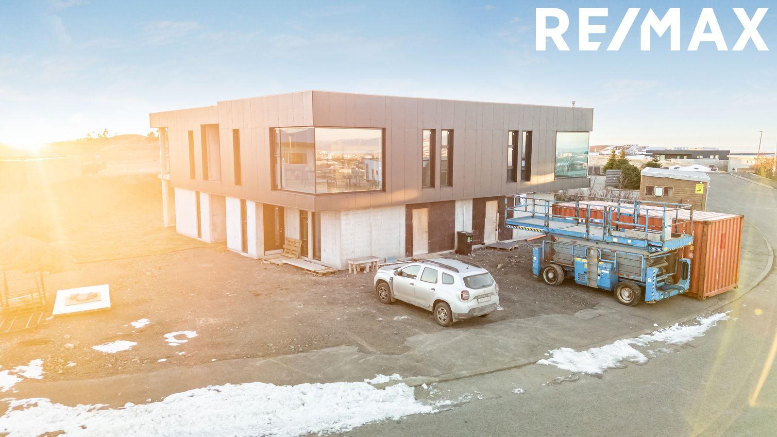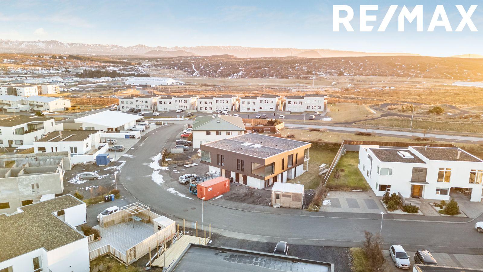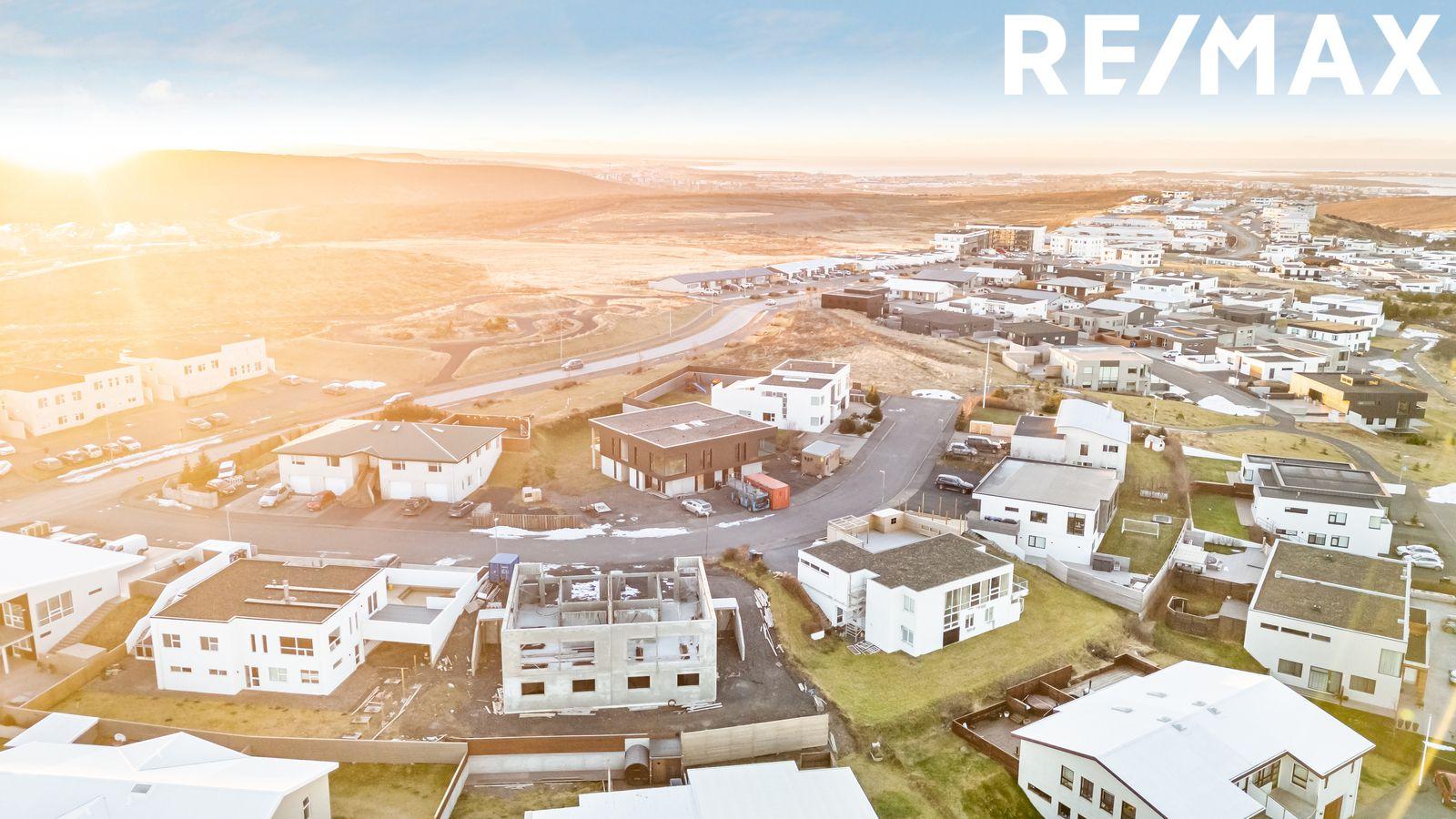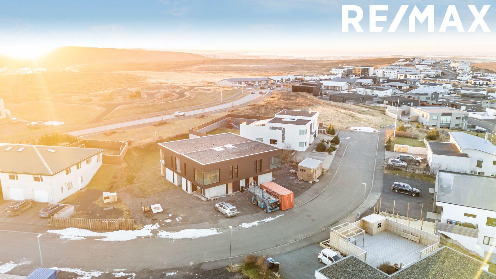 Á skyggni á framhlið og á svölum verður sett steinull og klæðning sem verður svört Japanese wood. Samkvæmt teikningu skiptist neðri hæð í forstofu, gang með útgönguhurð, þvottahús, 3 svefnherbergi, baðherbergi með útgönguhurð til suðurs þar sem gert verður ráð fyrir heitum potti og innbyggður rúmgóður bílskúr með geymslu inn af. Á efri hæð skiptist húsið í eldhús/borðstofu þar sem gert er ráð fyrir eldhúseyju, stór rennihurð út á stórar 21,9 m2 suður svalir með hitalögnum í svalagólfinu ásamt gönguhurð úr eldhúsi, stofu með glæsilegum stórum útsýnis hornglugga án gluggapósta til að útsýnið njóti sín óskert. Gert er ráð fyrir arni í stofu, aðrar svalir úr holi beint á móti stiga, fljótandi stigi er á milli hæða sem kaupandi sér um að klára og flota stigapall í rétta hæð.