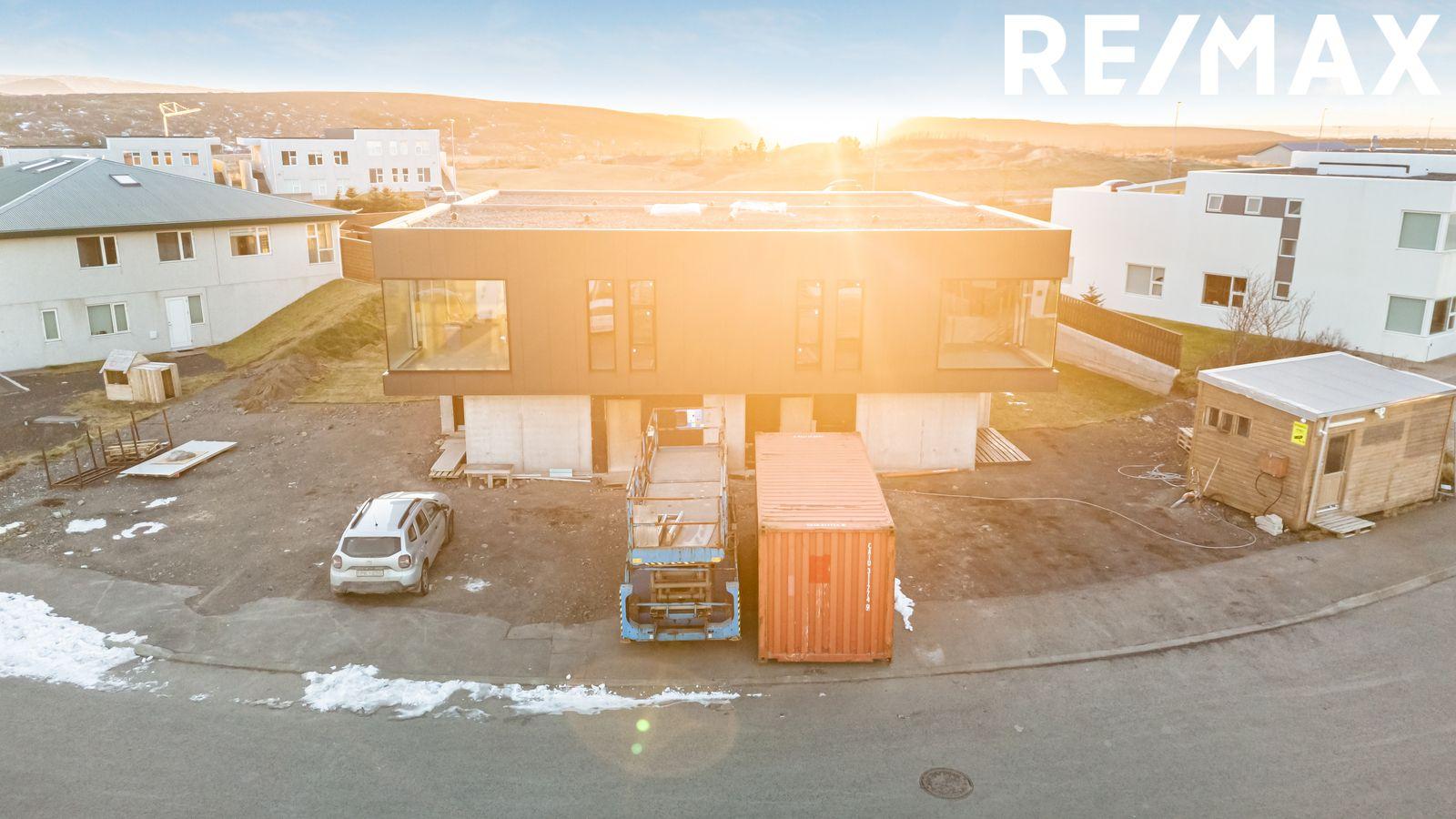 Húsið skilast skráð á byggingarstigi B2 en er lengra komið og er nánast komið á B3 (tilbúið til innréttinga). Búið er að setja upp alla milliveggi á jarðhæð og mála nema inn á salerni og þvottahúsi þar sem kaupandi mun sjá um að setja upp blöndunartæki, tengja og klára frárennsli eftir því sem við á. Búið er að setja upp milliveggi í hjónasvítu á efri hæðinni en kaupandi mun sjá um að setja blöndunartæki og tengja frárennsli á baðherbergi. Gólf verða þurrslípuð en á eftir að ganga frá í rétta hæð og rykbinda. Gólfhiti kominn á neðri hæð og búið að tengja í hitagrind. Kaupandi sér sjálfur um að klára gólfhita fyrir efri hæð en búið er að leggja lagnir í svalir á efri hæð.