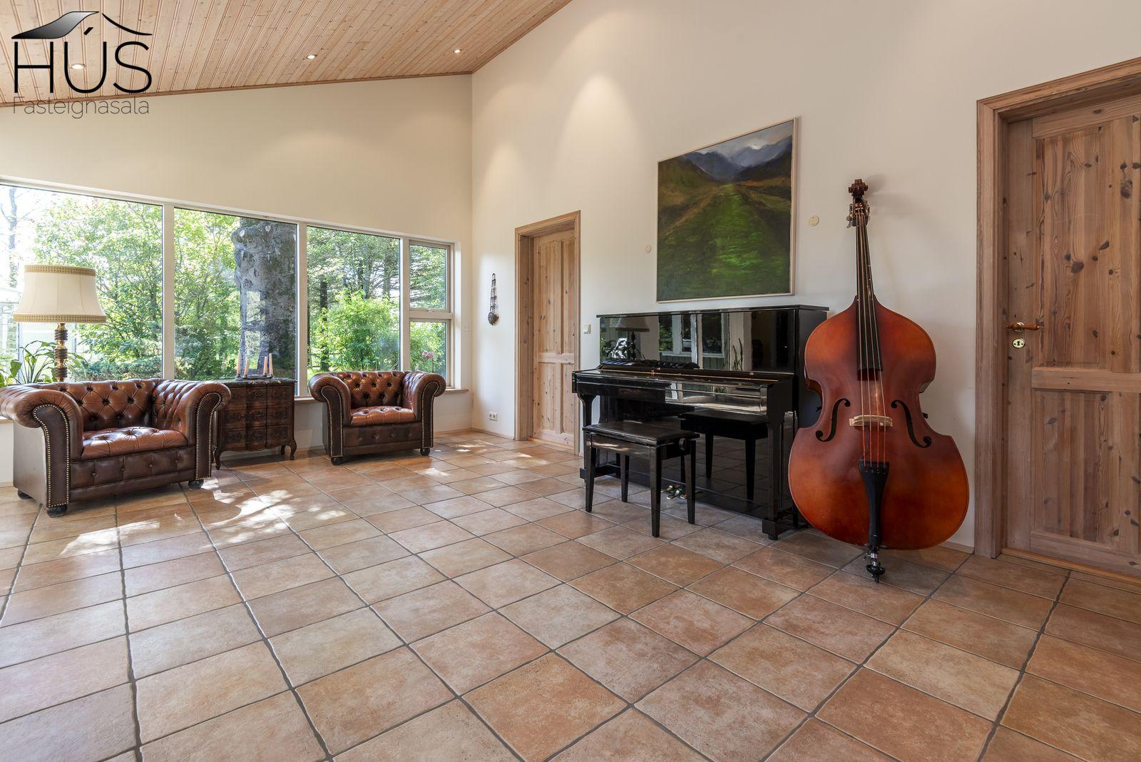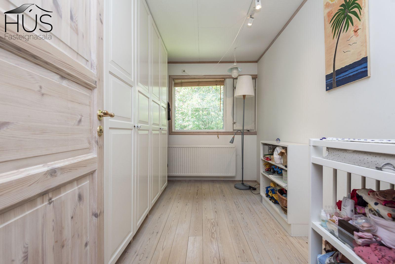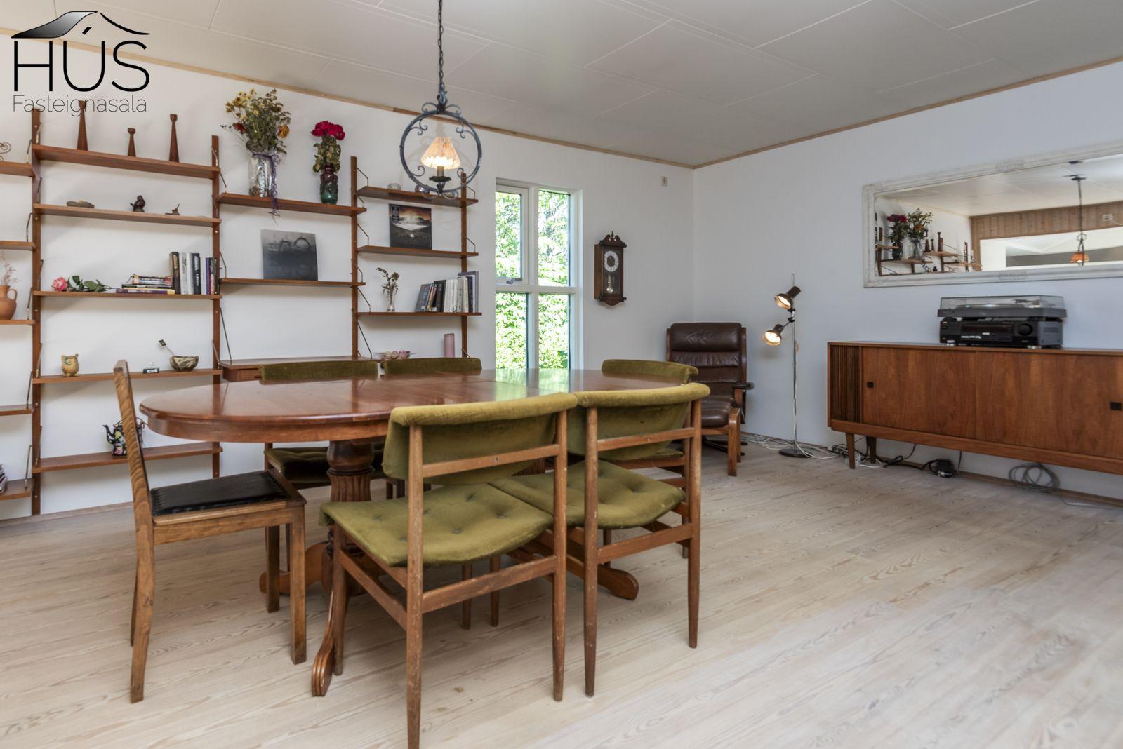 Viðbygging. Mjög bjart og skemmilega hannað rými með uppteknum loftum með hvíttuðum panel. Stór stofa, rennihurð út á sólpall. Kamína í horni stofunnar. Tvö góð svefnherbergi, annað þeirra með hurð út á sólpall.