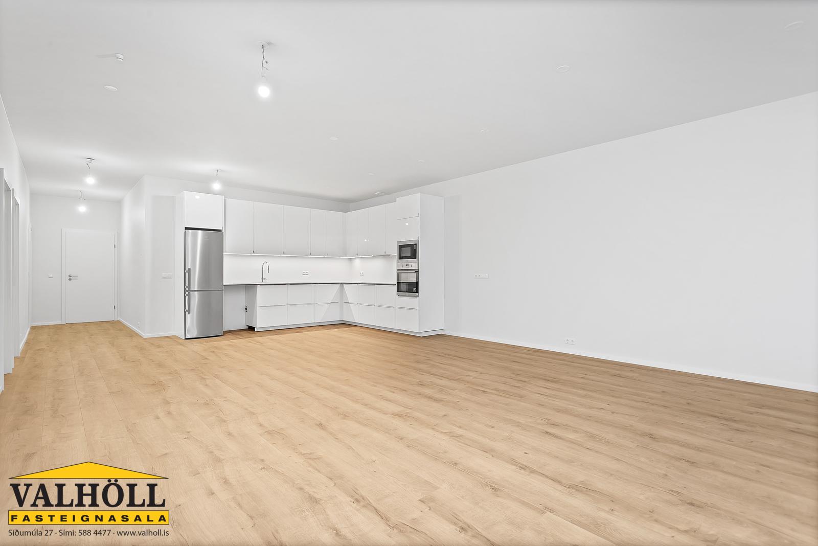 Stofa / borðstofa: opið rými með eldhúsi og stofu með parketi á gólfi.