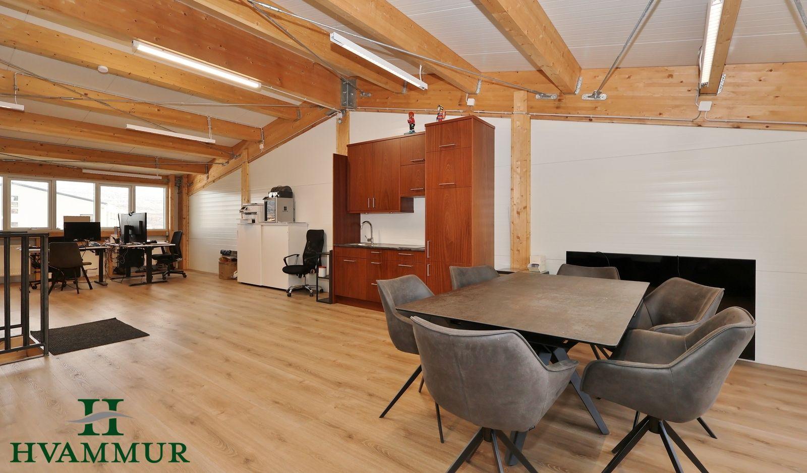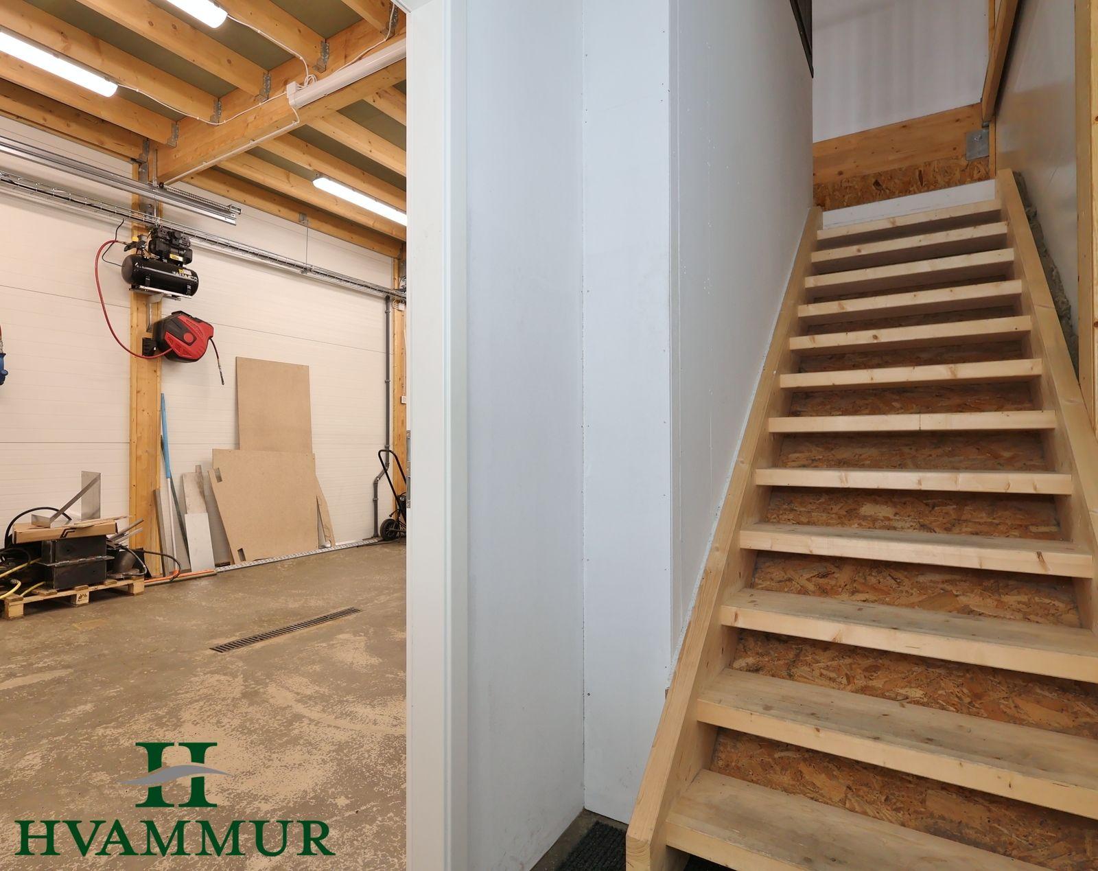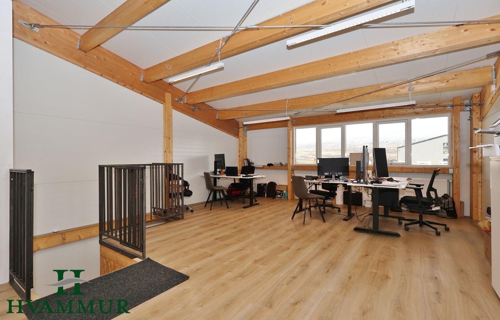 Góður timbur stigi er á milli hæða. Snyrting er undir stiga á neðri hæðinni með upphengdu wc, handlaug og hvítum neðri skáp. Efri hæðin skiptist í snyrtingu og opið rými með góðum gluggum til tveggja átta og hurð út á svalir. Vínyl parket er á gólfum og spónlögð kaffistofuinnrétting. Vönduð lýsing í loftum.