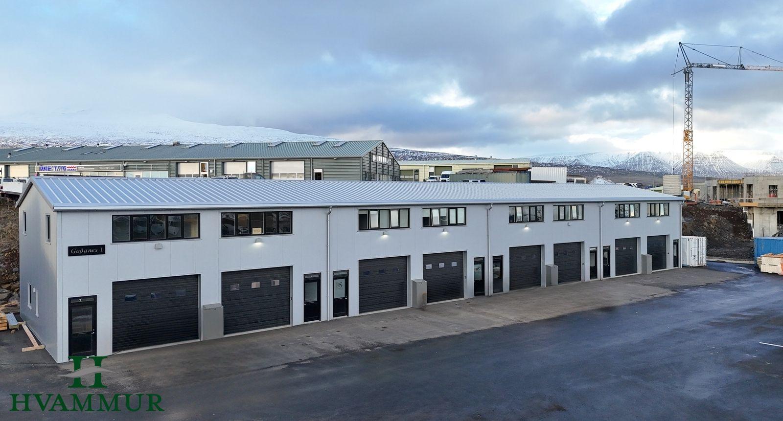 Nýlegt (2024) geymsluhúsnæði á tveimur hæðum við Goðanes 1b á Akureyri - 143,4 m² að stærð Húsið er límtréshús og klætt með steinullareiningum, bæði veggir og þak og skiptist í 8 eignarhluta. Lóðin er leigulóð í eigu Akureyrarbæjar, 4.049,1 m² að stærð.