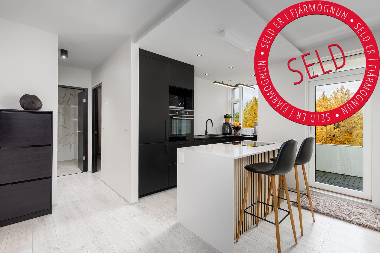 Íbúðin var tekin í gegn 2022: Eldhús: Veggur milli stofu og eldhúss tekinn niður. Nýjar innréttingar, blöndunartæki og raftæki, eldhúseyja sett upp með steini frá Rein. Innbyggður ísskápur og uppþvottavél, innfelldir kastarar og hangandi ljós yfir eyju.