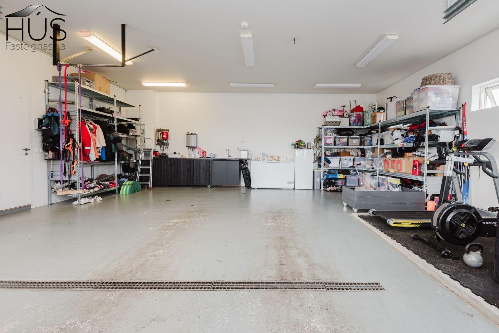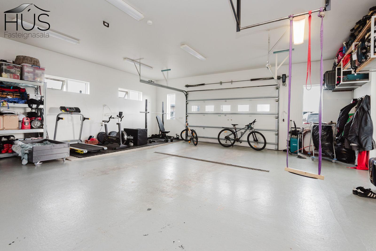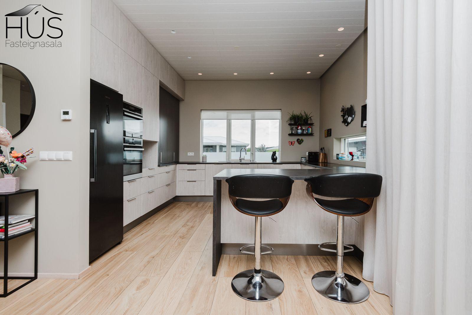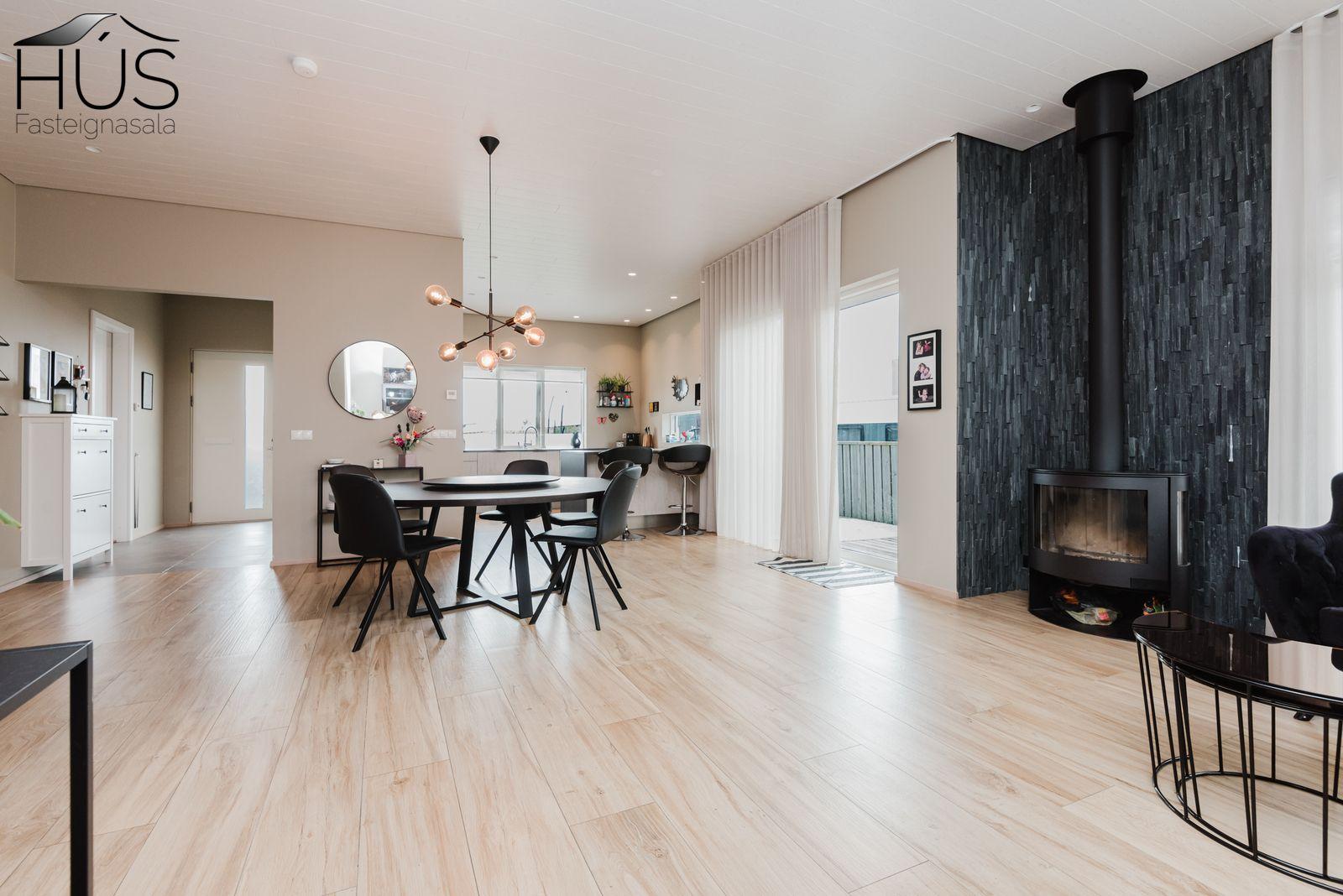 Flísalögð forstofa með stórum fataskáp sem nær til lofts. Fjögur rúmgóð svefnherbergi eru í húsinu og inn af hjónaherbergi er fataherbergi með góðri innréttingu. Rúmgott sjónvarpshol. Gangur sem hægt er að loka af með rennihurð og innst á honum er hljóðveggur. Bjart og stílhreint eldhús með góðri innréttingu með miklu skápa- og skúffuplássi. Í eldhúsi er veggföst eyja sem hægt er að sitja við á barstólum. Í stóru og opnu rými við eldhús er borðstofa og stofa þar sem m.a. er útgengt á sólpall. Í stofu er arinn. Snyrtilegt baðherbergi með innréttingu, upphengdu wc, baðkari, og "walk in" sturtu með glervegg. Annað gestasalerni er við forstofu. Þvottahús með innréttingu sem gerir ráð fyrir þvottavél/þurrkara í vinnuhæð og úr því er gönguhurð út á baklóð. Innangengt er í mjög rúmgóðan bílskúr með góðri lýsingu og stórri innkeyrsluhurð. Á gólfum eru annars vegar ljósar flísar á votrýmum en hins vegar parketflísar. Niðurtekin loft eru í húsinu sem er með aukna lofthæð og loftaþyljur í loftum. Digital stýringar fyrir gólfhita.