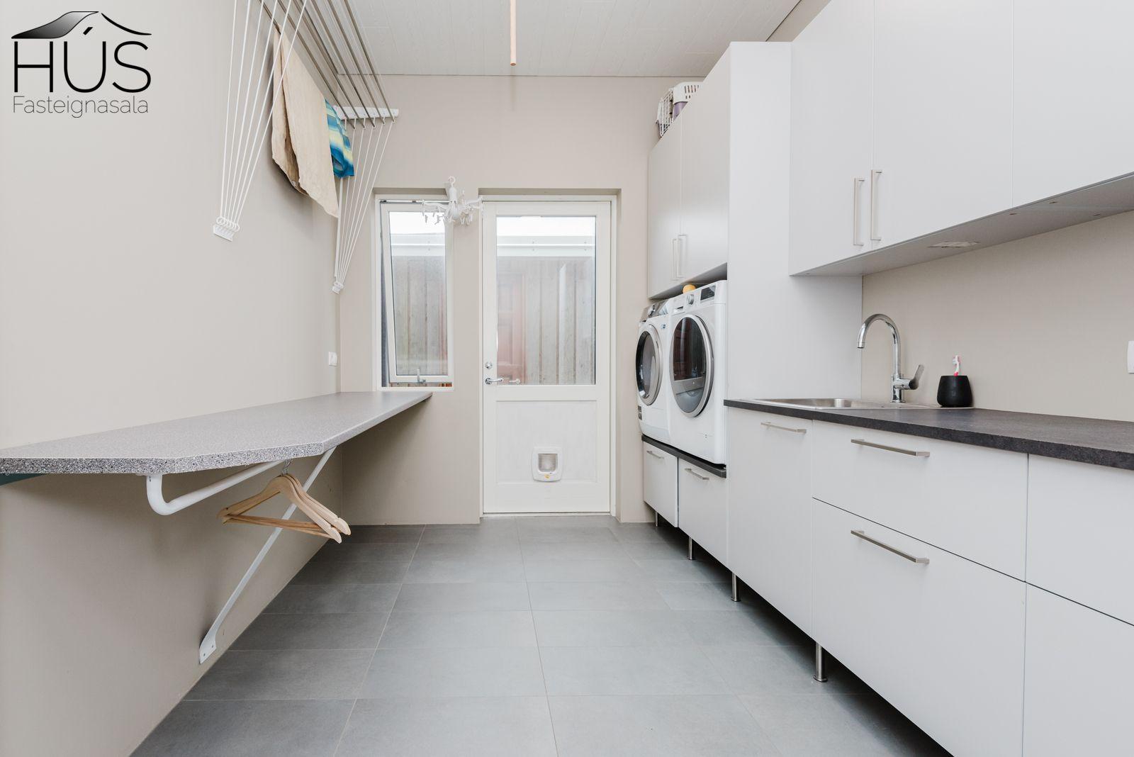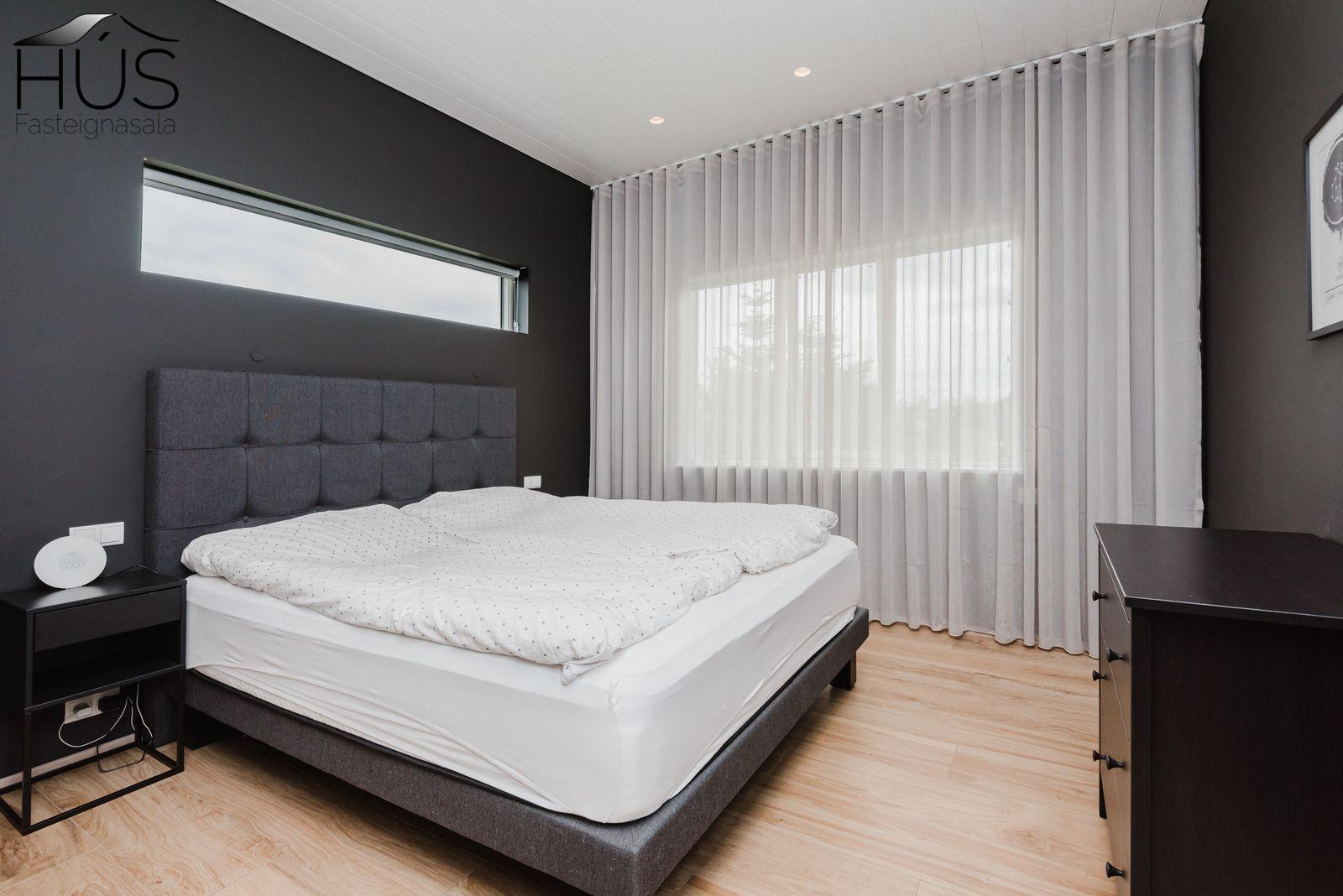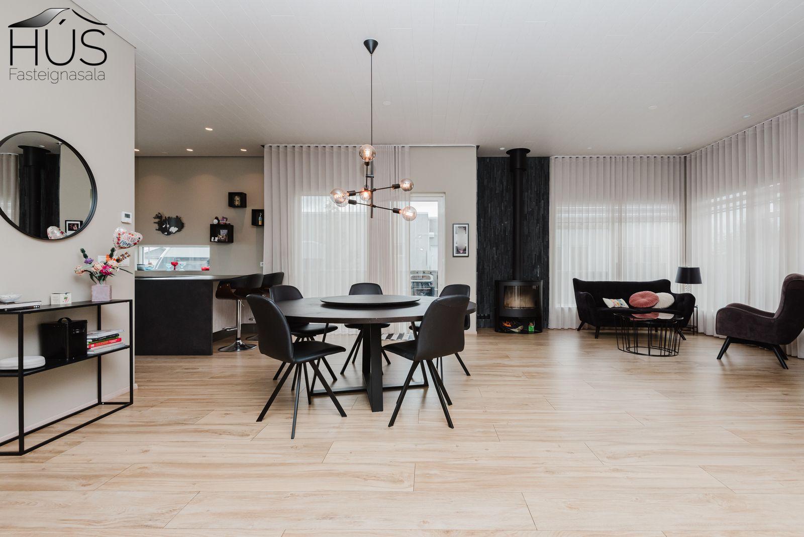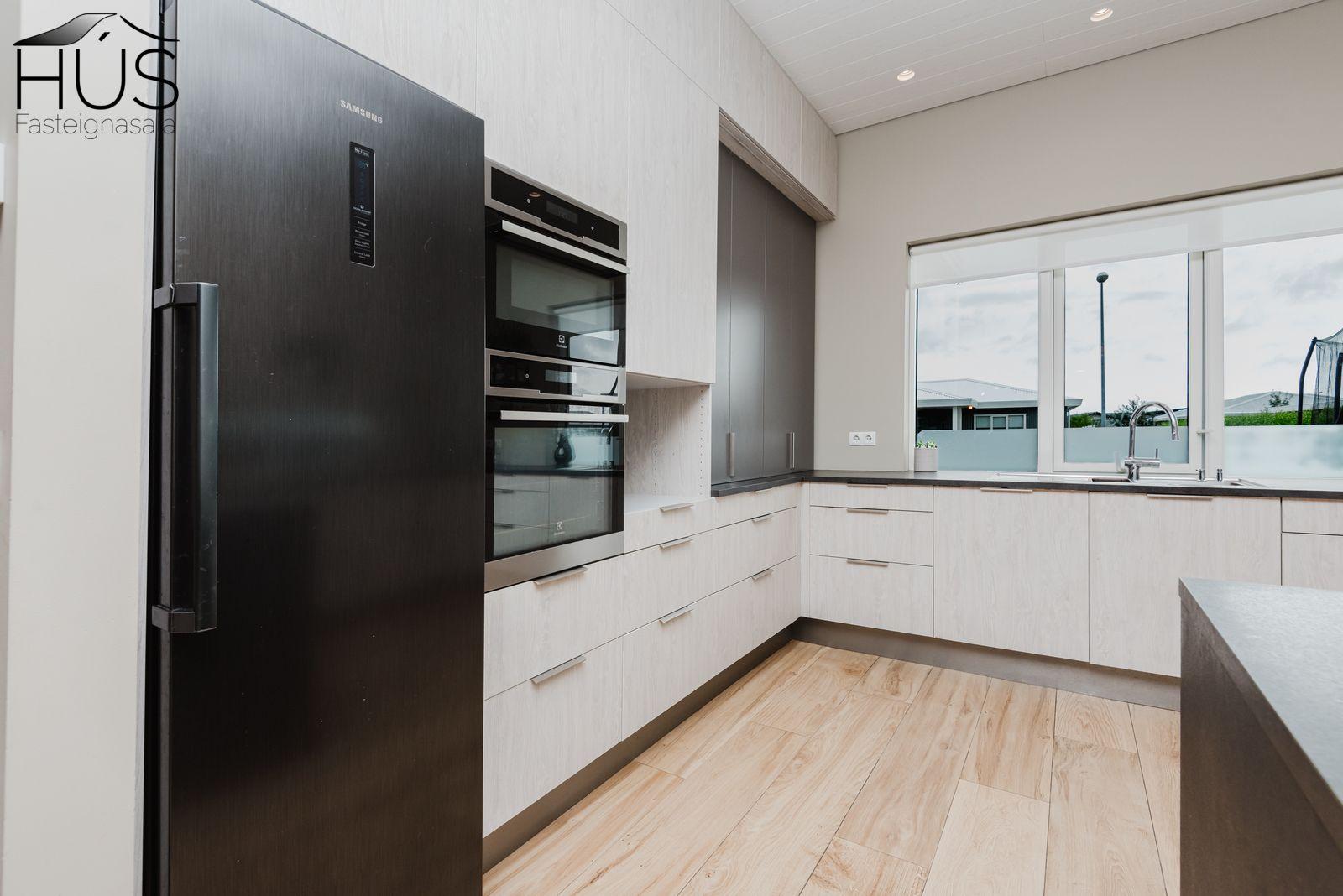 Flísalögð forstofa með stórum fataskáp sem nær til lofts. Fjögur rúmgóð svefnherbergi eru í húsinu og inn af hjónaherbergi er fataherbergi með góðri innréttingu. Rúmgott sjónvarpshol. Gangur sem hægt er að loka af með rennihurð og innst á honum er hljóðveggur. Bjart og stílhreint eldhús með góðri innréttingu með miklu skápa- og skúffuplássi. Í eldhúsi er veggföst eyja sem hægt er að sitja við á barstólum. Í stóru og opnu rými við eldhús er borðstofa og stofa þar sem m.a. er útgengt á sólpall. Í stofu er arinn. Snyrtilegt baðherbergi með innréttingu, upphengdu wc, baðkari, og "walk in" sturtu með glervegg. Annað gestasalerni er við forstofu. Þvottahús með innréttingu sem gerir ráð fyrir þvottavél/þurrkara í vinnuhæð og úr því er gönguhurð út á baklóð. Innangengt er í mjög rúmgóðan bílskúr með góðri lýsingu og stórri innkeyrsluhurð. Á gólfum eru annars vegar ljósar flísar á votrýmum en hins vegar parketflísar. Niðurtekin loft eru í húsinu sem er með aukna lofthæð og loftaþyljur í loftum. Digital stýringar fyrir gólfhita.