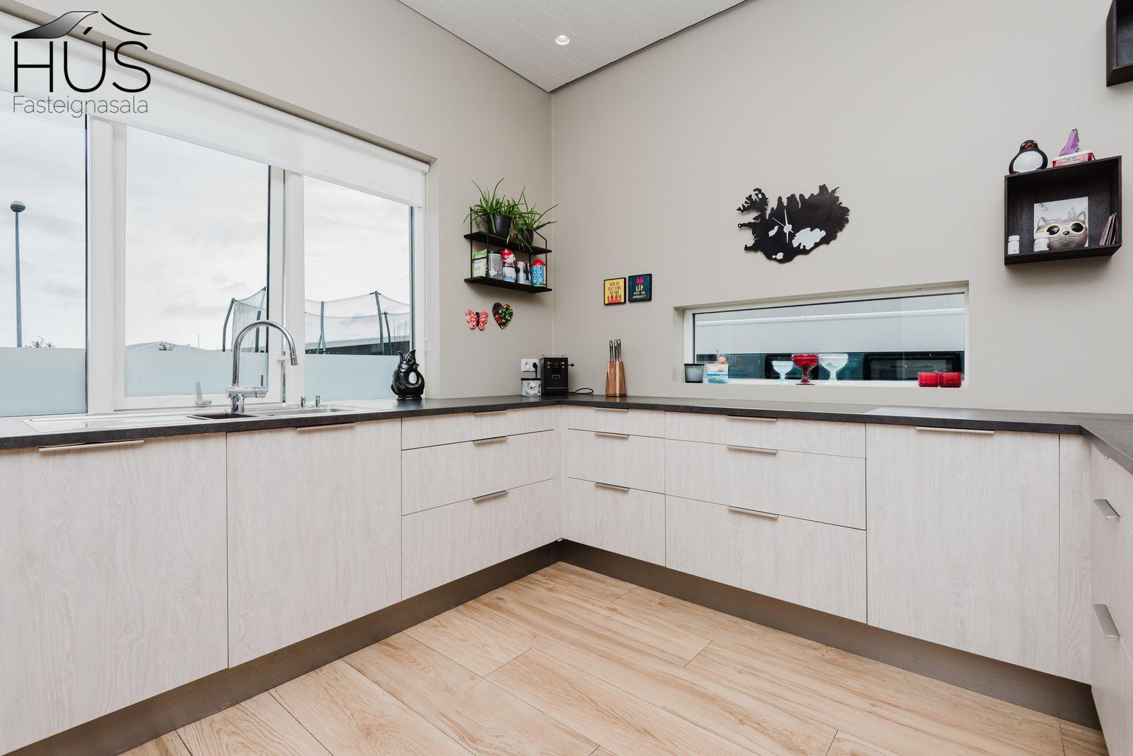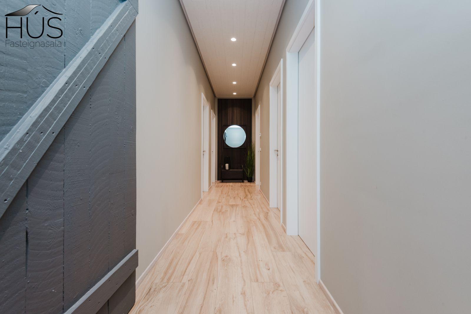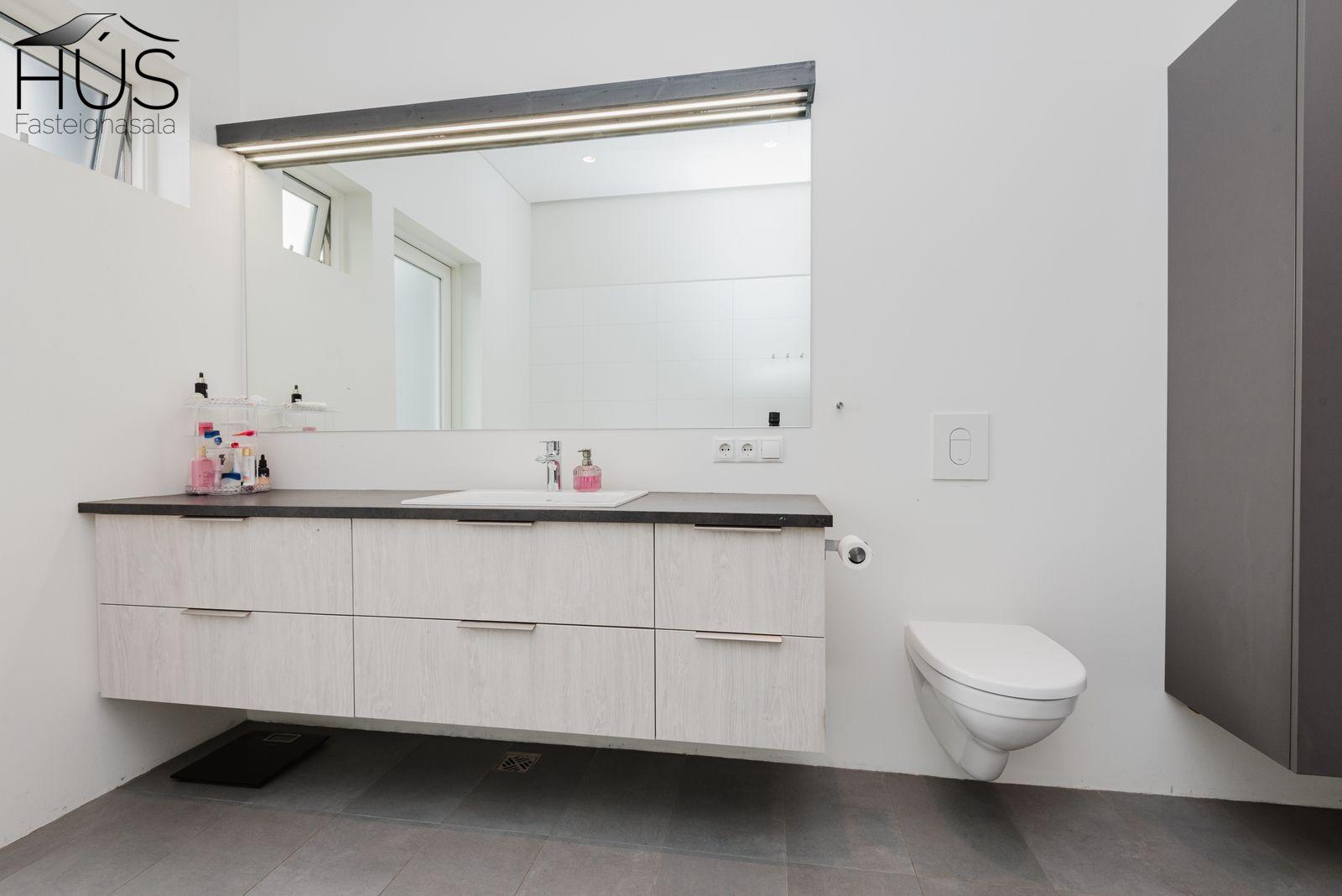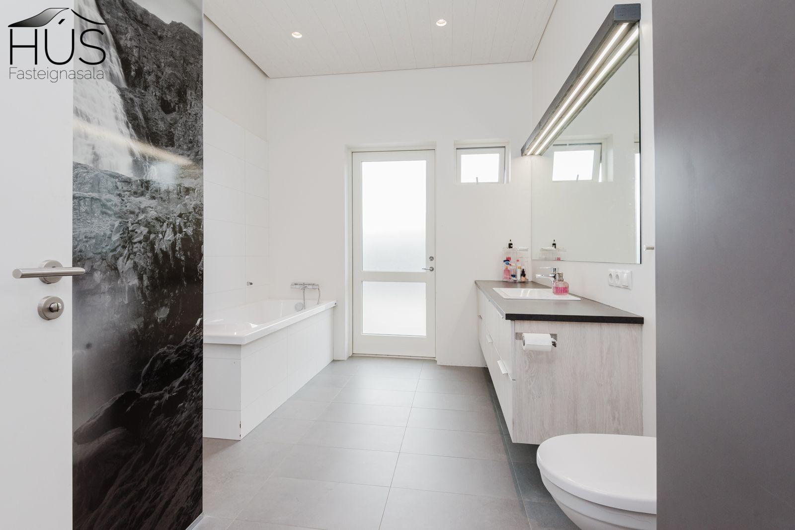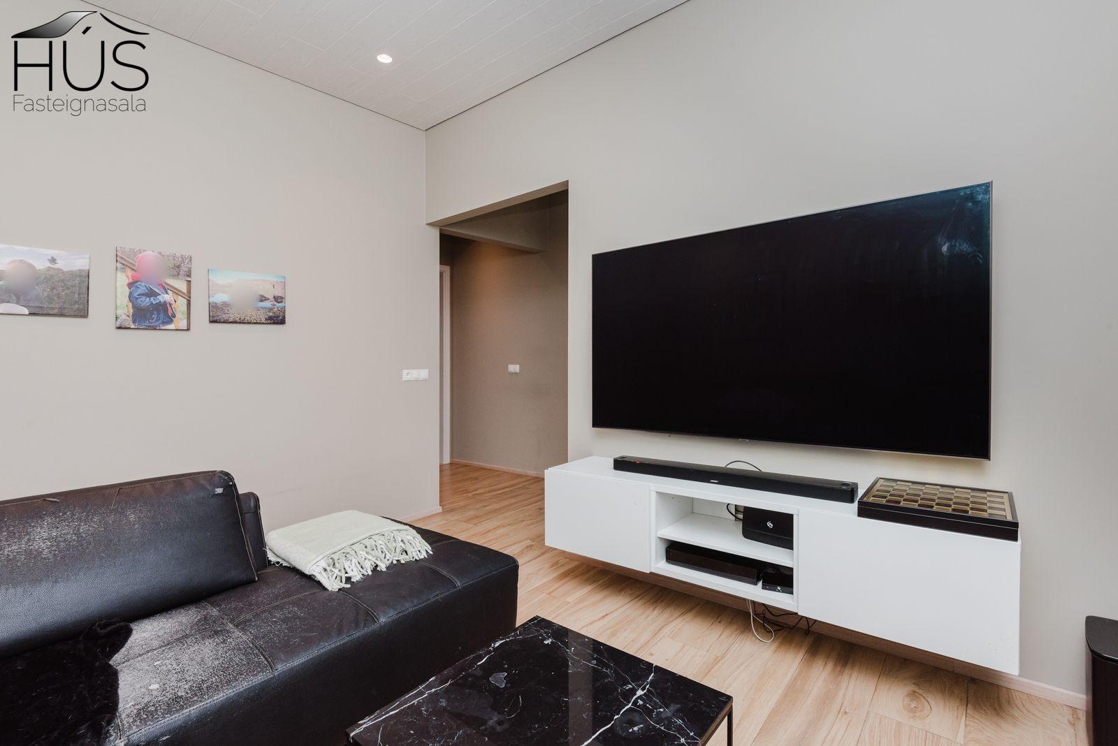 Flísalögð forstofa með stórum fataskáp sem nær til lofts. Fjögur rúmgóð svefnherbergi eru í húsinu og inn af hjónaherbergi er fataherbergi með góðri innréttingu. Rúmgott sjónvarpshol. Gangur sem hægt er að loka af með rennihurð og innst á honum er hljóðveggur. Bjart og stílhreint eldhús með góðri innréttingu með miklu skápa- og skúffuplássi. Í eldhúsi er veggföst eyja sem hægt er að sitja við á barstólum. Í stóru og opnu rými við eldhús er borðstofa og stofa þar sem m.a. er útgengt á sólpall. Í stofu er arinn. Snyrtilegt baðherbergi með innréttingu, upphengdu wc, baðkari, og "walk in" sturtu með glervegg. Annað gestasalerni er við forstofu. Þvottahús með innréttingu sem gerir ráð fyrir þvottavél/þurrkara í vinnuhæð og úr því er gönguhurð út á baklóð. Innangengt er í mjög rúmgóðan bílskúr með góðri lýsingu og stórri innkeyrsluhurð. Á gólfum eru annars vegar ljósar flísar á votrýmum en hins vegar parketflísar. Niðurtekin loft eru í húsinu sem er með aukna lofthæð og loftaþyljur í loftum. Digital stýringar fyrir gólfhita.