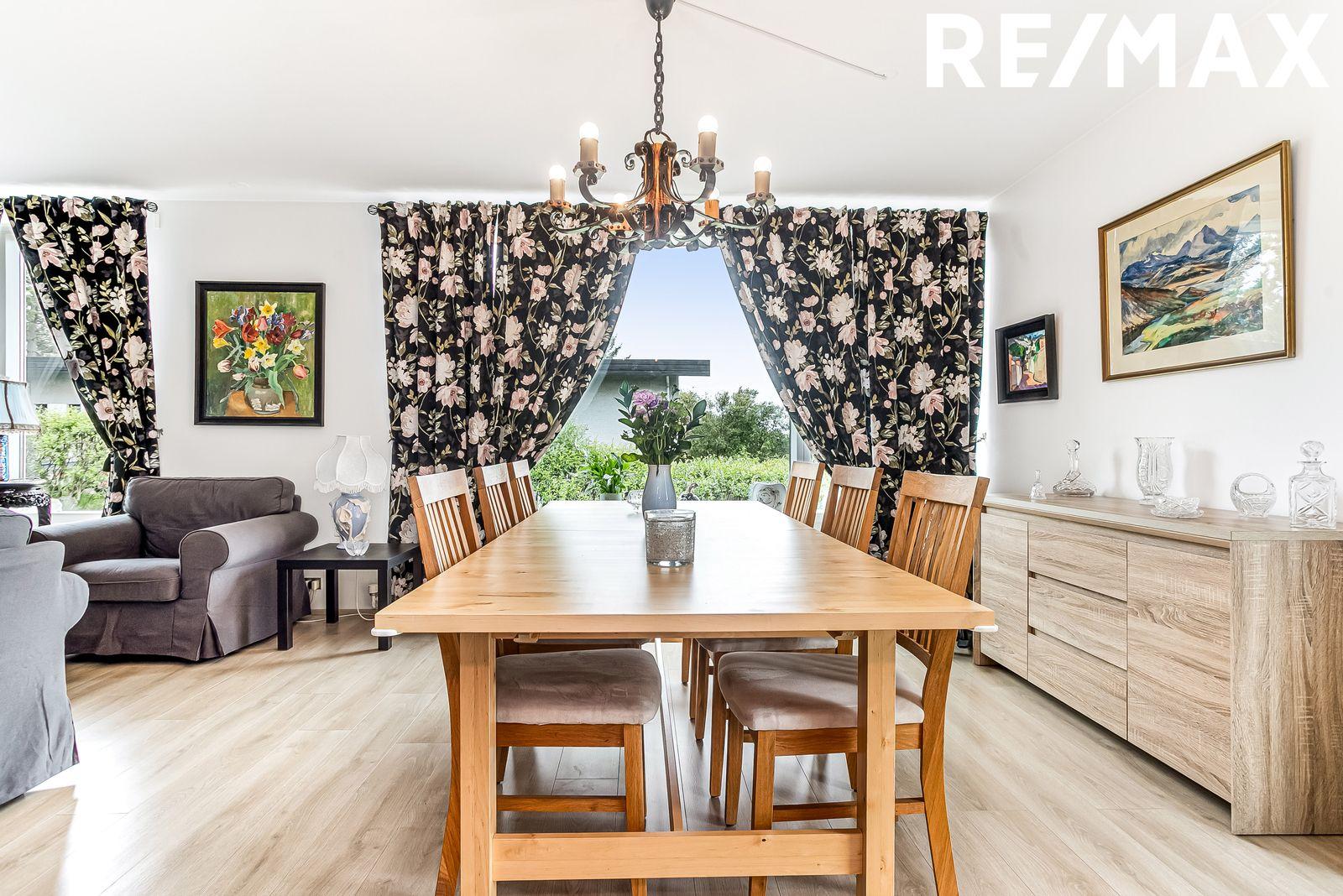 Íbúðin á efri hæð hússins er 143,4 fm íbúð og skiptist í: 4,1 fm flísalagt anddyri með skápum. Frá anddyri er aðgengi í 7 fm geymslu og þvottaherbergi og þaðan er aðgengi út á timburverönd á lóðinni. 6,2 fm gangur með aðgengi í stofu til vinstri og með aðgengi í herbergi til hægri. Stofan er 27,9 fm og borðstofan er 14,7 fm. Frá borðstofu er aðgengi í rúmt eldhúsrými, 16,8 fm með innréttingu og eldhúsborði. Svefnherbergin eru þrjú, tvö stór, rúmlega 13 fm og eitt minna, 6 fm. Innbyggður skápur er í hjónaherbergi. Nýlegt parket er flæðandi á gólfum nema í herbergjum þar sem er korkur eða dúkur á gólfum. Baðherbergi er flísalagt með upphengdu salerni, sturtu, vaski með innréttingu og hillum. Þá fylgja íbúðinni 6 fm svalir og um 29 fm bílskúr. Einnig er í lóðinni skúr með útisvæði. Þá er á lóðinni sólpallur við hlið bílskúrs með 180 cm háum skjólvegg þar sem hægt er að hafa húsgögn, grill og tilheyrandi. Staðsetning er góð þar sem stutt er í ýmsa verslun s.s. Mjóddina og Smáralind. Skólar og íþróttasvæði ÍR er einnig í næsta nágreinni. Fyrirhugað fasteignamat 2026 er 104.050.000. Nánari upplýsingar veitir Þorsteinn Ólafs lögg. fasteignasali í síma 842-2212, to@remax.is.