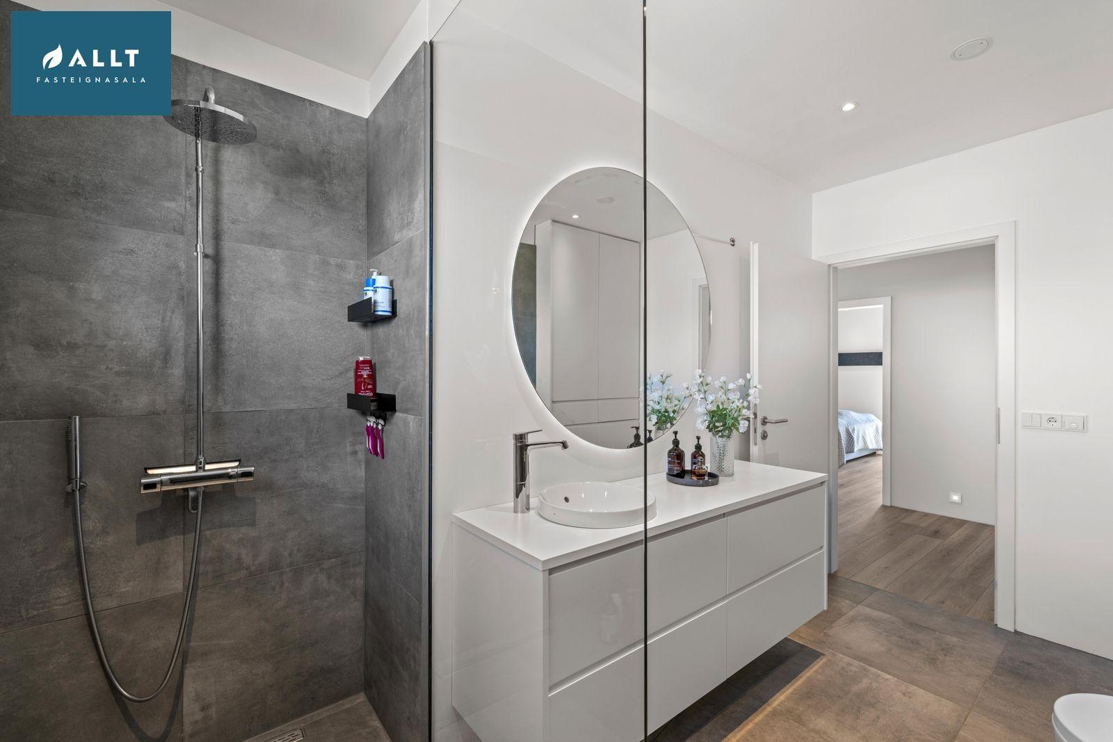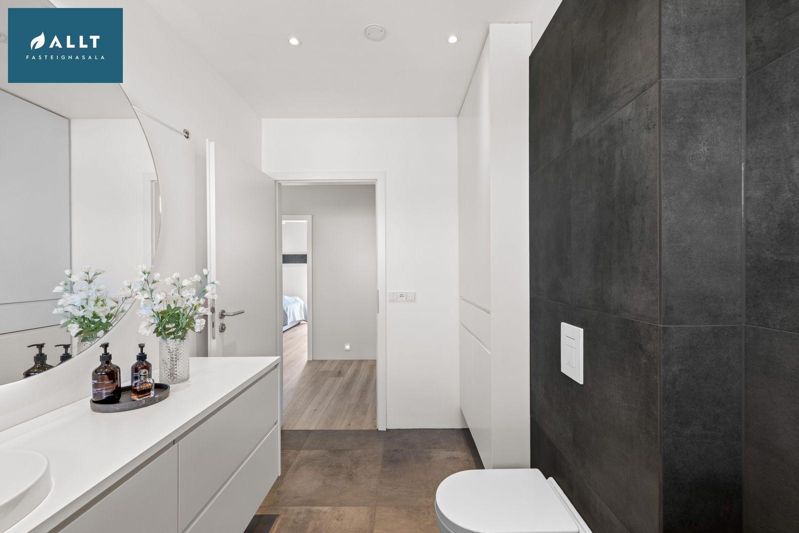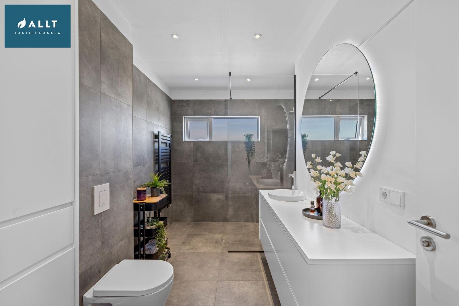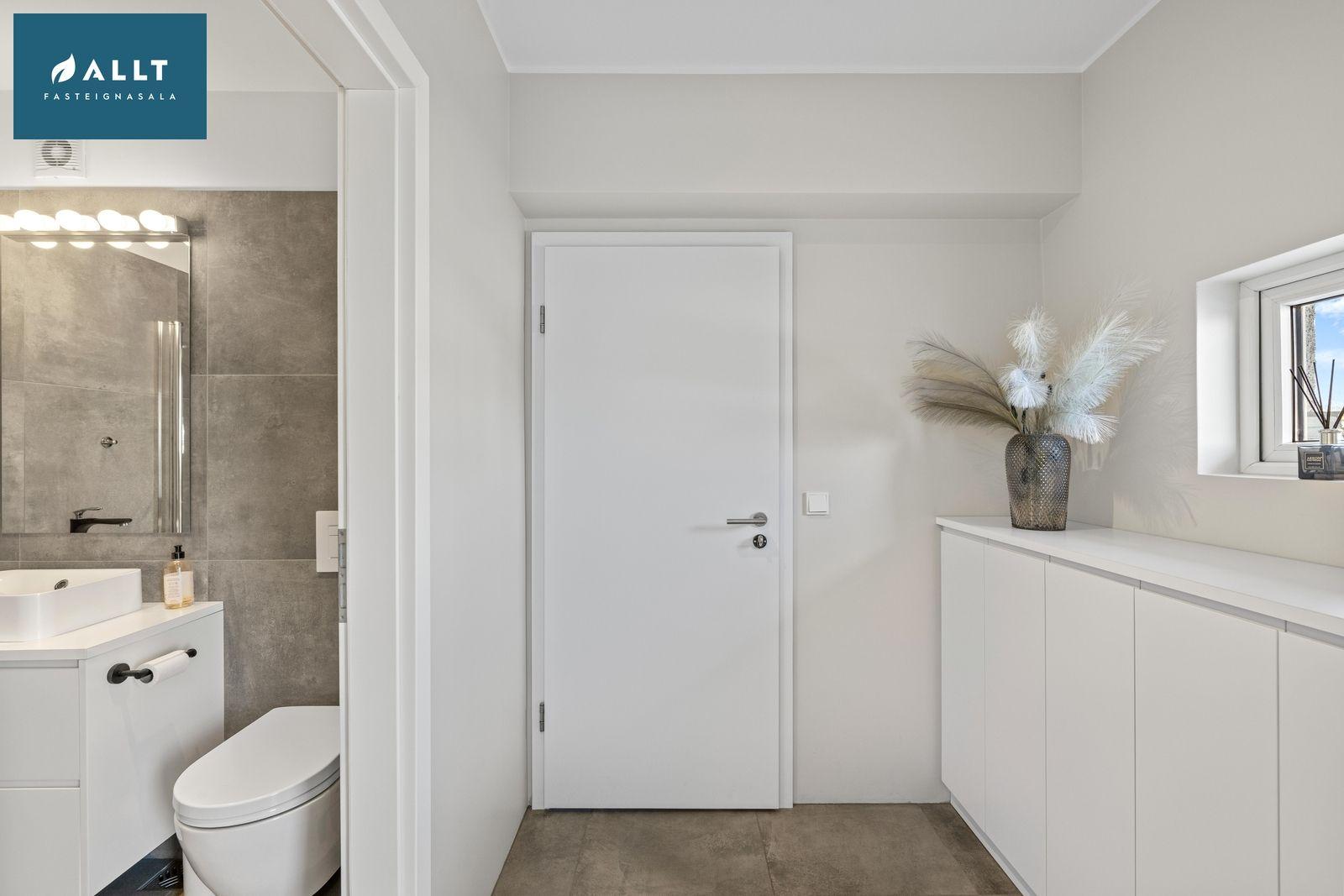 Baðherbergi: Flísalagt með Walk in sturtu, upphengt klósett, hvít innrétting með vask og hvítri borðplötu og stór hvít innrétting alveg upp í loft með góðu skápaplássi.