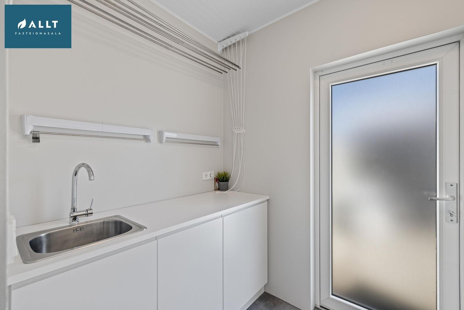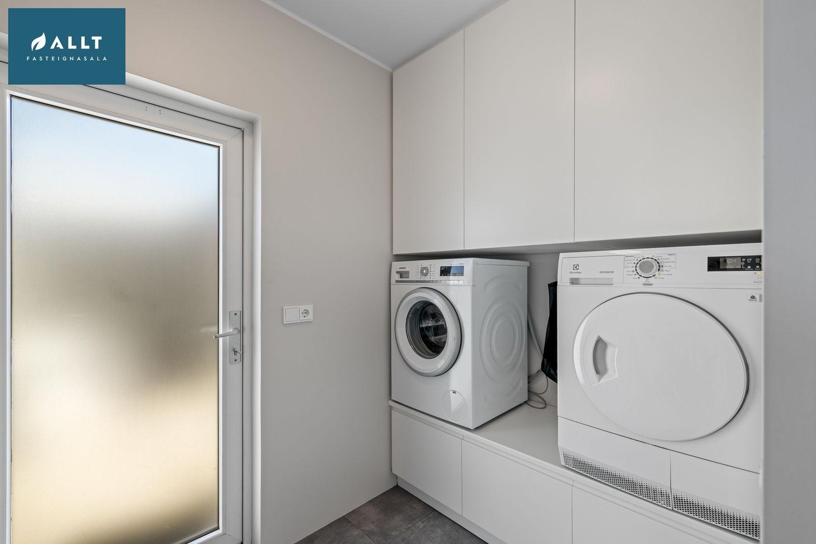 Þvottahús: Flísalagt, hvít innrétting fyrir þvottavél og þurrkara í vinnuhæð og hvít innrétting á móti með góðu vinnuborði og vask.