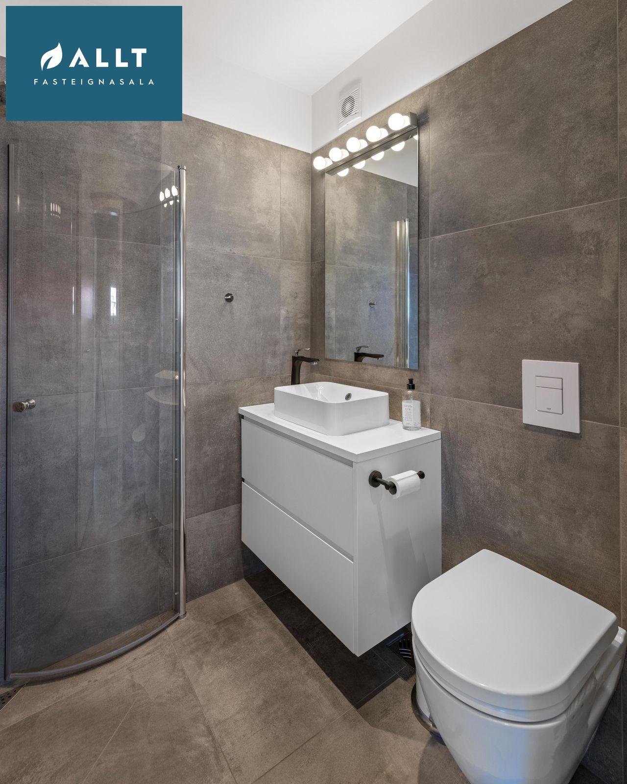 Baðherbergi: Flísalagt í hólf og gólf, hvít innrétting, vaskur, upphengt klósett og sturta.