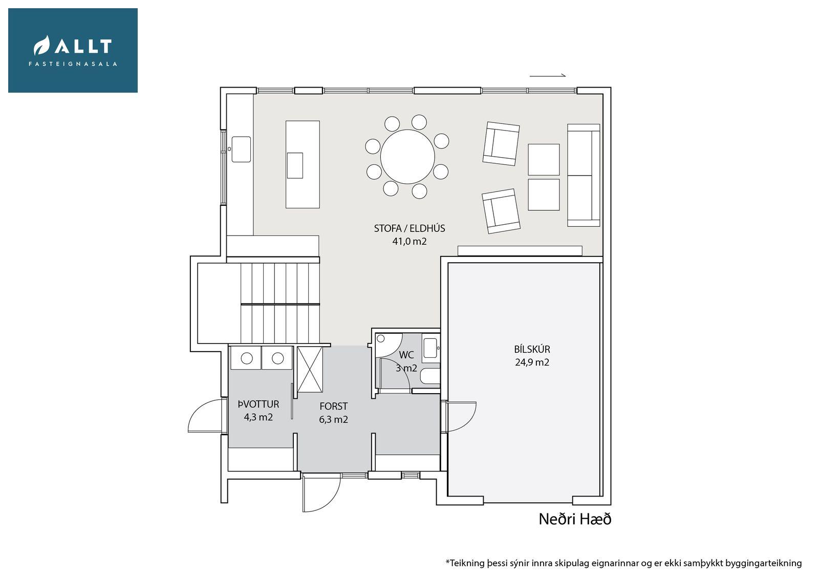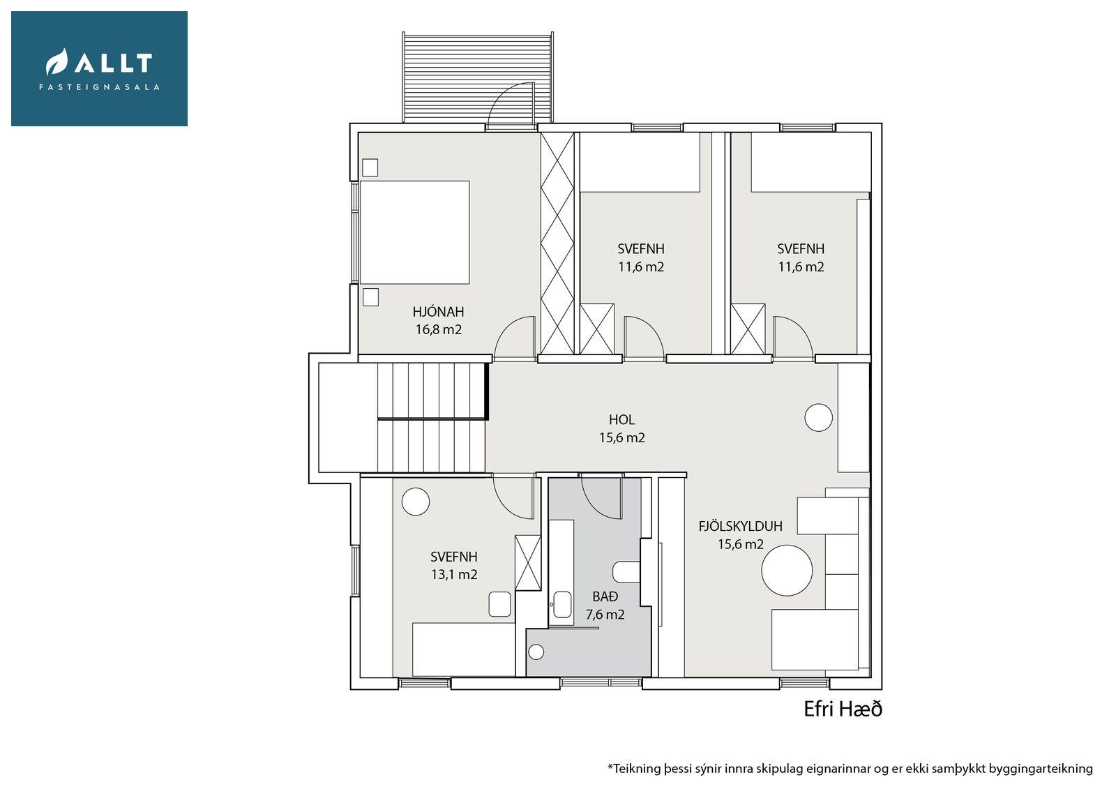 Skoðunar- og aðgæsluskylda kaupanda:Í lögum um fasteignakaup nr. 40/2002 er kveðið á um ríka skoðunarskyldu kaupenda á fasteignum. ALLT fasteignasala vill beina því til væntanlegs kaupanda að kynna sér ástand fasteignar vel við skoðun og fyrir tilboðsgerð. Ef þurfa þykir er ráðlagt að leita til sérfræðifróðra aðila. Forsendur söluyfirlits: Söluyfirlit þetta er samið af fasteignasala til samræmis við lög um sölu fasteigna og skipa nr. 70/2015. Upplýsingar þær sem koma fram í söluyfirliti þessu eru sóttar í opinberar skrár, frá seljanda og eftir atvikum til húsfélags. Seljandi veitir upplýsingar um eignina til samræmis við upplýsingaskyldu sína sbr. lög um fasteignakaup nr. 40/2002. Fasteignasali sannreynir að upplýsingar séu réttar með sjónskoðun á eigninni. Fasteignasali getur ekki fullyrt um ástand og eiginleika þeirra hluta fasteignar sem ekki eru aðgengilegir og sjást ekki með berum augum, eins og t.d. lagnir, dren, skólp og þak.