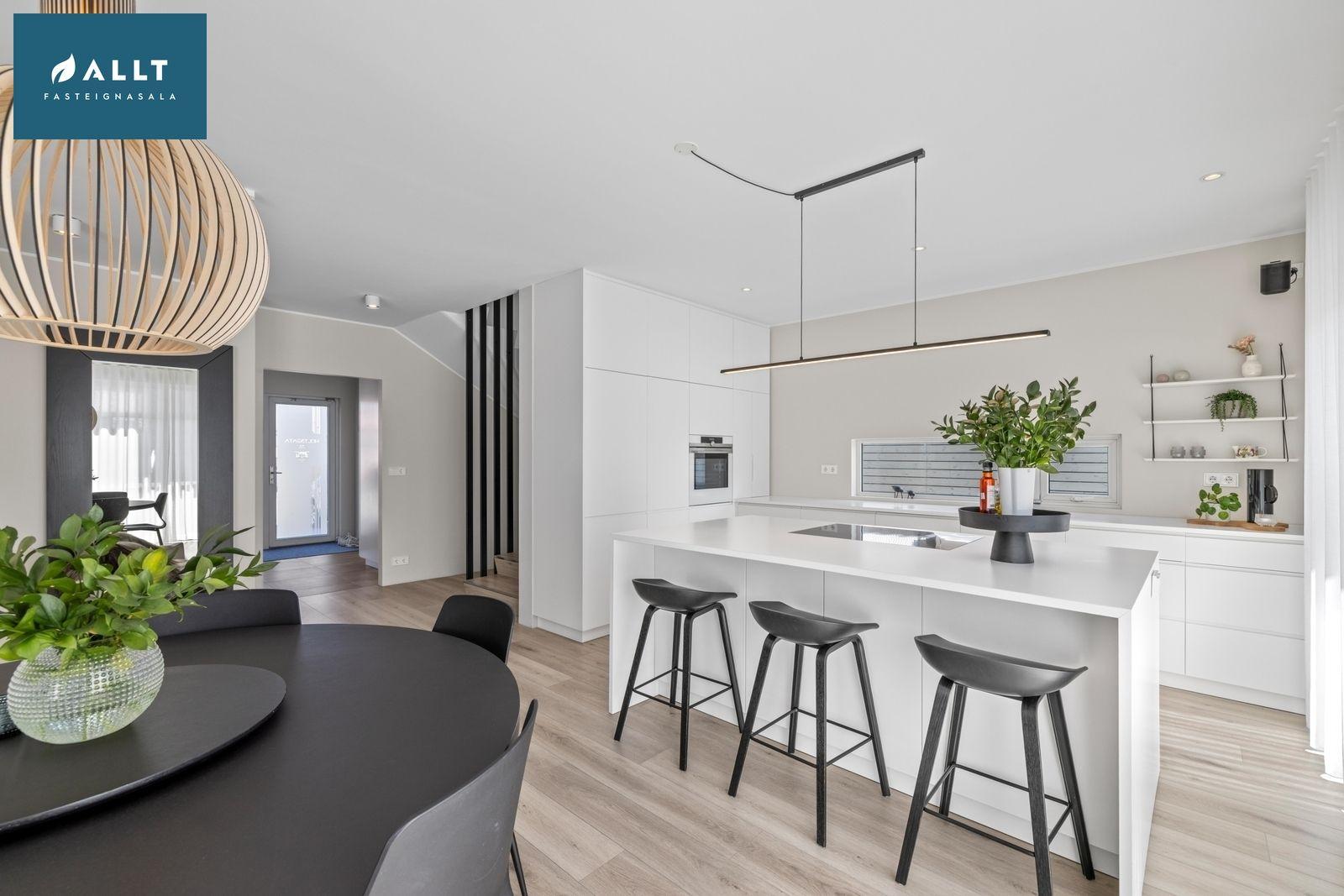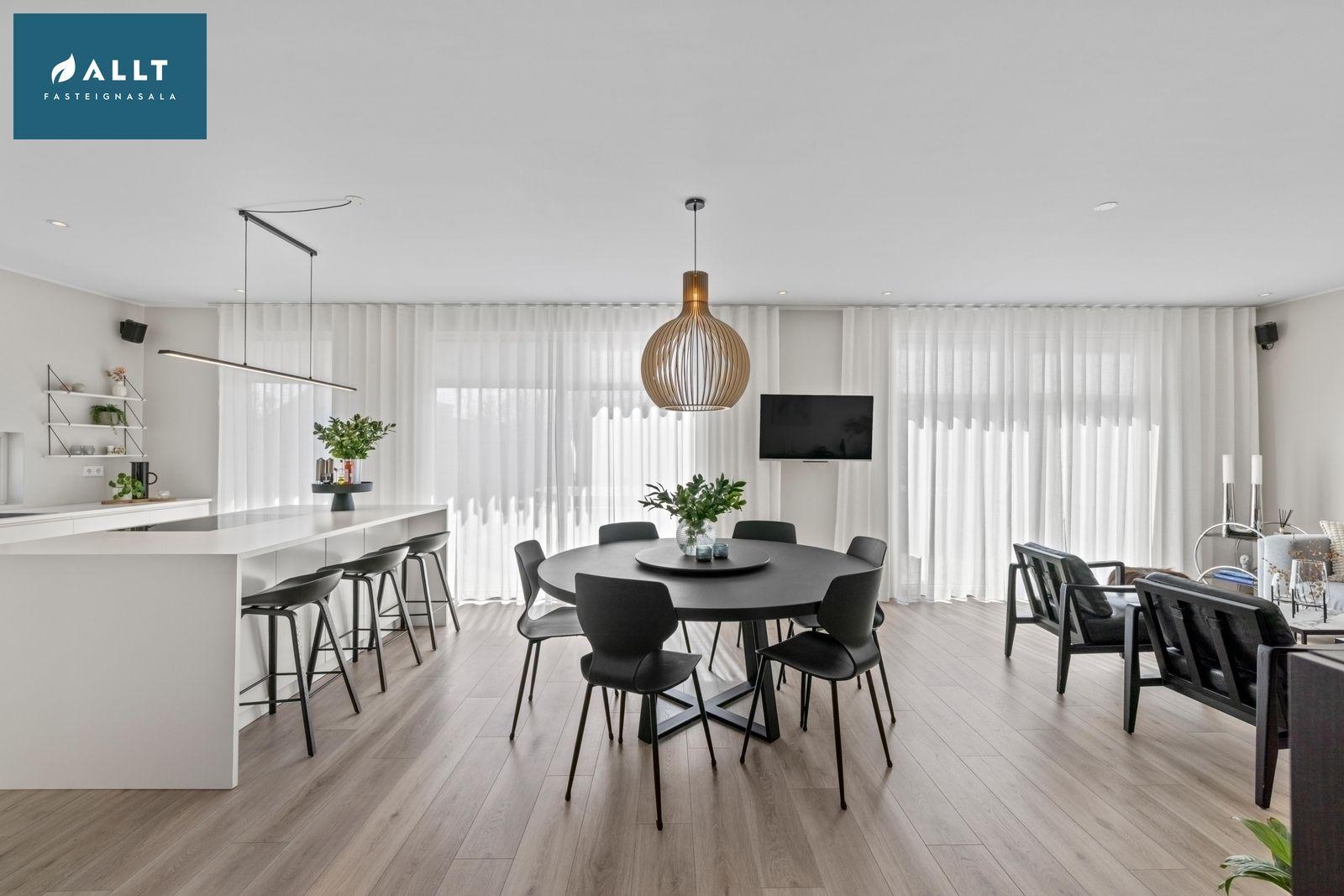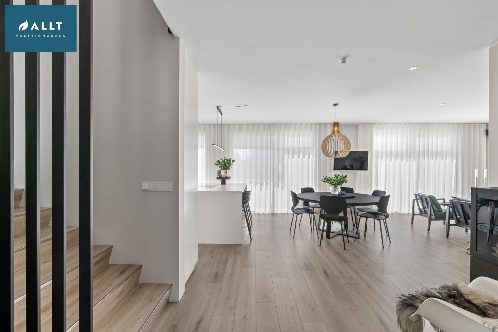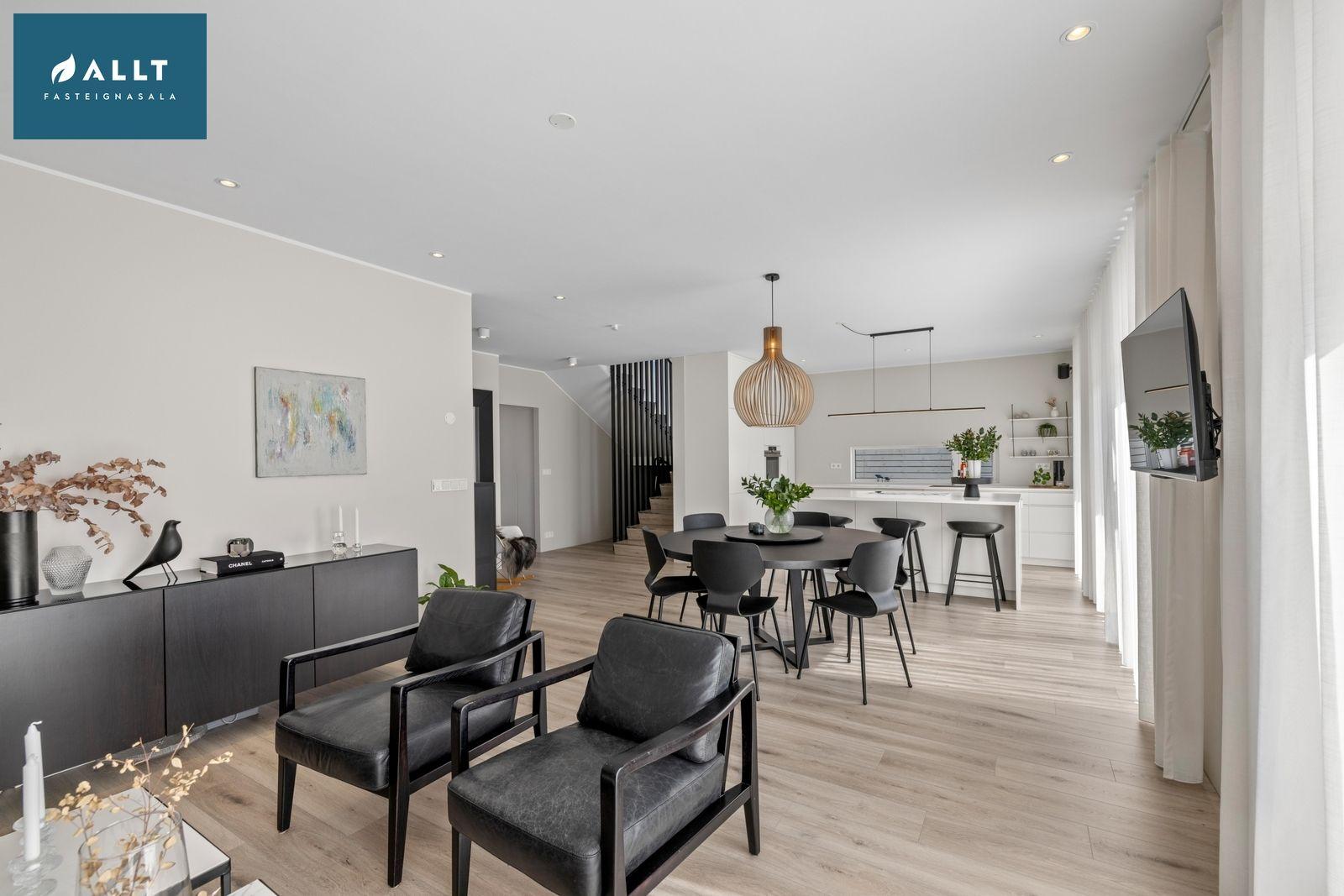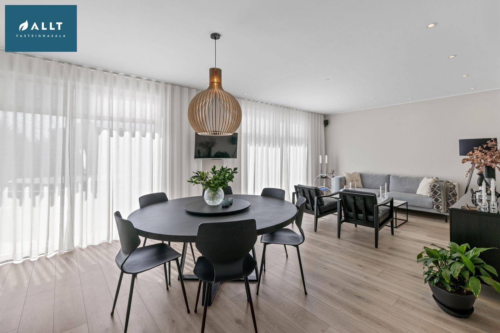 Eldhús, borðstofa og stofa eru samliggjandi með ljósu harðparketi og gengið út á pall frá stofu, innbyggð lýsing er í stofu og eldhúsi. Tengi fyrir Sonos hátalara í stofu og eldhúsi (hátalarar fylgja ekki)