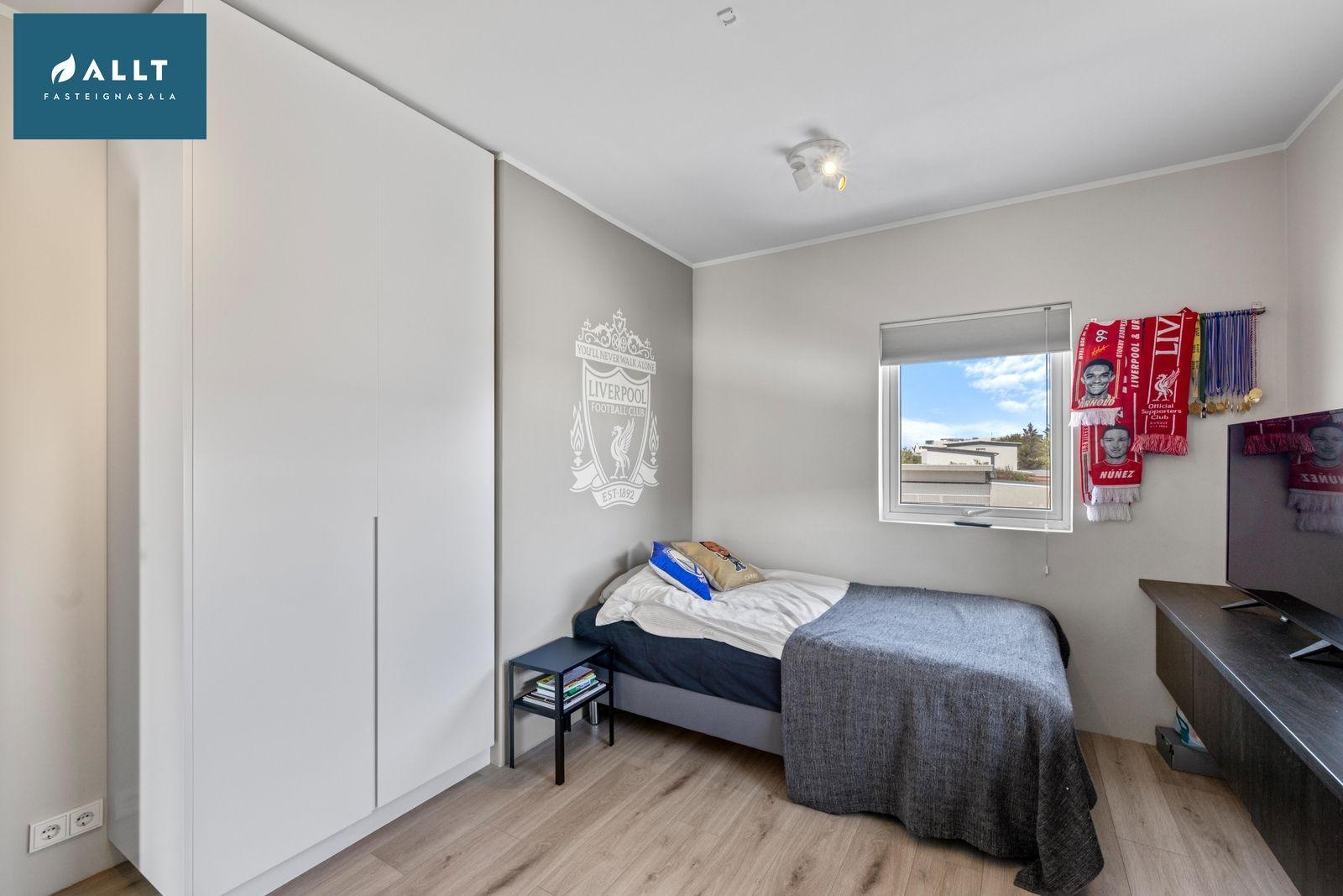 Barnaherbergin eru 3: Eru öll með ljósu harðparketi og góðum hvítum fataskápum.