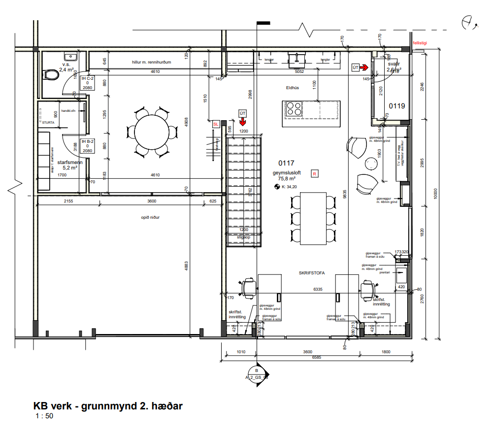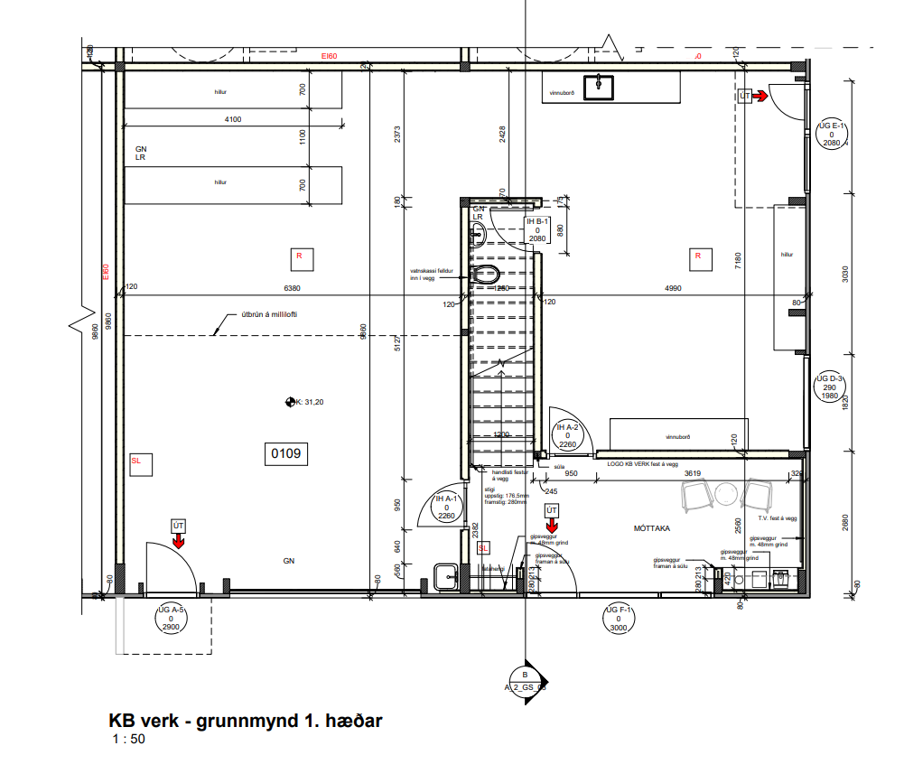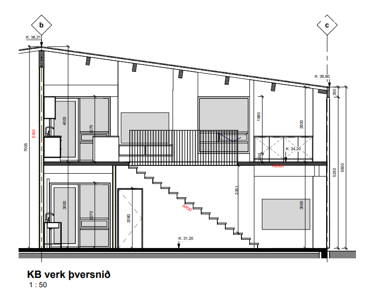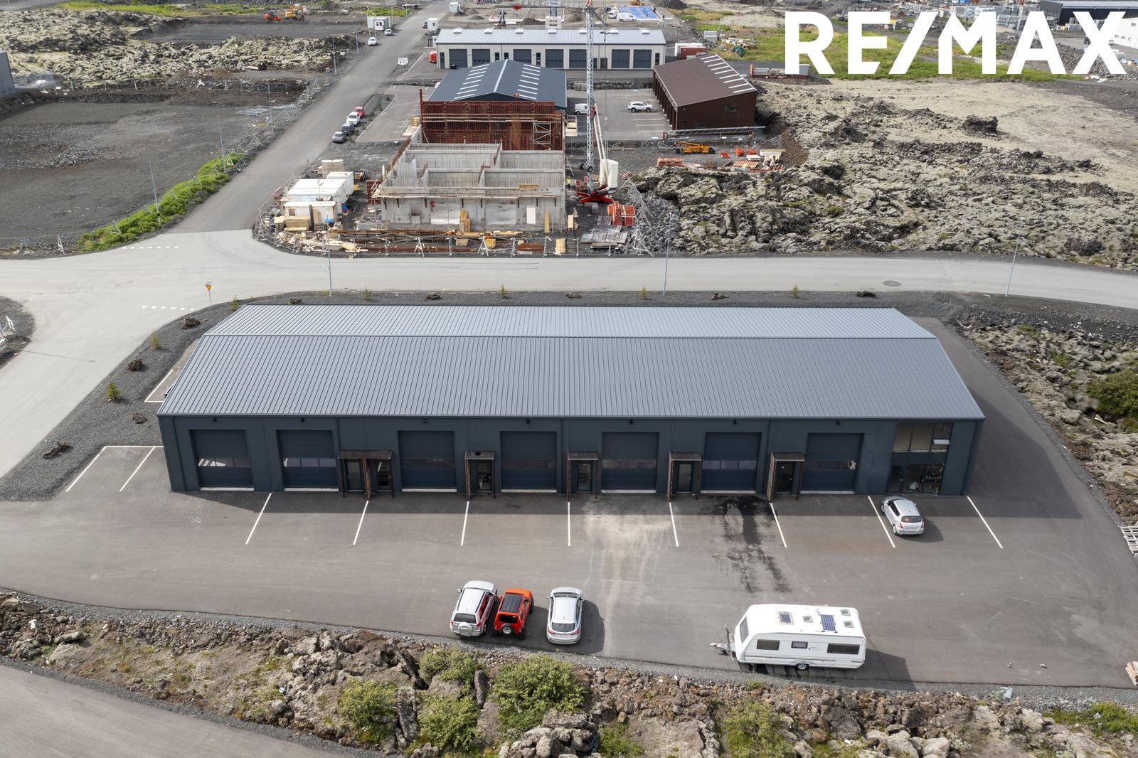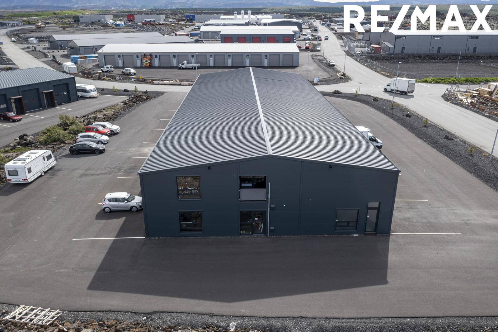 Uppbygging húss: Húsið er byggt ofan á steypta sökkla með hefðbundinni staðsteyptri plötu. Burðargrind hússins er úr límtré, klædd með PIR Quad Core samlokueiningum frá Kingspan. Veggeiningar eru 80mm á þykkt með microrib áferð. Litur RAL 7016. Málningarhúð á veggeiningum er 55 míkron á þykkt og valin sérstaklega til að verjast betur gegn UV-geislun (upplitun) og veðrun. Innkeyrsluhurðir frá Hörmann, litur RAL 7016 með samlitum álgluggum. Stærð hurða 450x360. Húsið skilast með vönduðum álgluggum og hurðum frá REYNEARS. Litur RAL 7016. Þak er byggt upp með 100mm þykkum PIR Quad Core samlokueiningum frá Kingspan. Málningarhúð 200 míkron. Litur RAL 7016. Innveggir eru gerðir úr OSB krossvið/spónaplötum í innralagi klætt með gifsi, með steinullareinangrun á milli. Tilbúnir til spörslunar og málningu. Gólf eru járnbent, staðsteypt og vélslípuð. Hitun húsnæðisins verður með gólfhita. Rafmagn (utanáliggjandi) fullfrágengið skv. teikningum og skilast með góðum iðnaðarlömpum í lofti og útikastara fyrir ofan iðnaðarhurð. Skilast með þriggja fasa tengil og 16A tengil undir töflu.