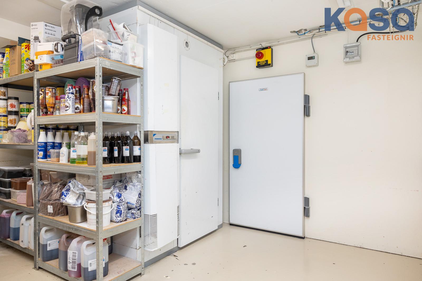 Neðri hæð: Þar er gott eldhús/framleiðslurými, þar er einnig stór göngukælir og frystiklefi, vaskar og allt sem þarf fyrir matvælaframleiðslu.