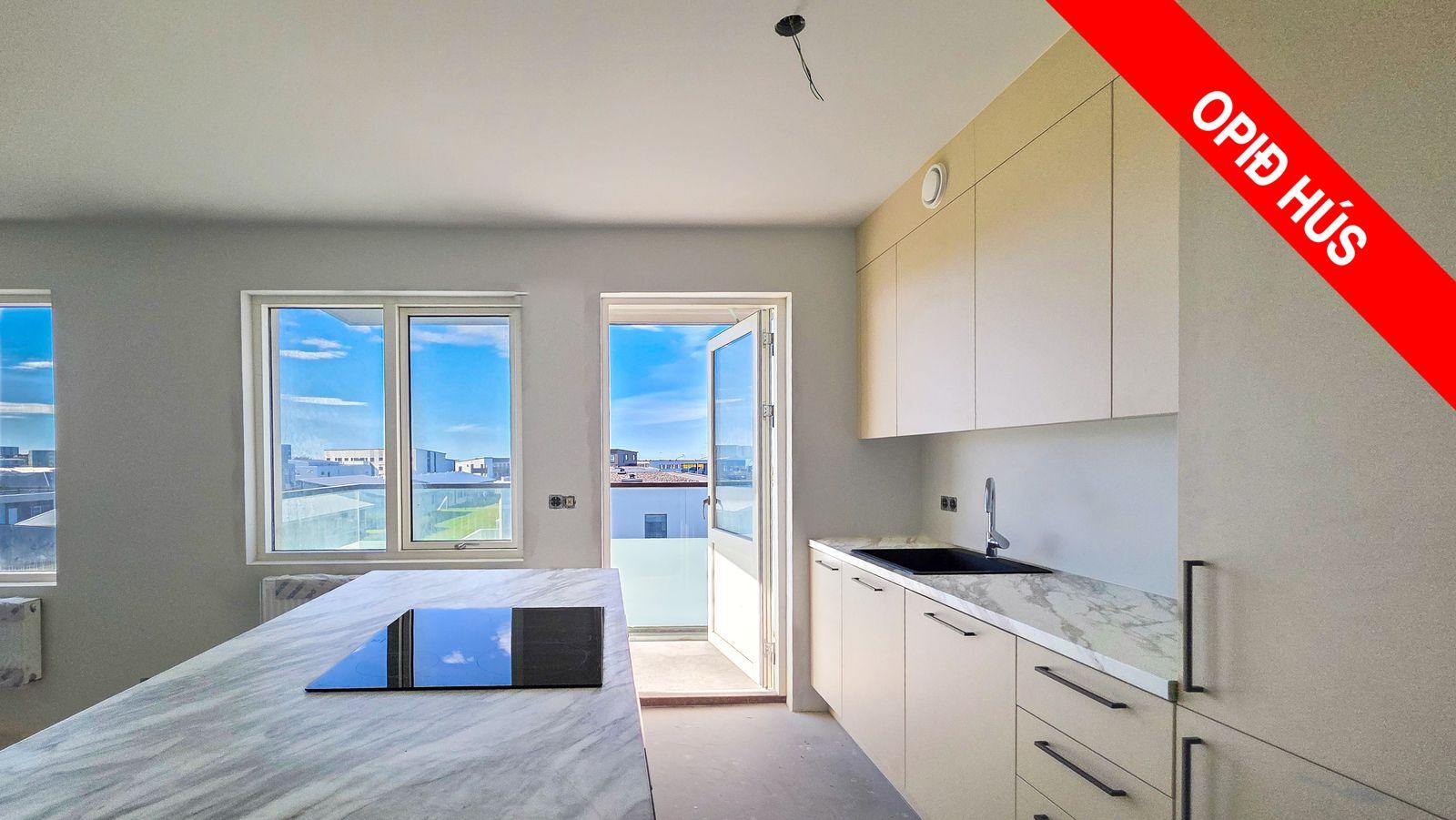 Lóð/bílastæði: Lóðin er 940,3 fm. Hellulögð stétt með snjóbræðslu við inngang og að bílastæðum. Með húsinu fylgja 19 malbikuð stæði. Sorpgerði fyrir tunnur er á lóð. Að öðru leyti verður lóðin þökulögð eða með náttúrulegum móa. Tengibúnaður (ídráttarrör) vegna hleðslu rafbíla er aðgengilegt við bílastæði (að fimm stæðum næst tengibrunni við hús). Lóðin verður afhent fullbúin í lok byggingartímans.