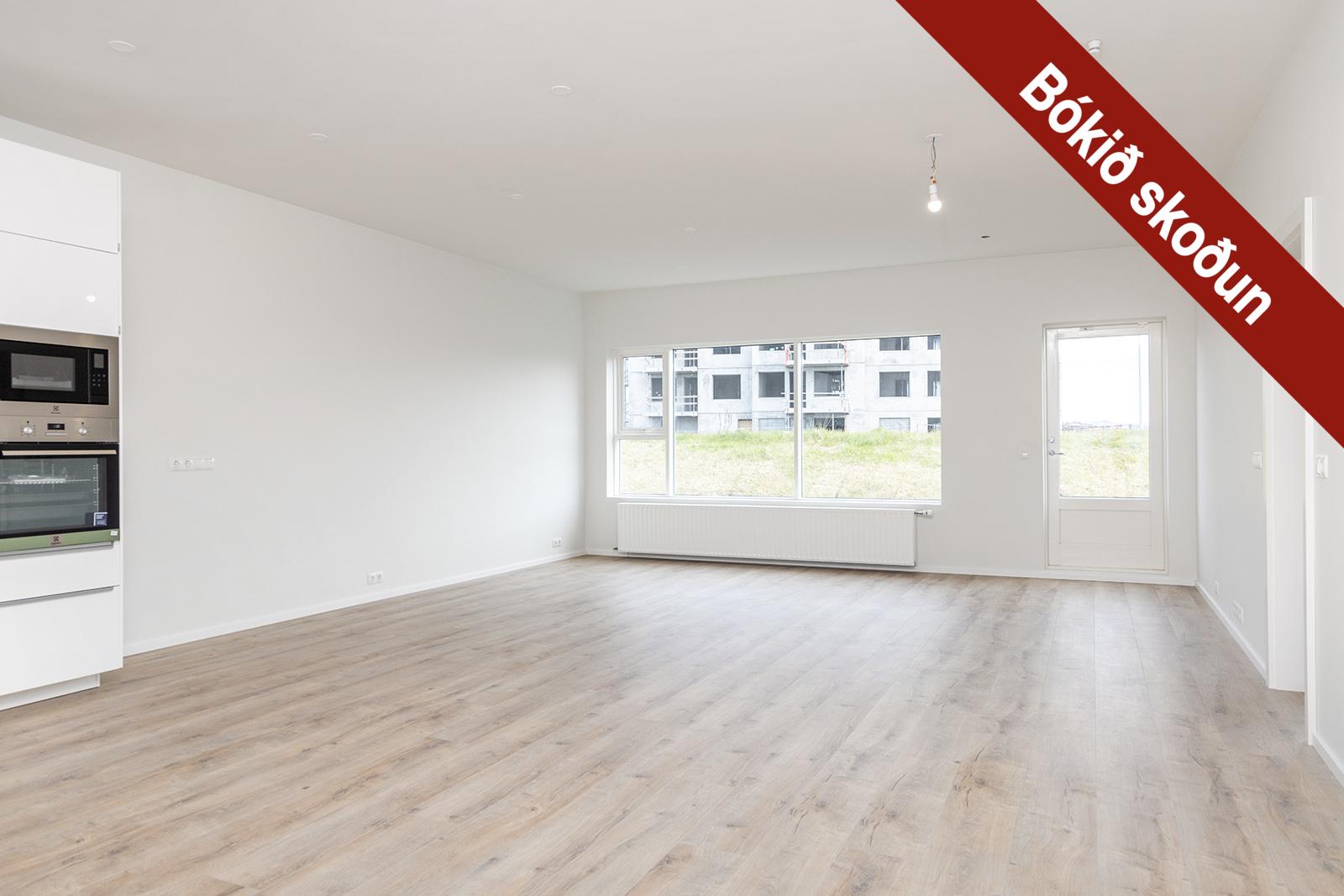 Stofa/borðstofa er í opnu rými með eldhúsi. Parket á gólfi. Úr stofu er gengið út á hellulagða verönd og bakgarð þar sem gert er ráð fyrir heitum potti i bakgarði.