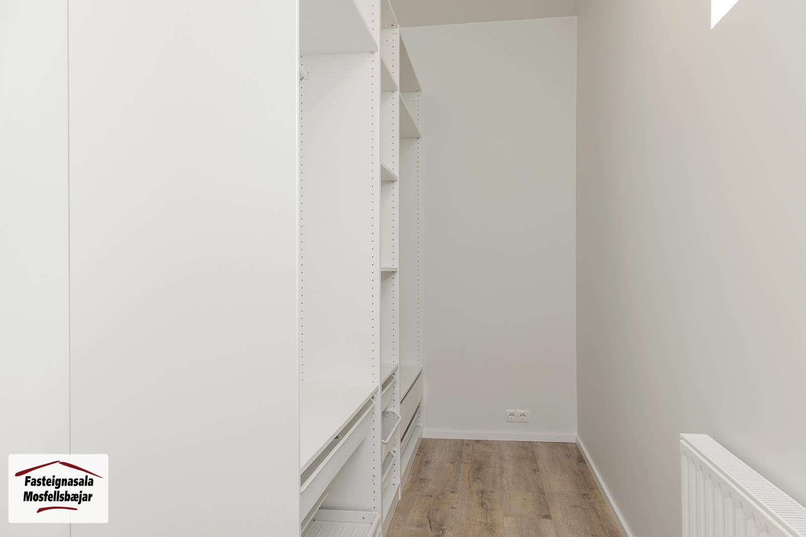 Baðherbergi er flísalagt. Á baði er vegghengt salerni, 'walk in' sturta, handklæðaofn og hvít innrétting. Innaf er þvottaherbergi