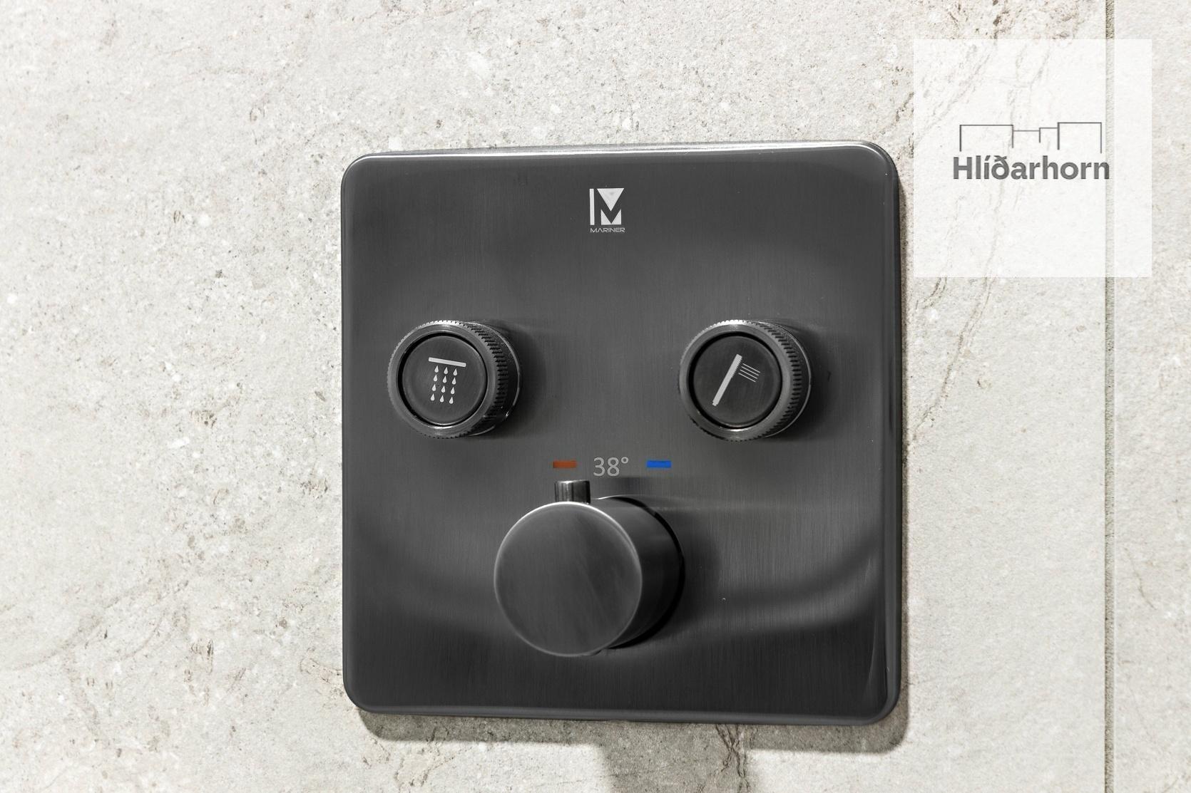 Nánari lýsing: Í anddyri eru góður fataskápur. Gengið er úr anddyri inn í rúmgott alrými, eldhús með eyju og stofu/borðstofu með gólfsíðum glugga og útgengi á svalir í suður. Taupe grá eldhúsinnrétting með mattri áferð, svartur quartz-steinn á borðum og milli skápa og hágæða ítölsk blöndunartæki úr byssubláu stáli. Öll eldhúsraftæki af hæsta gæðaflokki. Innbyggður ísskápur og uppþvottavél. Rúmgott hjónaherbergi með mjög góðum skápum. Tvö rúmgóð svefnherbergi með fataskáp. Baðherbergi með “walk-in” sturtu með hertu gleri, handklæðaofni og upphengdu salerni. Gráar steinflísar á gólfi og veggjum, taupe grá innrétting með mattri áferð og speglaskápur með lýsingu. Blöndunartæki á baði úr byssubláu stáli. Innbyggð blöndunartæki í sturtu. Þvottaherbergi er með ljósri innréttingu, gráum steinflísum og vaski. Tengi fyrir þvottavél og þurrkara er í vinnuhæð í innréttingu. Sérgeymsla íbúðar í kjallara er merkt 0060. Í kjallara Hlíðarhorns eru sameiginlegar hjóla- og vagnageymslur og bílakjallari með fyrirkomulagi samnýtingar þar sem íbúar munu hafa forgang.