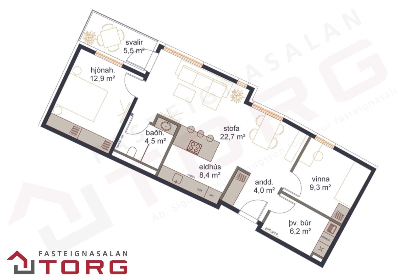 Nánari upplýsingar veitir Guðný Ösp Ragnarsdóttir, lgf., s. 665-8909 eða tölvupósti: gudny@fstorg.is Nánari lýsing: Gófhiti er í öllum rýmum og handklæðaofn í baði. Fallegar samrýmdar og sérsmíðaðar innréttingar, vönduð rafmagnstæki frá Bsoch, meðal annars innfeldur ísskápur, innbyggð uppþvottavél, Spanhelluborð, ofn og Eico vifta yfir eyju og/eða Bosch vifta undir skáp, þar sem við á. Baðherbergi og ef um sér þvottaherbergi er að ræða, eru flísalögð með flísum frá Casalgrande Padana. Hreinlætistæki eru frá Grohe og sturtuklefi með hertu sturtugleri og niðurfalli í gólfi. Sjá skilalýsingu og nánari upplýsingar á heimasíðu verkefnisins: