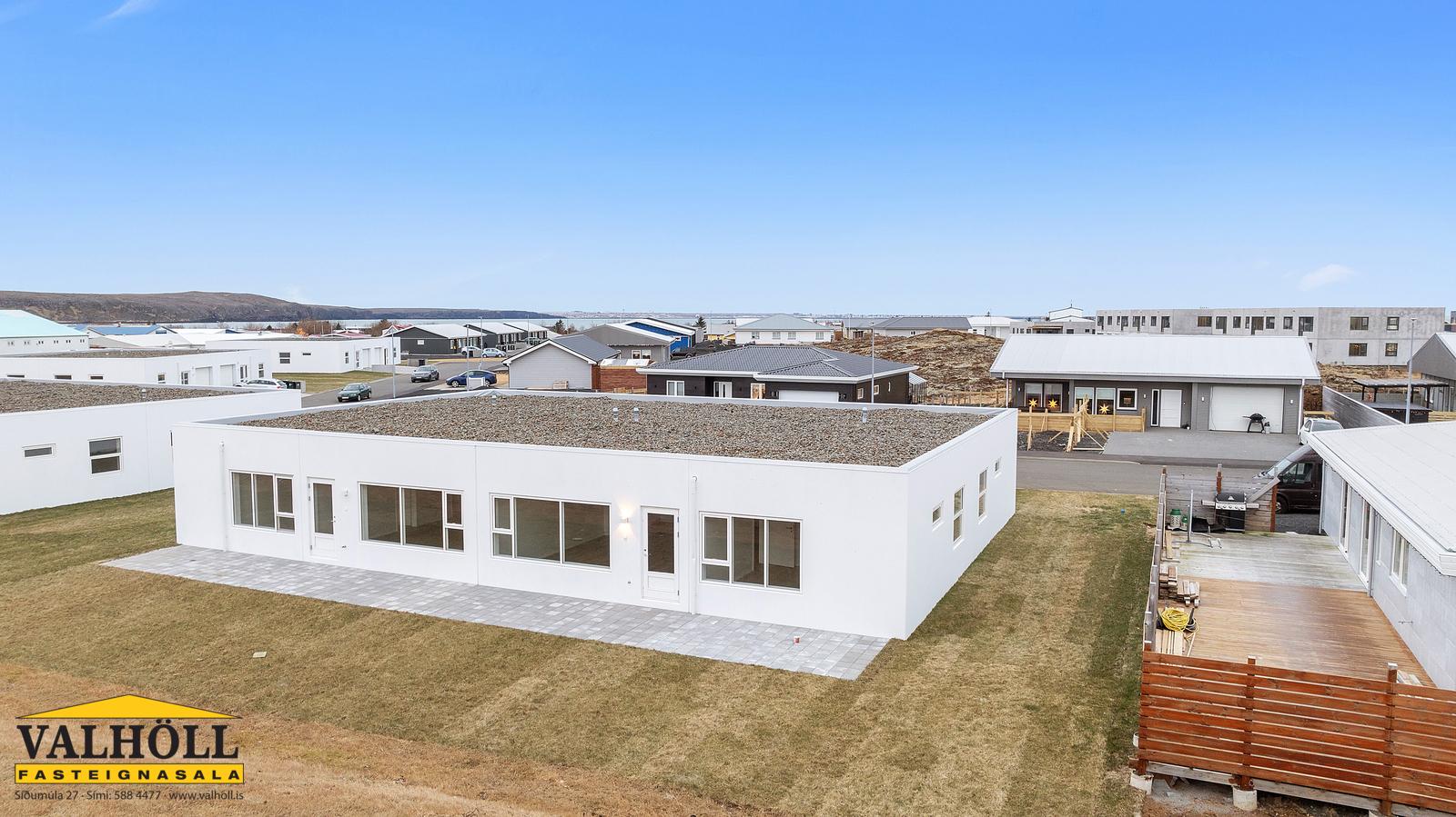 Lóð: hellulagt bílastæði fyrir framan hús með hitalögn. Fyrir aftan hús er hellulögð verönd. Að öðru leyti er lóðin tyrfð.