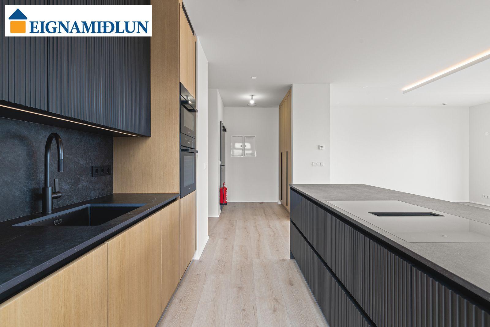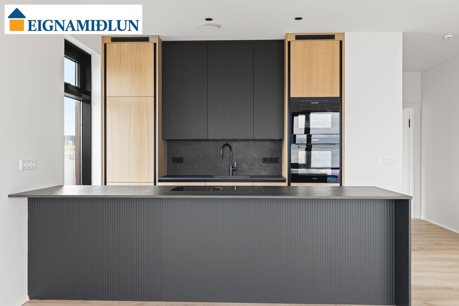 Afar vönduð heimilistæki eru í íbúðum sem flest eru frá MIELE. Kæli-/frystiskápur og uppþvottavél eru innbyggð í innréttinguna og spanhelluborð með innbyggðum gufugleypi eru í flestum íbúðum. Dekton – Laos steinborðplötur eru í öllum eldhúsum, einnig er sama plata á milli borðplötu og efri skápa.