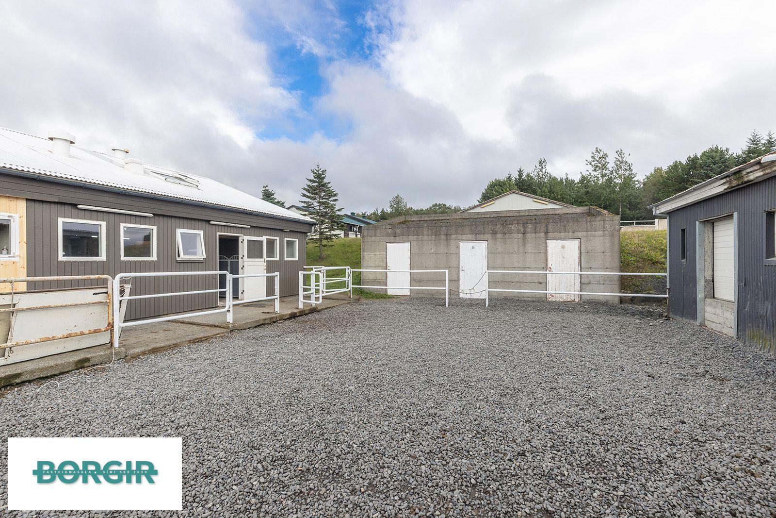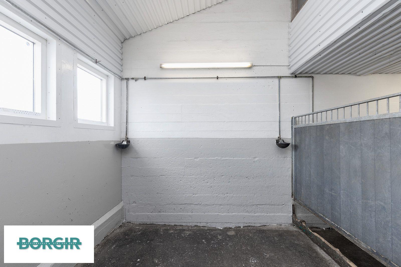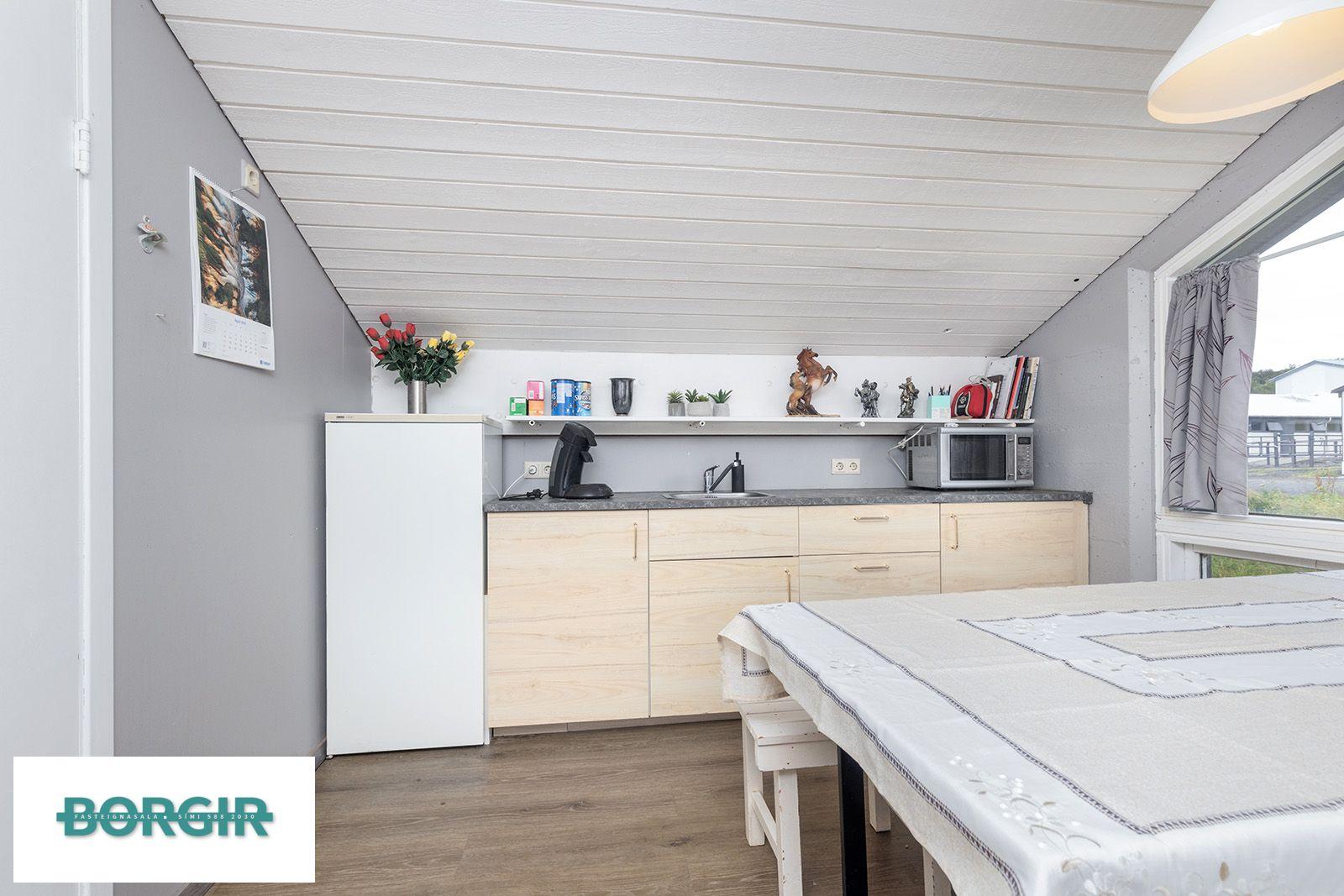 Lýsing: Tveir inngangar eru í húsið á austur og vestur hlið. Hestagerði báðum megin. Jarðhæðin er hólfuð niður í stíur fyrir 14/15 hesta og þar einnig 15 fm hlaða.. Gluggaröð á annari hliðinni. Stigi upp á ris loft og þar í holi er skápar fyrir föt og búnað, málað gólf. Frá holi er klósett/snyrting. Innaf holinu er svo kaffistofa með eldhús innréttingu og bekkjum en þar plast parket á gólfi. Góður gluggi í norður.