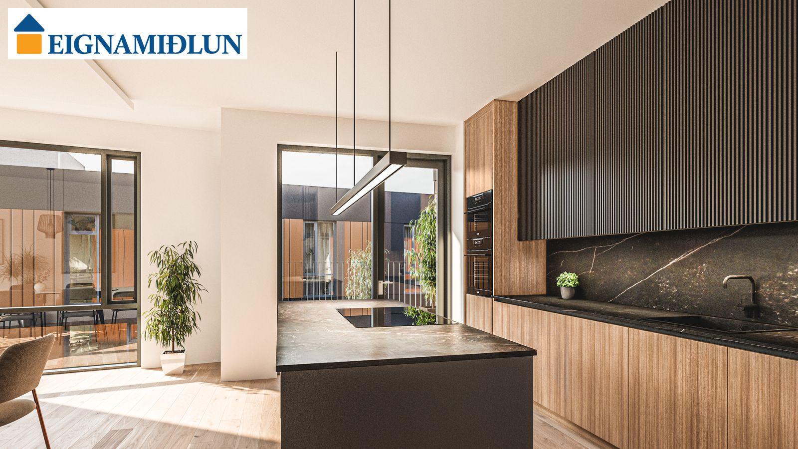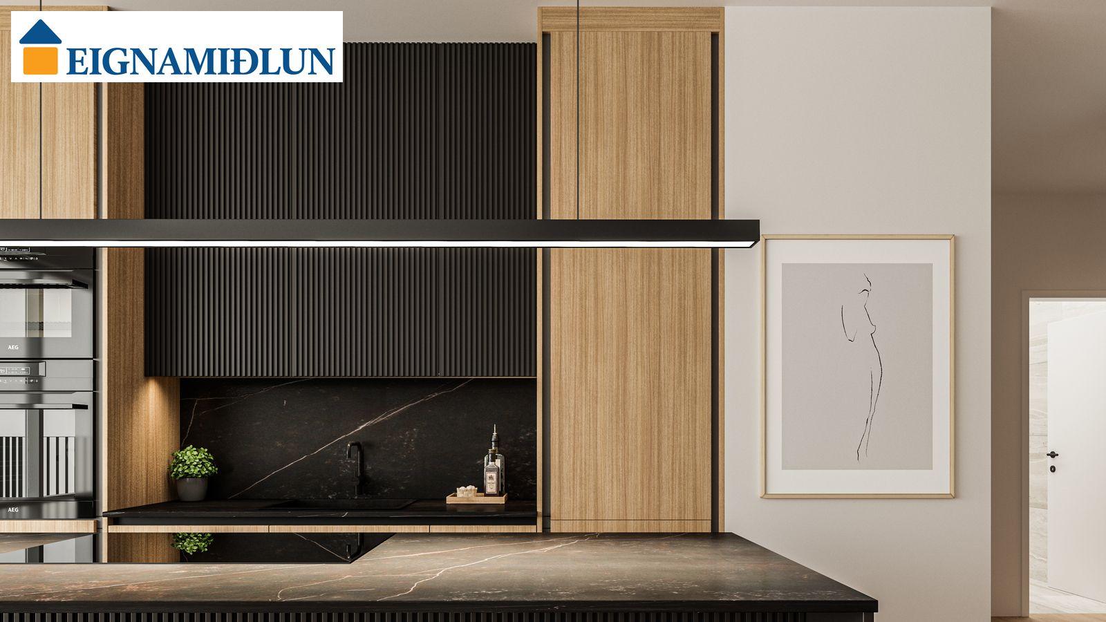 Eldhúsinnréttingar eru sérsmíðaðar frá Selás. Skápar eru spónlagðir með eik og bæsaðir í bland við sprautulakkaðar einingar. Að innan eru skápar úr slitsterku melamin efni..Afar vönduð heimilistæki eru í íbúðum sem flest eru frá MIELE. Kæli-/frystiskápur og uppþvottavél eru innbyggð í innréttinguna og spanhelluborð með innbyggðum gufugleypi eru í flestum íbúðum. Dekton – Laos steinborðplötur eru í öllum eldhúsum, einnig er sama plata á milli borðplötu og efri skápa.