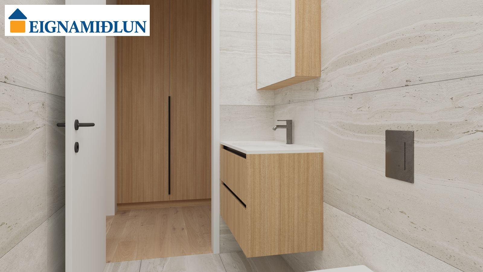 Bað-og þvottahúsinnréttingar eru sérsmíðaðar, vaskaskápar eru spónlagðir með eik og bæsaðir.