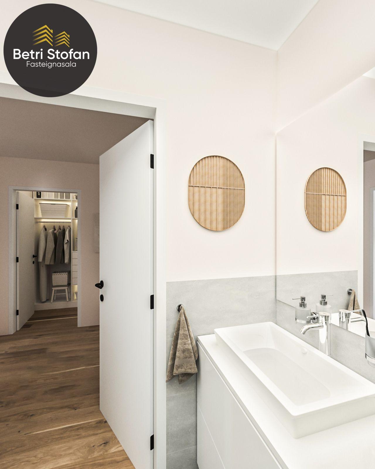 - Baðherbergi er með stílhreinar hvítar innréttingar, speglaskáp fyrir ofan vask og er flísalagt að hluta. Gert er ráð fyrir þvottavél og þurrkara með rakaþéttingu.