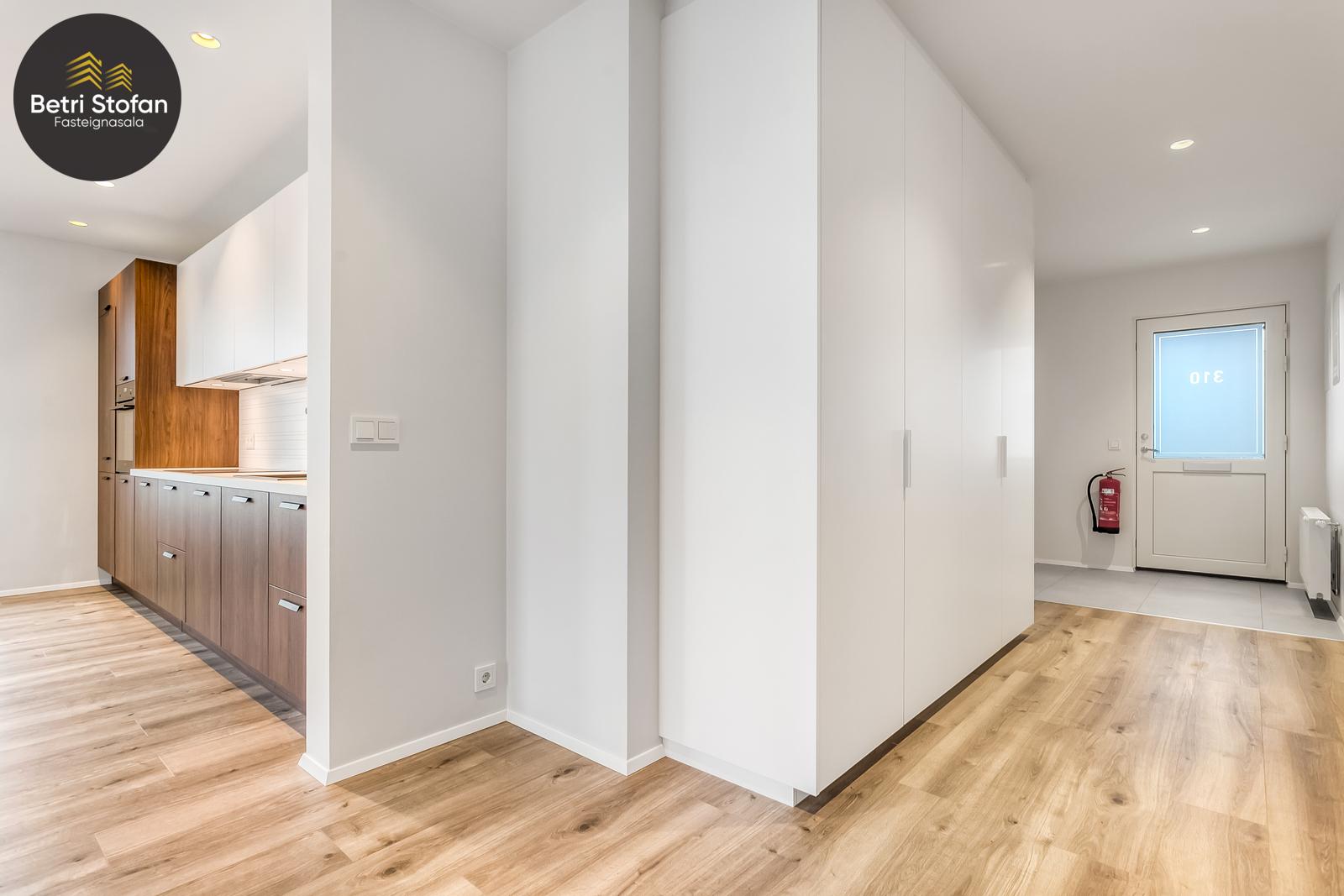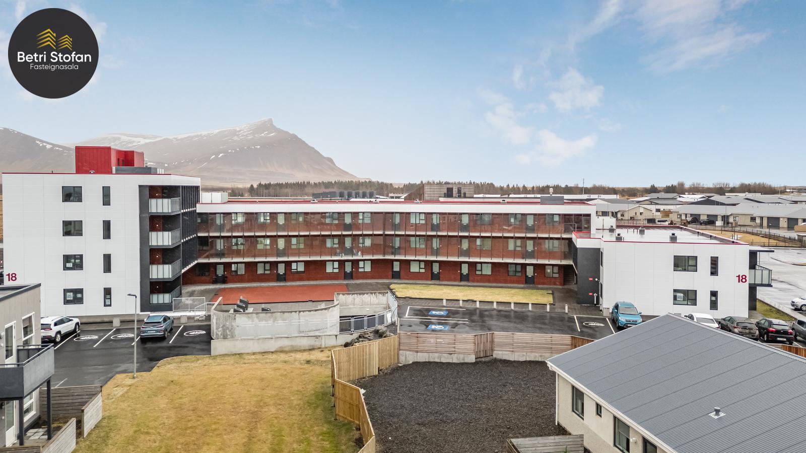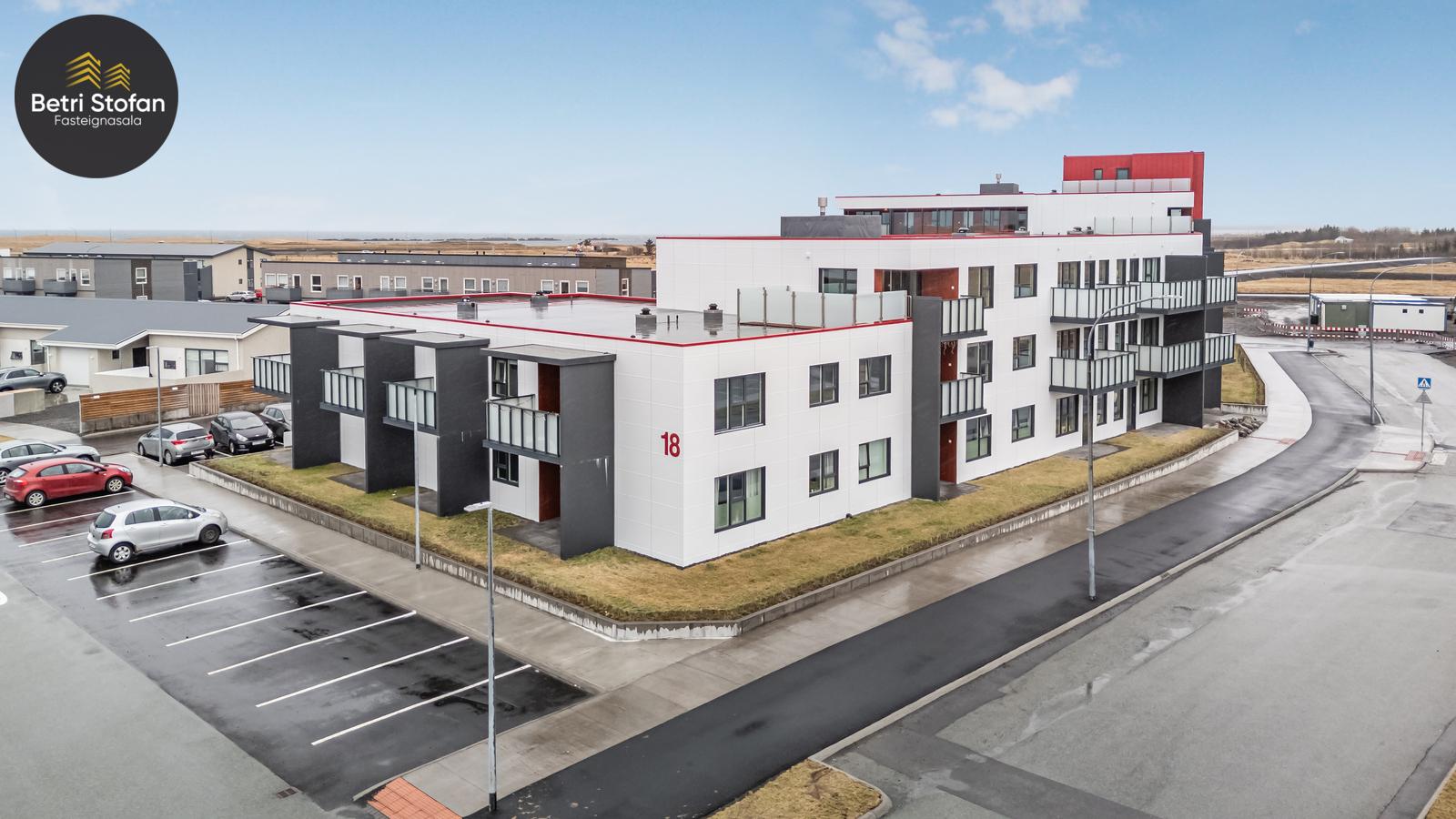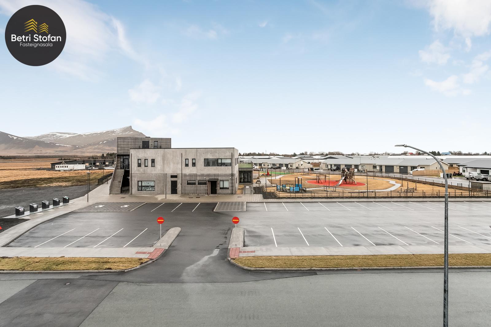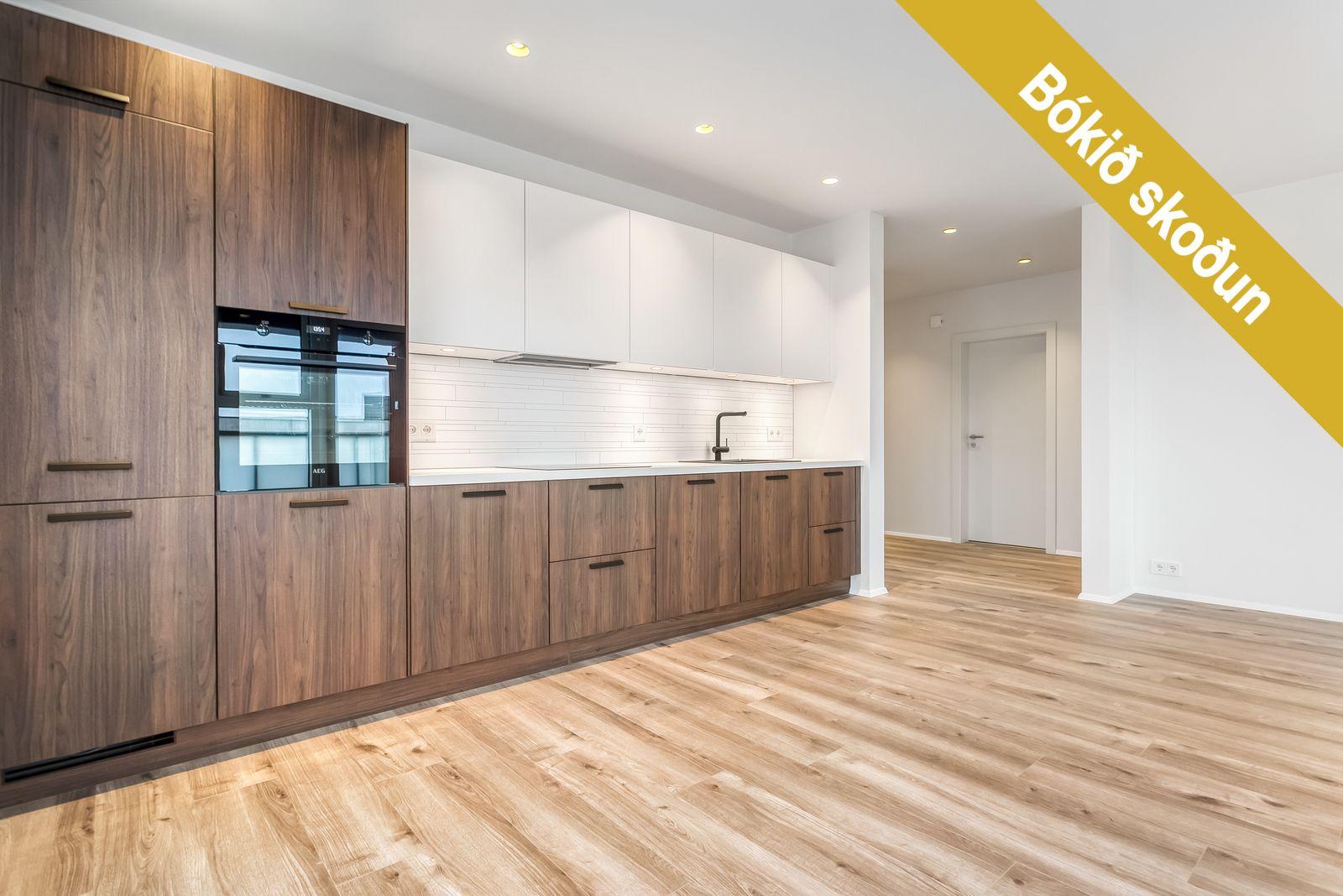 Nánari lýsing: Forstofa: Skápur, flísalagt. Eldhús: Hvít innrétting frá GKS. Ofn í vinnuhæð, vifta. Span helluborð, innbyggður kælir og frystir og uppþvottavél. Tæki frá AEG. Innbyggð lýsing undir efri skápum. Parket á gólfi. Stofa , borðstofa og eldhús mynda opið rými. Parket á gólfi. Útgengt út á hellulagðan sérafnotareit. Svefnherbergi: Fataskápur. Parket á gólfi Hjónaherbergi: Fataskápar. Parket á gólfi Baðherbergi: Innrétting með handlaug. Speglaskápur. Upphengt salerni. Sturta með sturtugleri.Handklæðaofn. Ljósar flísar á gólfi og veggjum. Tengi fyrir þvottavél.