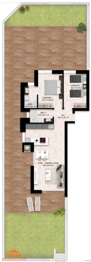 Íbúð með tveimur svefnherb. + tveimur baðh. Verð frá 219.000 Evrum (ISK 31.700.000) + 10%skattur og ca. 3% kostnaður við kaupin.