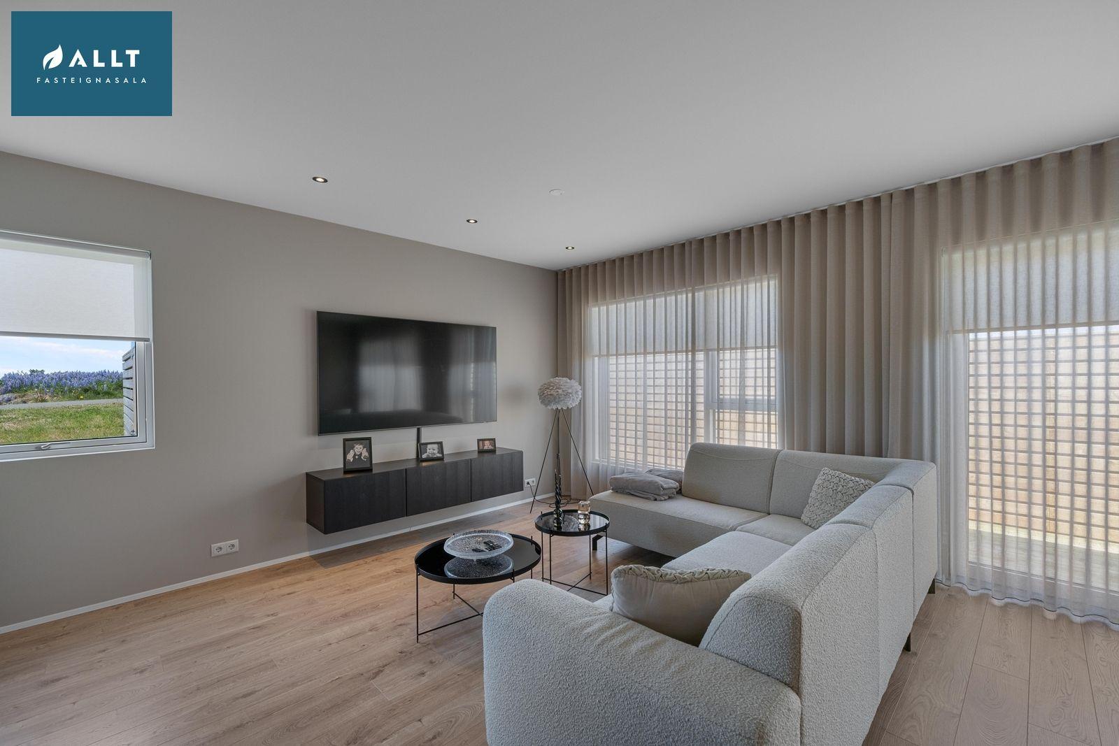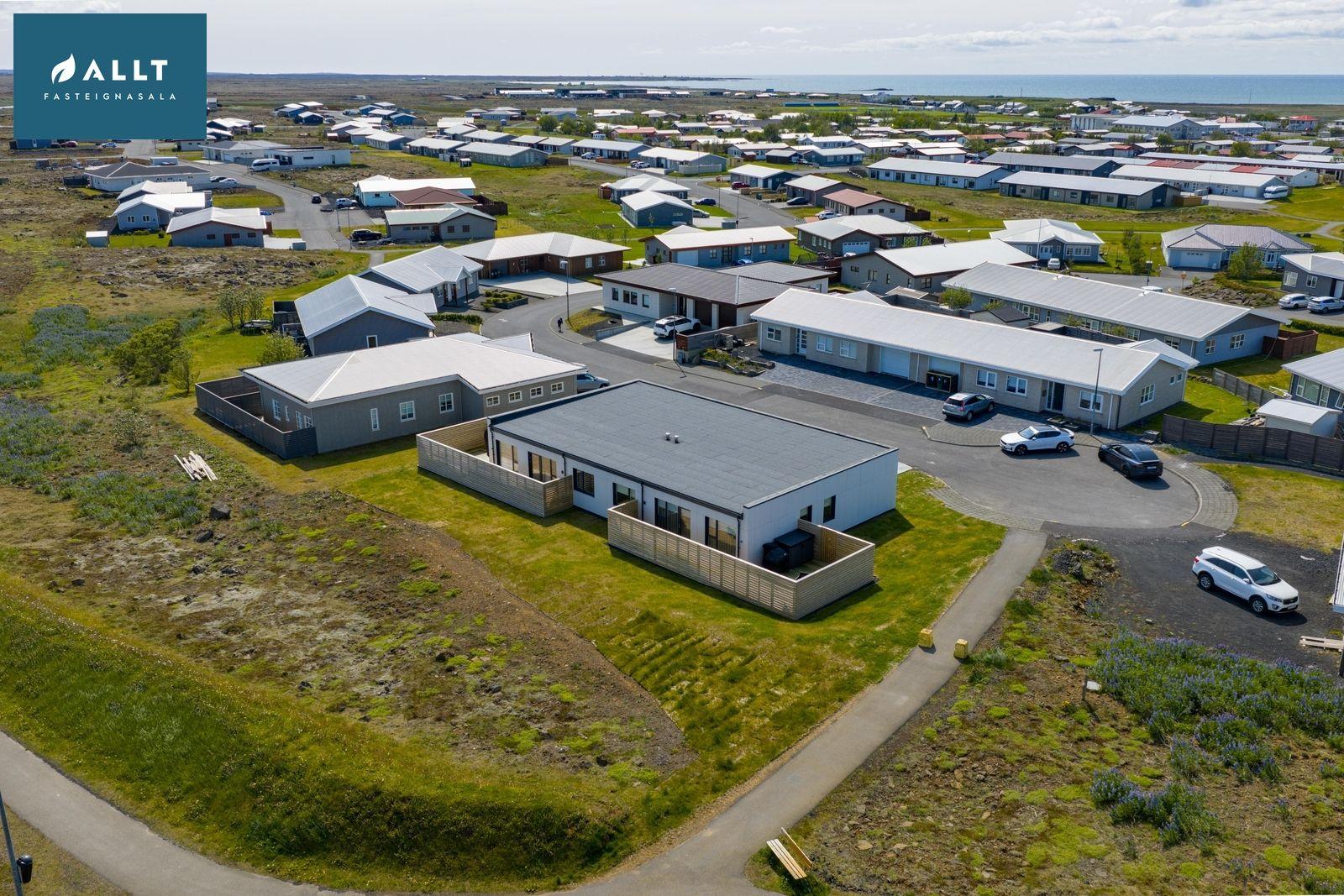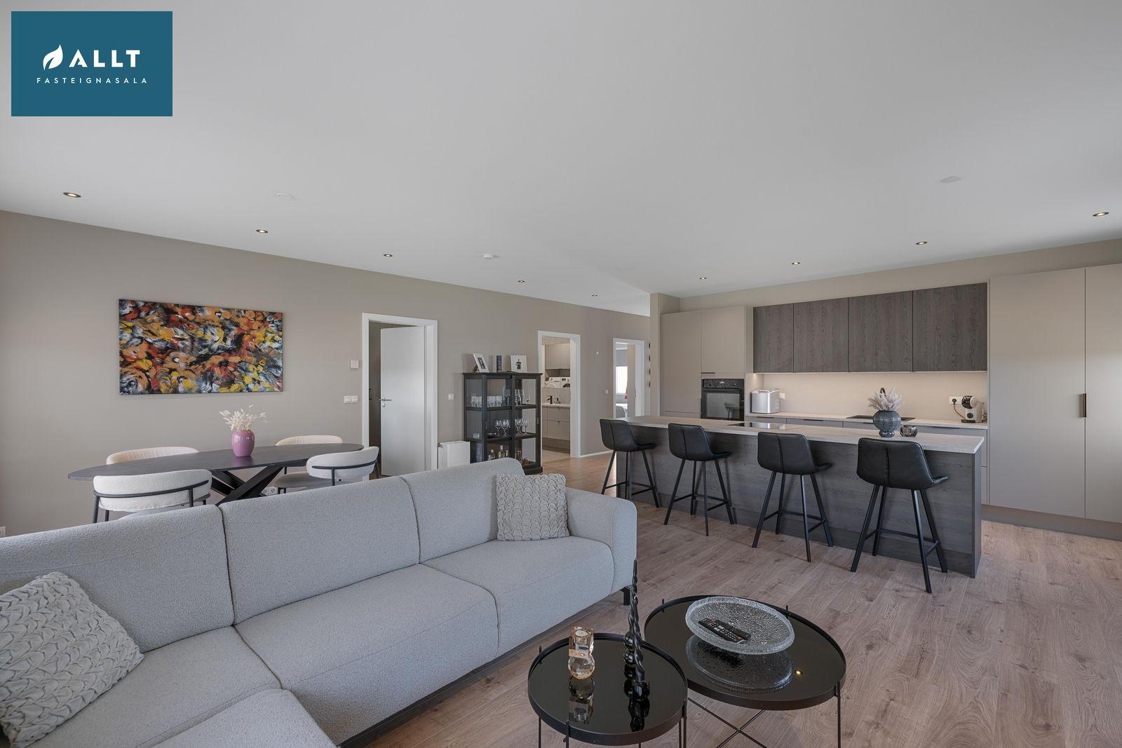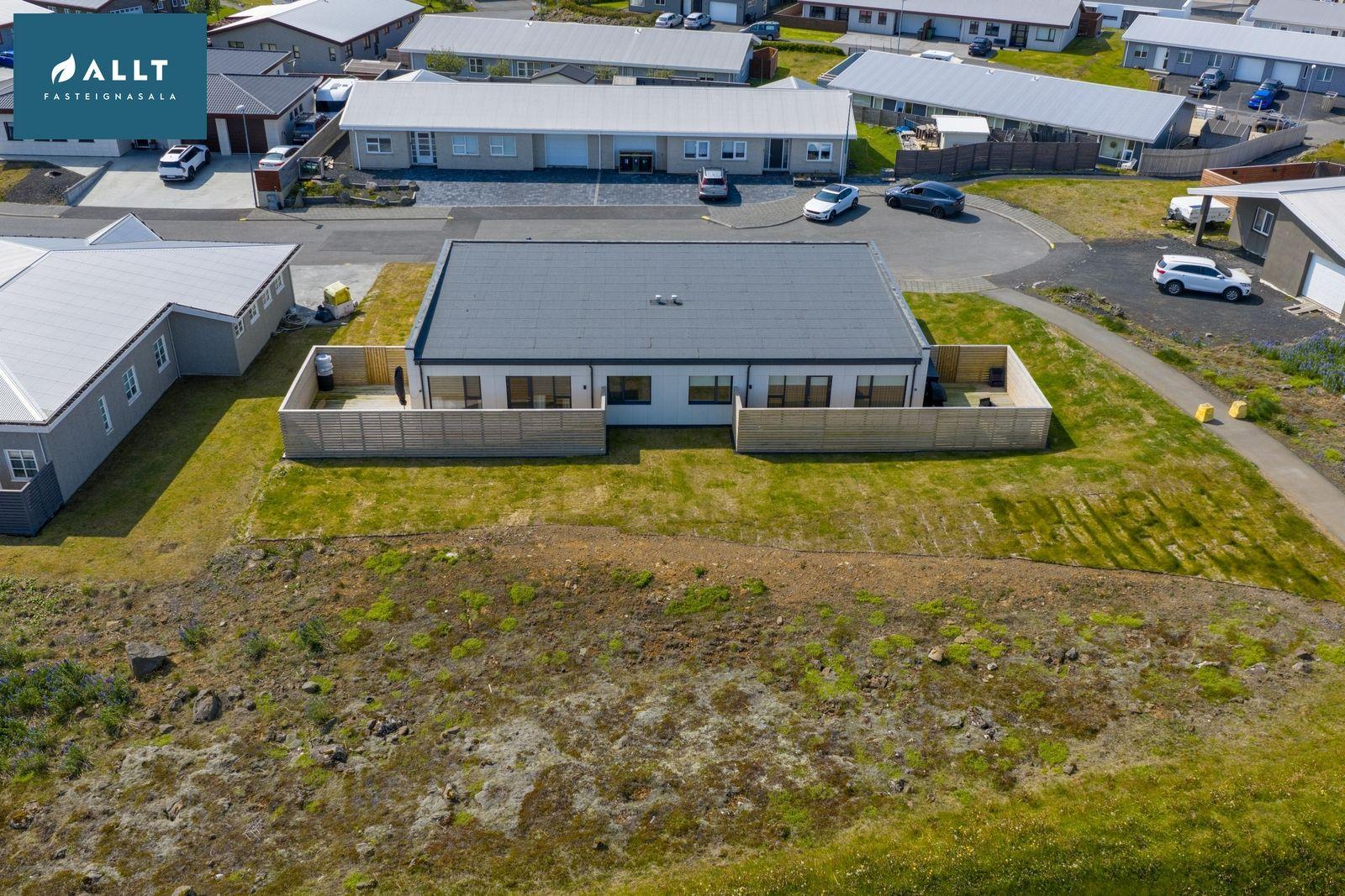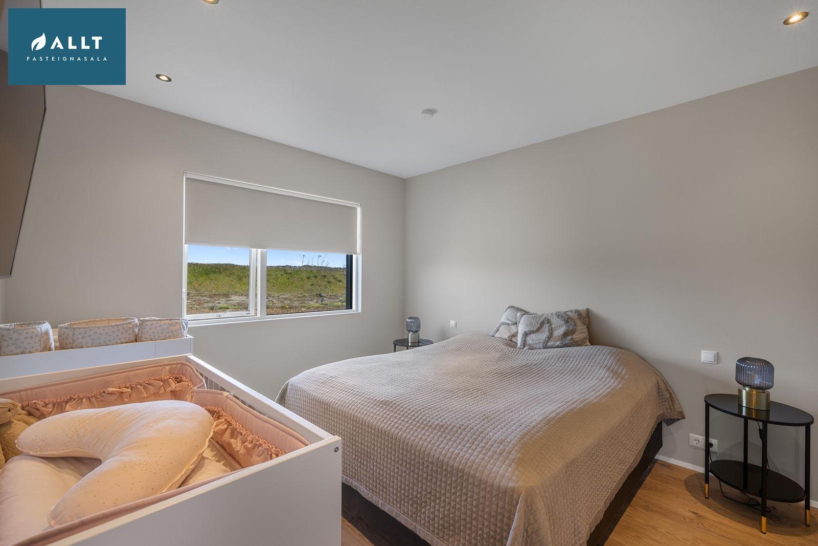 Eignin skiptist í:Forstofu, geymslu, þrjú svefnherbergi, baðherbergi með þvottaaðstöðu, eldhús, stofu/borðstofu í opnu rými með útgengi á verönd