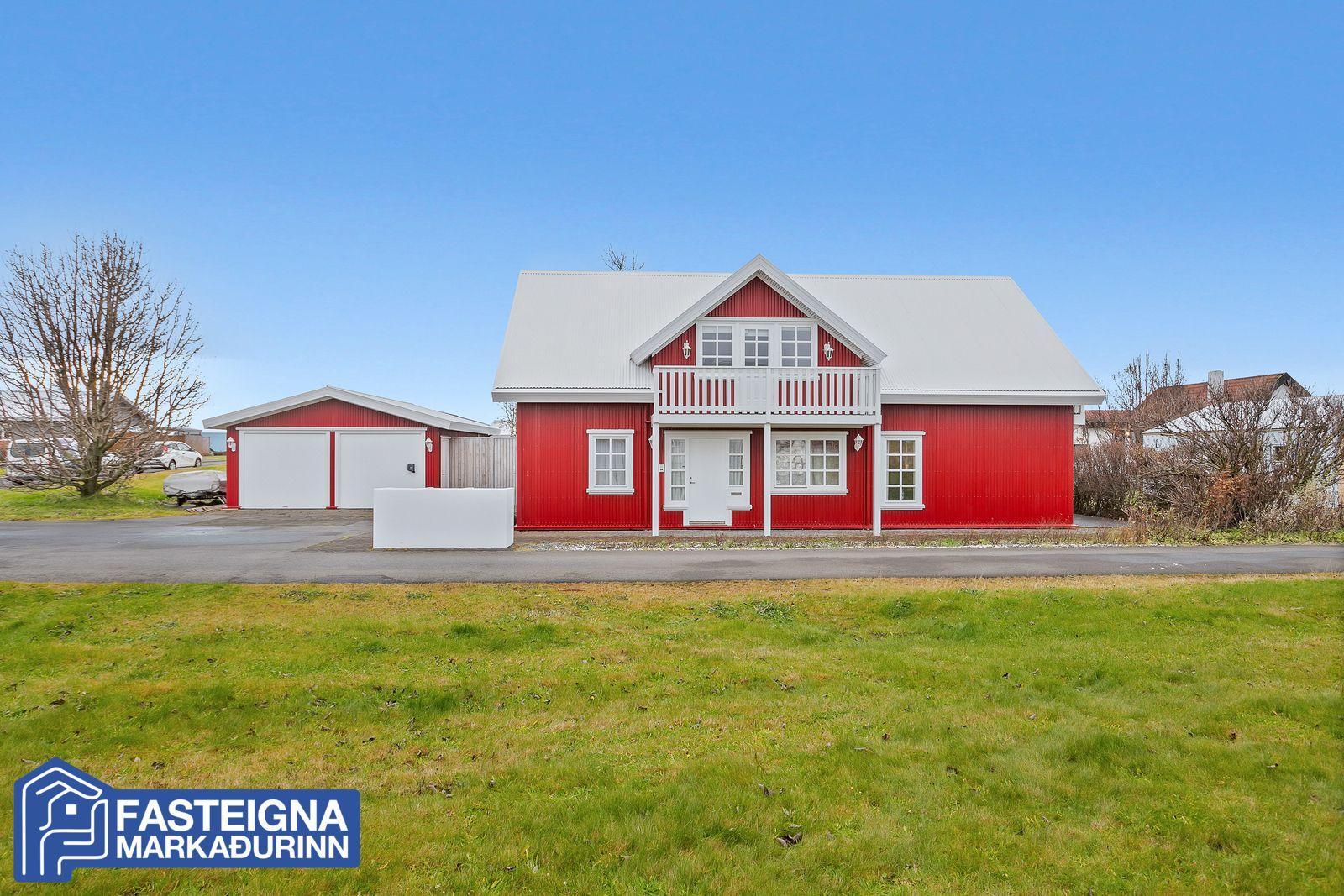 Eignin stendur á stórri eignarlóð sem umlykur húsið sem ávallt hefur hlotið gott viðhald og nýlega er búið að endurnýja glugga á austur og suðurhlið hússins ásamt hurðum. Einnig er búið að endurnýja bárujárn á húsinu að mestu leiti og var þakið yfirfarið og málað í sumar. Nýtt þakjárn er á bílskúr og einnig búið að endurnýja bárujárn þar að hluta.Húsið er skv. Fasteignaskrá Íslands skráð 260,0 fermetrar að stærð á tveimur hæðum að meðtöldum tvöföldum 58,0 fermetra bílskúr og skiptist þannig að íbúðarhúsið er 202,0 fermetrar að stærð, bílskúrinn er 58,0 fermetri og hluti af honum er líkamsræktarherbergi með baðherbergi.