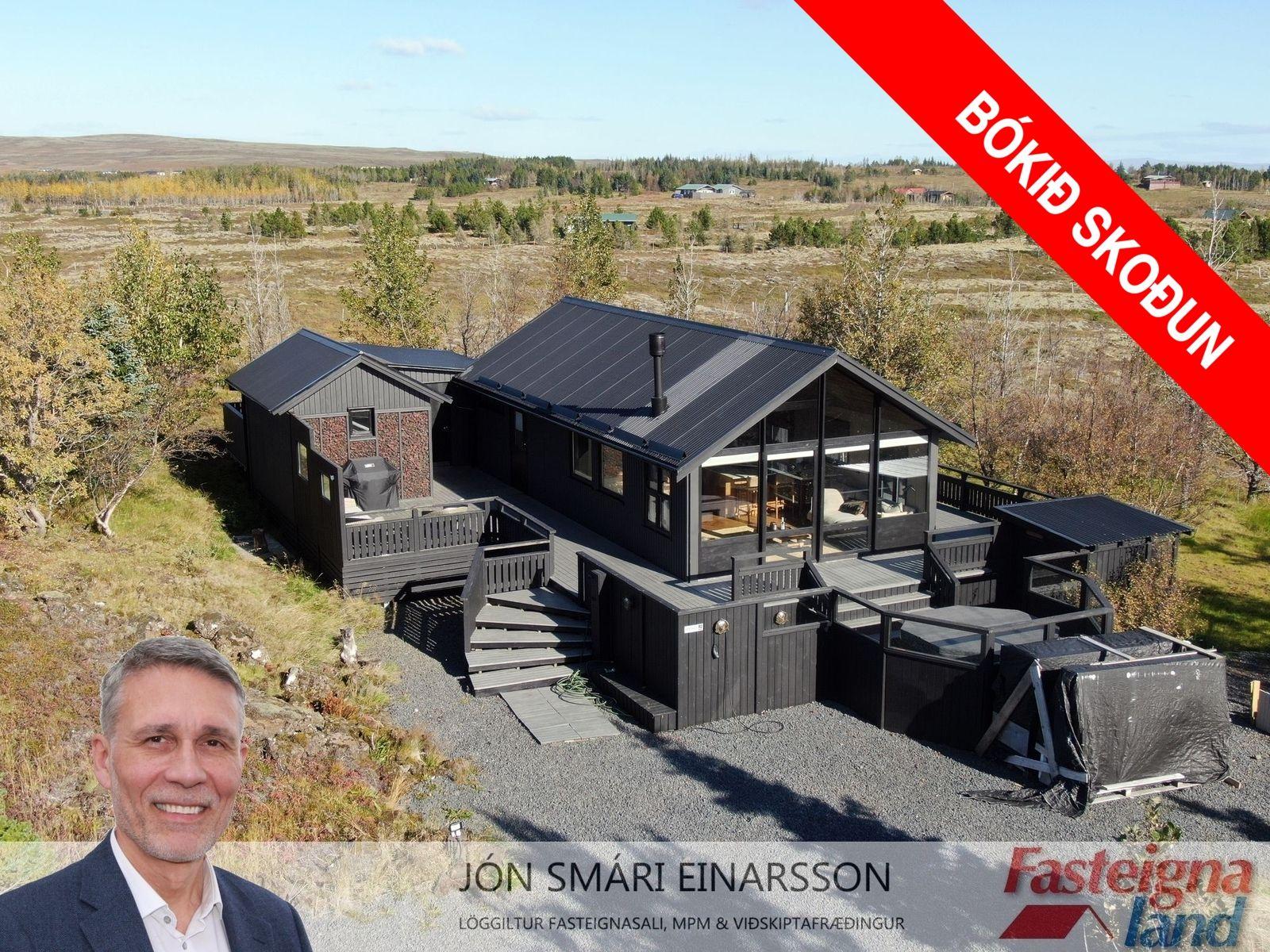Draumaeign fyrir vandlátaTil sölu er glæsileg og mikið endurnýjuð eign þar sem hvergi hefur verið til sparað í vali á efnum og innréttingum. Innanhússhönnun er eftir Leif Welding og er húsið einstaklega smekklegt og vel skipulagt. Aðalhúsið skiptist í tvö svefnherbergi, baðherbergi, eldhús, stofu og geymslu sem nýtt er sem svefnloft. Af sólpallinum er gengið inn í rúmgott þvottahús með góðri innréttingu, og þar má einnig finna heitan pott og sérsmíðaða saunu. Við húsið stendur gestahús með baðherbergi og sér sólpalli. Húsin eru tengd hitaveitu með lokuðu ofnakerfi. Svefnaðstaða fyrir allt að níu manns. Eignin selst fullbúin með öllum húsgögnum og búnaði og hentar því vel sem draumaheimili eða sumarhús fyrir vandláta kaupendur.