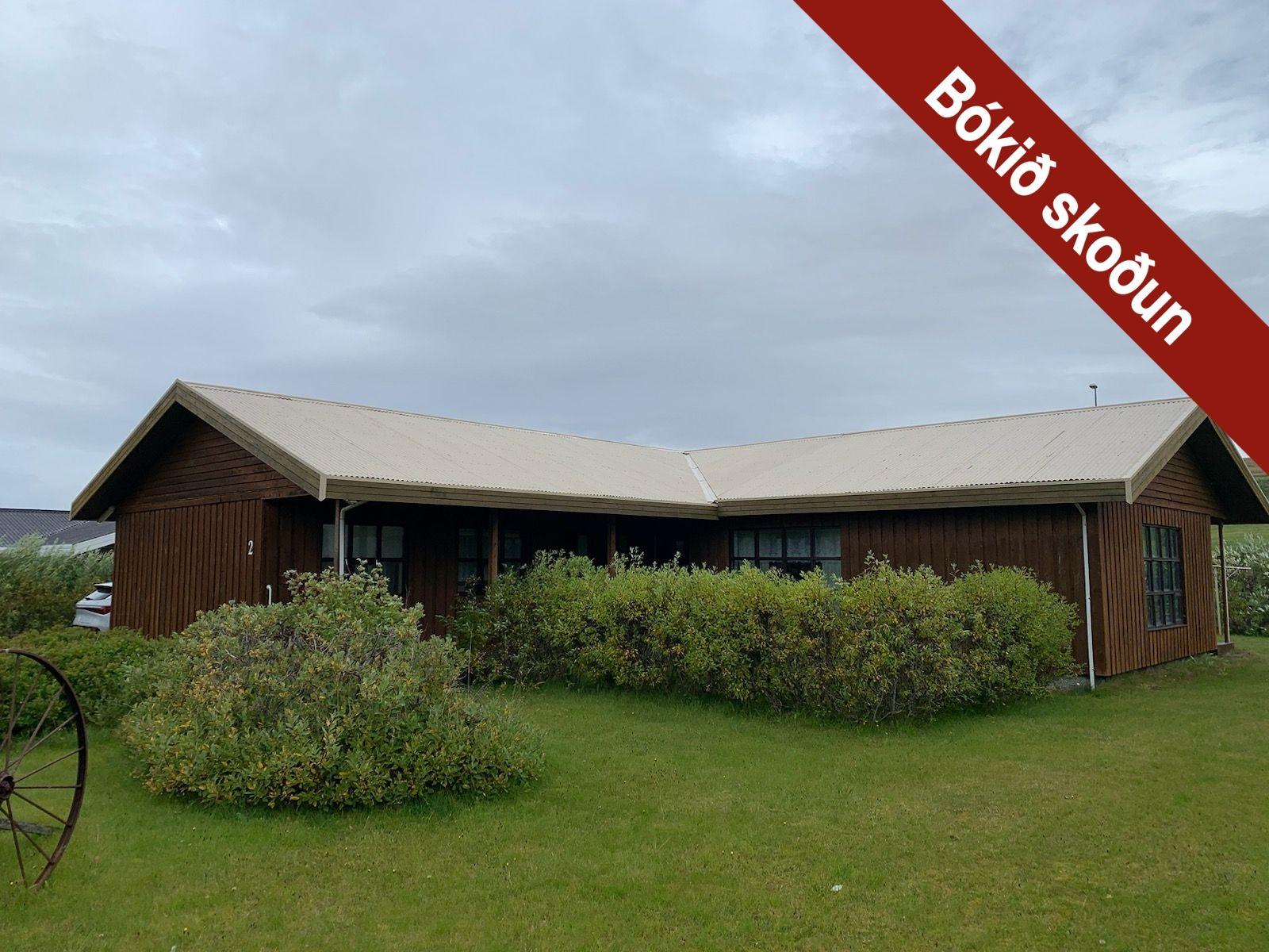 Nánari lýsing: Forstofa er með flísum á gólfi. Gangur/hol er með parket á gólfi. Stofa og borðstofa eru í opnu rými með góðri lofthæð og teppi á gólfi. Eldhús eru með borðkrók og parketi á gólfi, hvít innrétting með góðu skápaplássi. Í innréttingu er eldavél. Gert er ráð fyrir ísskáp og uppþvottavél í innréttingu. Úr eldhúsi er innangengt inn í þvottahúsið. Þvottahús er með innréttingu og flísum á gólfi. Úr þvottahúsi er útgengt út á lóð. Úr þvottahúsi er aðgengi upp á loft sem hefur verið nýtt sem geymsluloft. Baðherbergi er með viðarinnréttingu, salerni, baðkari og sturtuklefa. Flísar á gólfi. Svefnherbergi nr. 1 (hjónaherbergi) er rúmgott með parket á gólfi og fataskápum. Svefnherbergi nr. 2 er með parket á gólfi. Svefnherbergi nr. 3 er með parket á gólfi. Svefnherbergi nr. 4 er með parket á gólfi. Svefnherbergi nr. 5 er með dúk á gólfi. Gestasalerni er óinnréttað og er nýtt sem geymsla í dag. Bílskúr er rúmgóður með máluðu gólfi. Rafmagn, hiti og rennandi vatn. Mikil lofthæð og gluggar. Innkeyrsluhurð og inngönguhurð er á bílskúrnum.