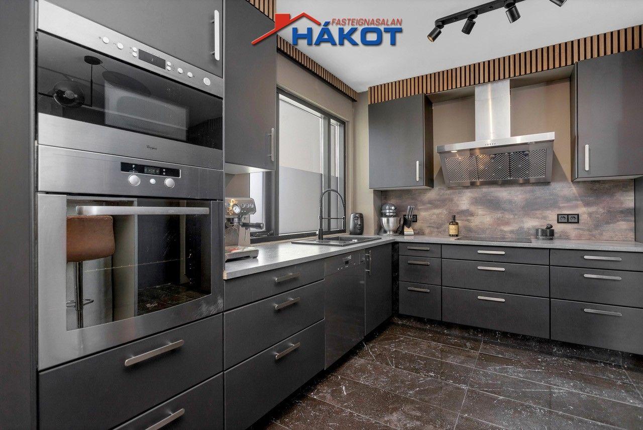 Eldhús (flísar, dökk innrétting, háfur, helluborð, korkur, hvít innrétting, helluborð, ofn, örbylgjuofn og ísskápur fylgja, opið að borðstofu).