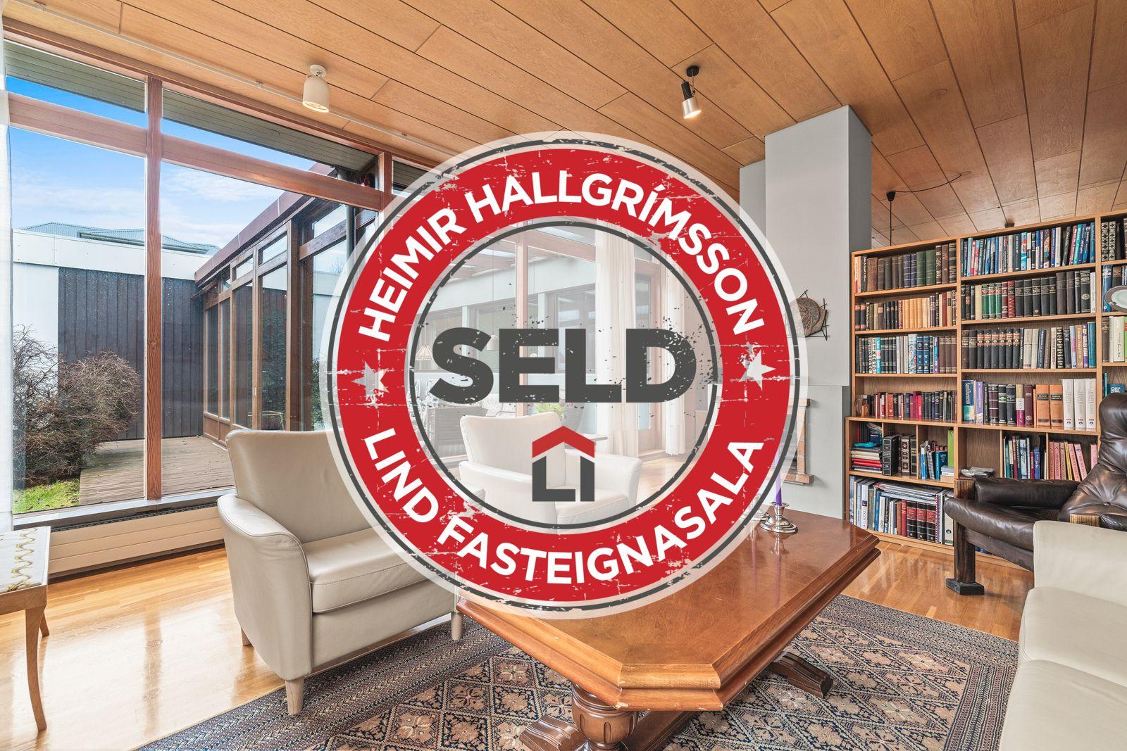 Nánari lýsing: Forstofa: Er stór með flísum á gólfi og innb. fataskápum. Svefnherbergi I: Er staðsett inn af forstofu með plastparketi á gólfi, fataskáp og glugga til norðurs. Gestasnyrting/geymsla: Er í dag nýtt sem geymsla en allar lagnir til staðar til þess að útbúa gestasnyrtingu. Hol: Með parketi á gólfi og eikar panel á veggjum og lofti. Stofa: Er rúmgóð og skiptist í setustofu og borðstofu. Aukin lofthæð, parket á gólfi og gluggar til suðurs og vesturs. Fallegur eikar panell í loftum og sjarmerandi arinn í setustofu. Útgengi í sólskála. Sólskáli: Er u.þ.b. 30 fermetrar að stærð með viðargólfi gler gluggum til suðurs inn í bakgarð hússins. Rennihurðar og gler í þaki. Eldhús: Með dúk á gólfi og upprunalegri eldhúsinnréttingu. AEG bakaraofn, Gorenje spansuðu helluborð og uppþvottavél. Flísar á milli skápa, gluggi til norðurs og borðkrókur. Fallegur panell í loftum. Þvottaherbergi: Er rúmgott með korkflísum á gólfi og glugga til norðurs. Innrétting, vaskur og tengi fyrir þvottavél/þurrkara. Svefngangur: Með parketi á gólfi. Hjónaherbergi (svefnherbergi II): Er rúmgott með parketi á gólfi og góðum skápum. Möguleiki væri að bæta við skápum og jafnvel útbúa fataherbergi með breytingum á skipulagi. Svefnherbergi III: Með plastparketi á gólfi, skápum og glugga til suðurs. Svefnherbergi IV: Með plastparketi á gólfi og glugga til suðurs. Baðherbergi: Með flísum á gólfi og veggjum. Innrétting við vask, baðkar með sturtutækjum og flísalögð sturta. Niðurtekið loft með innfelldri lýsingu og útloftun.