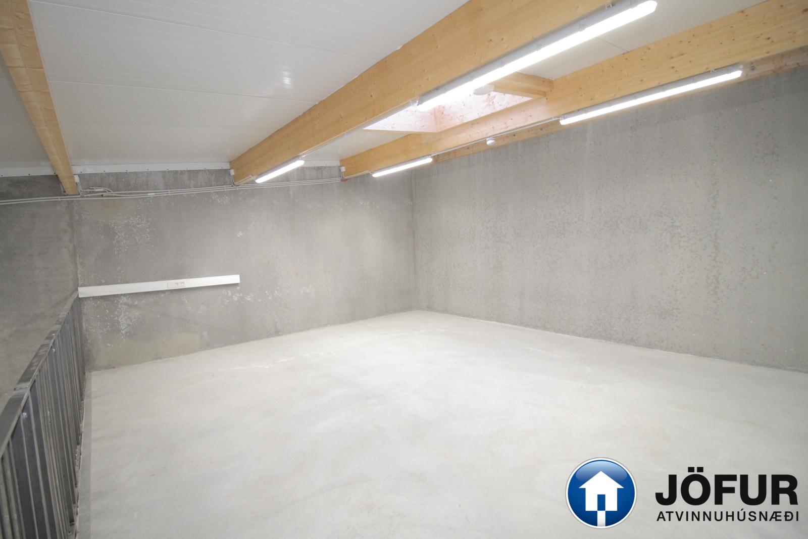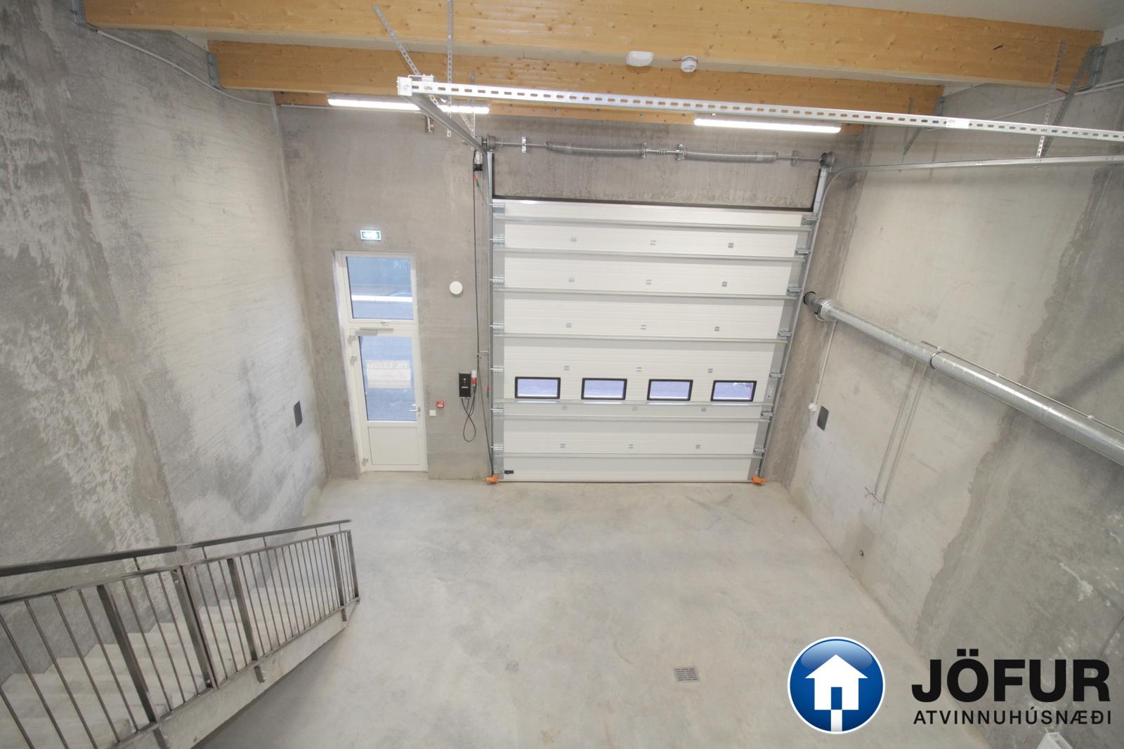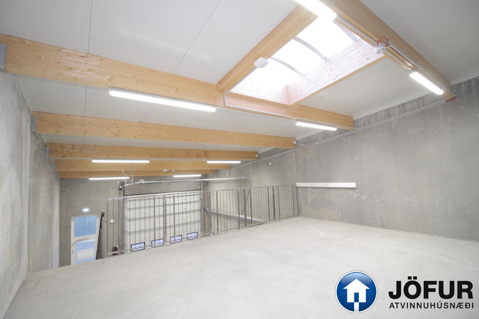 Það helsta úr skilalýsingu: Burðarvirki: Sökklar, útveggir, berandi innveggir, eru úr forsteyptum einingum. Milliplötur eru úr filigran plötum með ásteypulagi. Þakvirki: Þakið er borið upp með límtrésbitum og yleiningum frá Límtré Vírnet. Klæðning: Húsið er byggt úr forsteyptum samlokueiningum með 70 mm. forsteyptri veðurkápu sem er í ljósum lit. Gluggar og útihurðir: Gluggar og útihurðir eru verksmiðjuframl. úr timbur og áli með tvöföldu K-gleri. Innkeyrsluhurðir eru Ál-panel hurðar. Söluaðili er BM-Vallá. Loftræsting: Húsið er loftað með náttúrulegri loftræstingu opnun glugga og hurða. Í aflokuðum gluggalausum rýmum og kaffistofum verður vélræn loftræsting þar sem við á. Handrið á stiga og milliloft: Handrið eru úr málmi. Handrið á stiga/tröppum er 110 cm. með samfelldan handlista í 90 cm úr 50 mm. stálröri eða sambærilegt. Fallvörn af lagerrýmum er handriði í 110 cm. hæð. Innanhúsfrágangur: Allir léttir veggir eru gifsveggir úr blikkgrindum, klæddir með gifsplötum. Lagnir: Húsið er upphitað með hefðbundinni ofnalögn ofnum og með hitablásurum í stærri bilum. Neysluvatns og þrifalagnir eru lagðar að tengistöðum. Varmaskiptir er notaður fyrir heitt neysluvatn og er hann staðsettur við inntak í húsið. Hitastig er hámark 60°C til 65°C. Rafmagn: Töflur verða frágengnar bæði í lagnarými og sérrýmum. Ljós verða frágengin ásamt rofum og tenglum. Tenglarenna um 1 m. verður í rýmunum sem kaupendur geta bætt við eftir þörfum. Málning: Léttir veggir og milliloft verður málað í ljósum lit. Aðrir veggir og gólf verða með steypu áferð. Gólf: Gólf verða vélslípuð. Frágangur wc og kaffistofu: Á salerni verður salernisskál frágengin ásamt handlaug. Kaffistofa verður með skápum, borðplötu og skolvaski. Snjóbræðsla: Snjóbræðsla er i gangstéttum fyrir framan hús og að auki í bílastæðum fyrir hreyfihamlaða. Notast er við frárennsli ofnakerfis við snjóbræðslu. Sorp: Gert er ráð fyir sorpgerðum við húsið vestan og austan megin. Skolkranar eru stasettir á útvegg sem næst lagnarými. Lóðarfrágangur: Lóð verður frágengin, bilastæði og aðkoma malbikuð.
