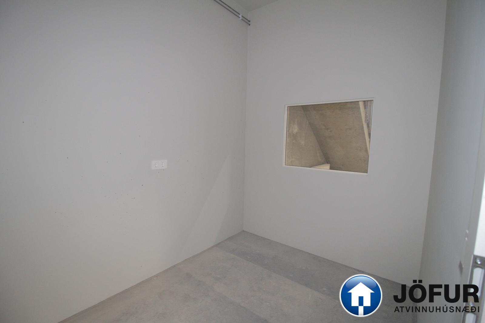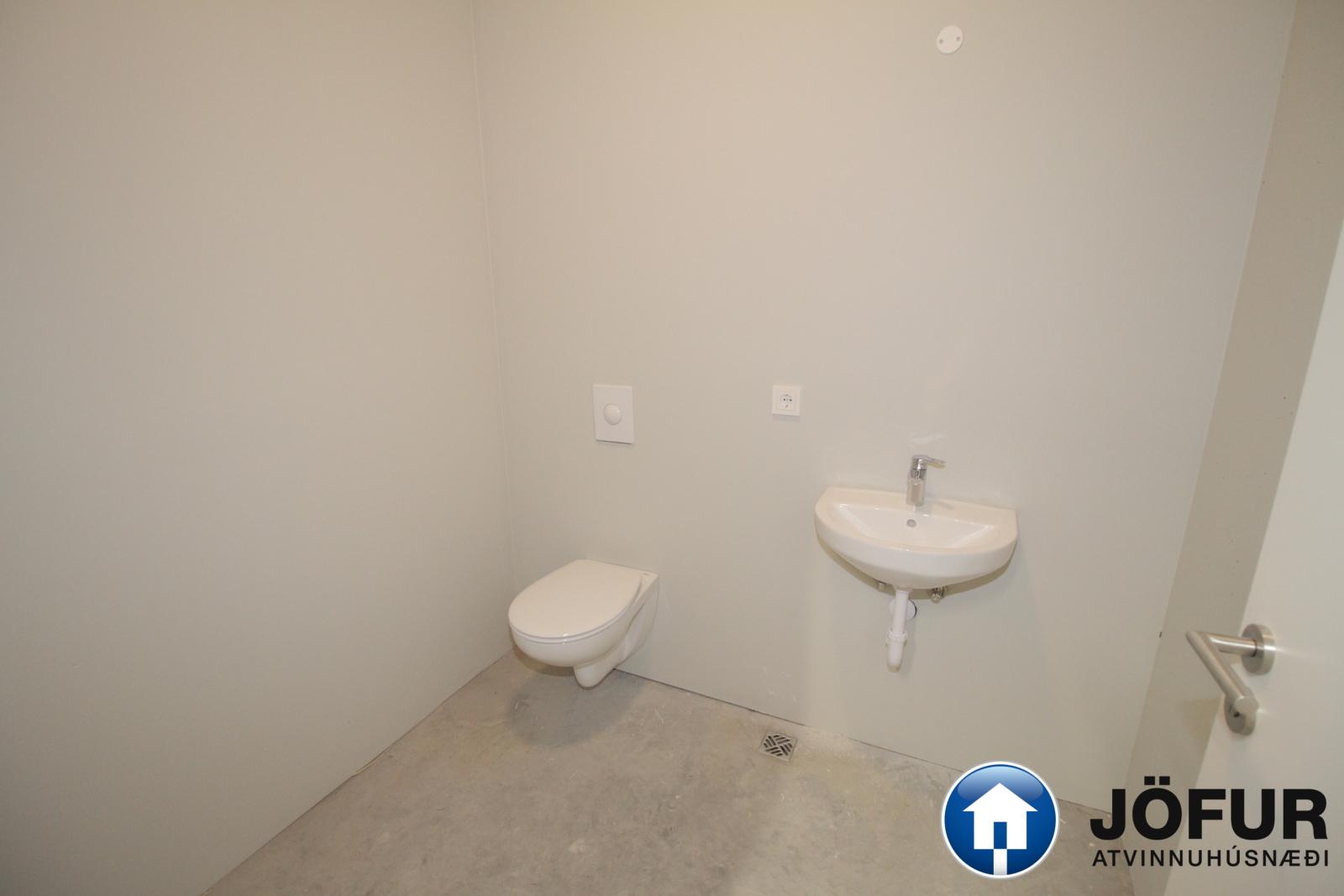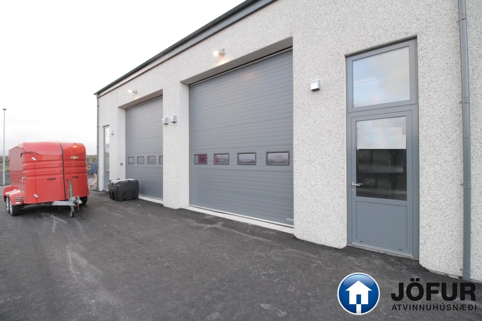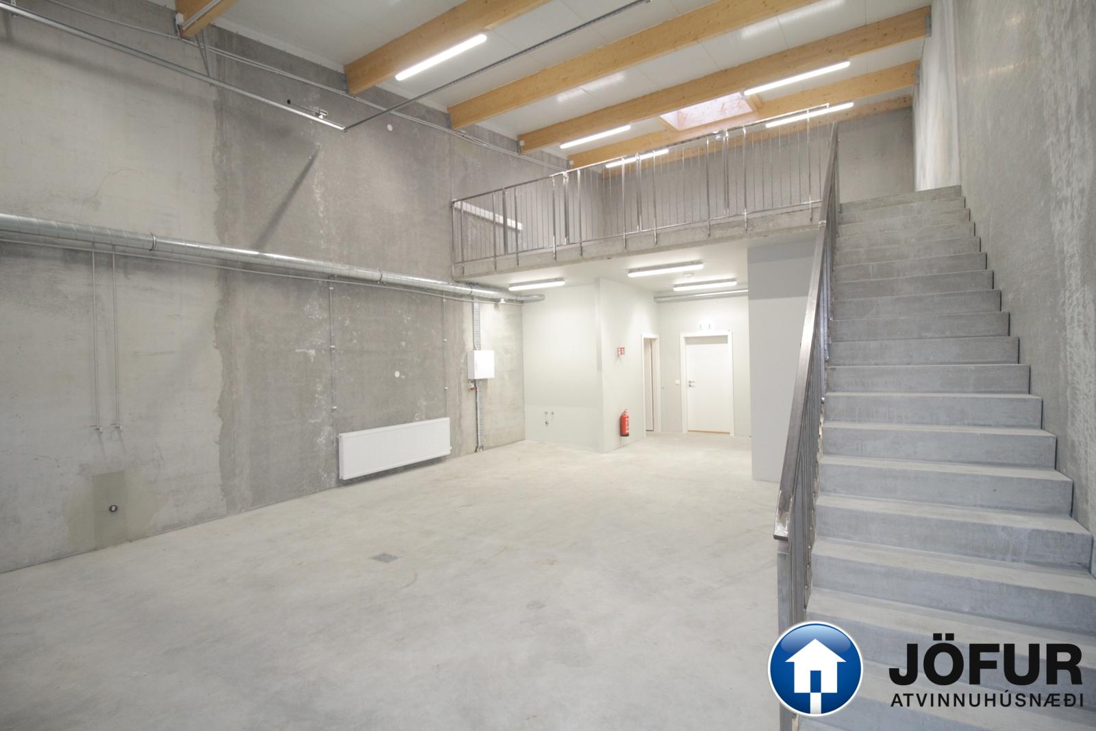 Það helsta úr skilalýsingu: Burðarvirki: Sökklar, útveggir, berandi innveggir, eru úr forsteyptum einingum. Milliplötur eru úr filigran plötum með ásteypulagi. Þakvirki: Þakið er borið upp með límtrésbitum og yleiningum frá Límtré Vírnet. Klæðning: Húsið er byggt úr forsteyptum samlokueiningum með 70 mm. forsteyptri veðurkápu sem er í ljósum lit. Gluggar og útihurðir: Gluggar og útihurðir eru verksmiðjuframl. úr timbur og áli með tvöföldu K-gleri. Innkeyrsluhurðir eru Ál-panel hurðar. Söluaðili er BM-Vallá. Loftræsting: Húsið er loftað með náttúrulegri loftræstingu opnun glugga og hurða. Í aflokuðum gluggalausum rýmum og kaffistofum verður vélræn loftræsting þar sem við á. Handrið á stiga og milliloft: Handrið eru úr málmi. Handrið á stiga/tröppum er 110 cm. með samfelldan handlista í 90 cm úr 50 mm. stálröri eða sambærilegt. Fallvörn af lagerrýmum er handriði í 110 cm. hæð. Innanhúsfrágangur: Allir léttir veggir eru gifsveggir úr blikkgrindum, klæddir með gifsplötum. Lagnir: Húsið er upphitað með hefðbundinni ofnalögn ofnum og með hitablásurum í stærri bilum. Neysluvatns og þrifalagnir eru lagðar að tengistöðum. Varmaskiptir er notaður fyrir heitt neysluvatn og er hann staðsettur við inntak í húsið. Hitastig er hámark 60°C til 65°C. Rafmagn: Töflur verða frágengnar bæði í lagnarými og sérrýmum. Ljós verða frágengin ásamt rofum og tenglum. Tenglarenna um 1 m. verður í rýmunum sem kaupendur geta bætt við eftir þörfum. Málning: Léttir veggir og milliloft verður málað í ljósum lit. Aðrir veggir og gólf verða með steypu áferð. Gólf: Gólf verða vélslípuð. Frágangur wc og kaffistofu: Á salerni verður salernisskál frágengin ásamt handlaug. Kaffistofa verður með skápum, borðplötu og skolvaski. Snjóbræðsla: Snjóbræðsla er i gangstéttum fyrir framan hús og að auki í bílastæðum fyrir hreyfihamlaða. Notast er við frárennsli ofnakerfis við snjóbræðslu. Sorp: Gert er ráð fyir sorpgerðum við húsið vestan og austan megin. Skolkranar eru stasettir á útvegg sem næst lagnarými. Lóðarfrágangur: Lóð verður frágengin, bilastæði og aðkoma malbikuð.