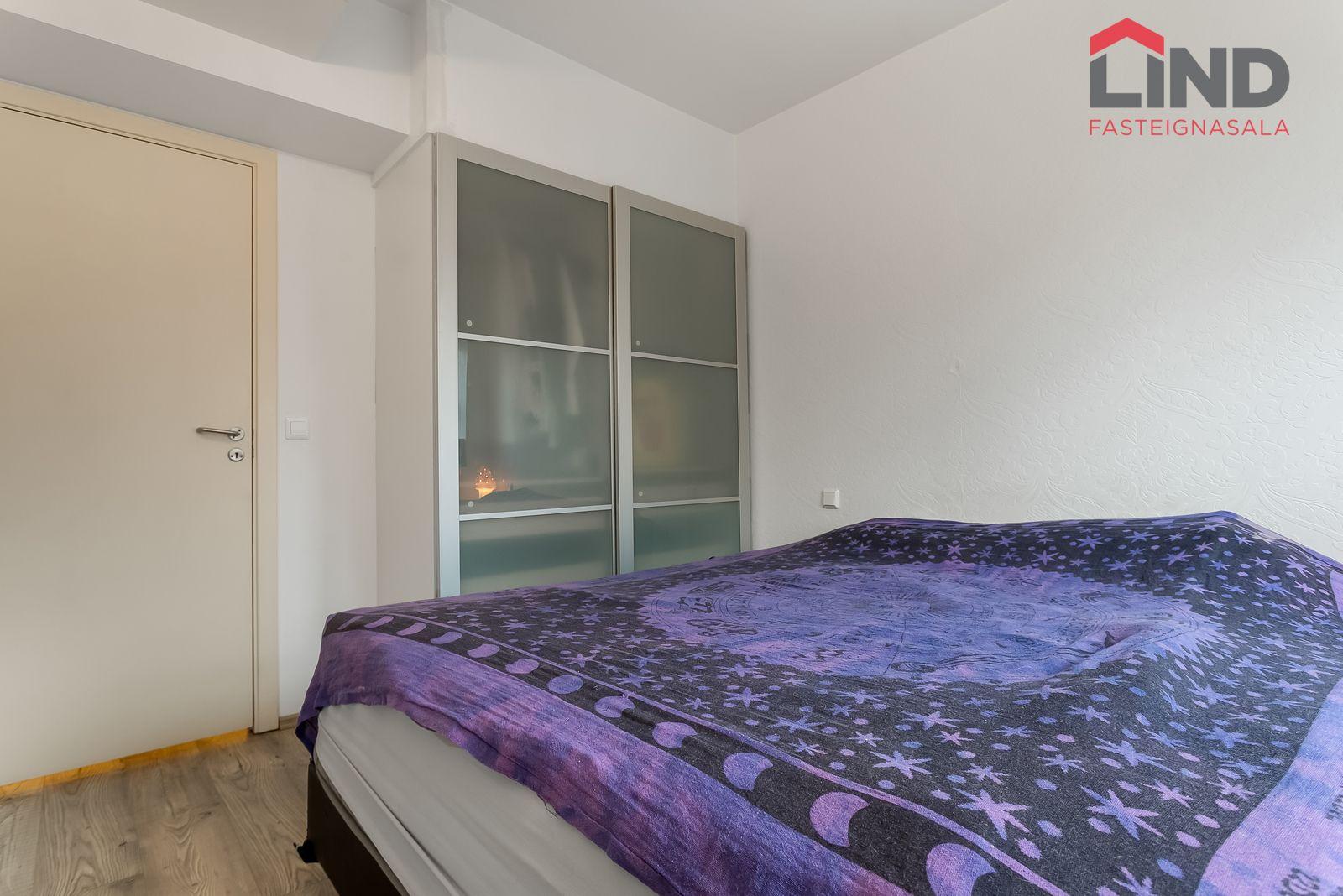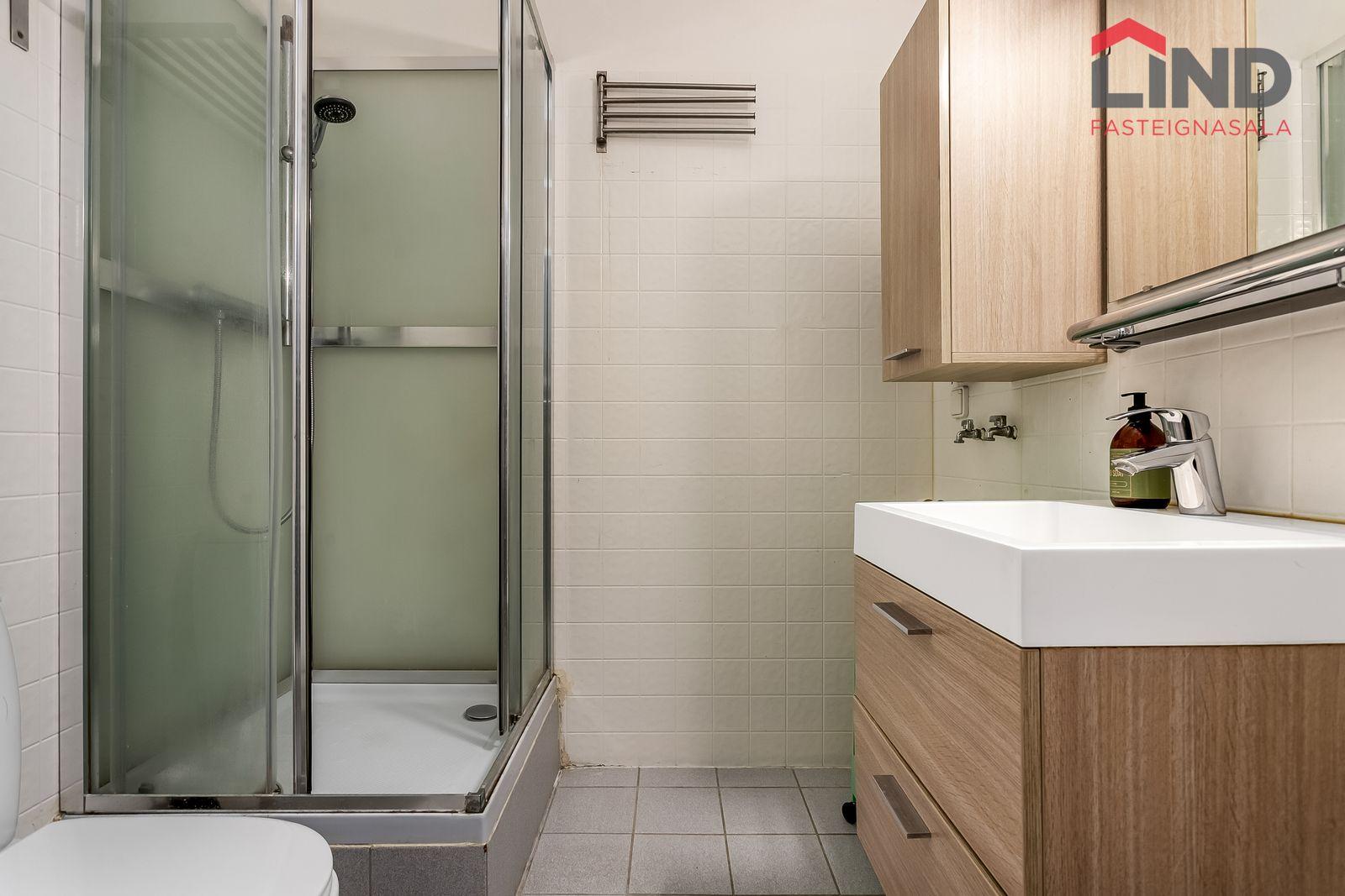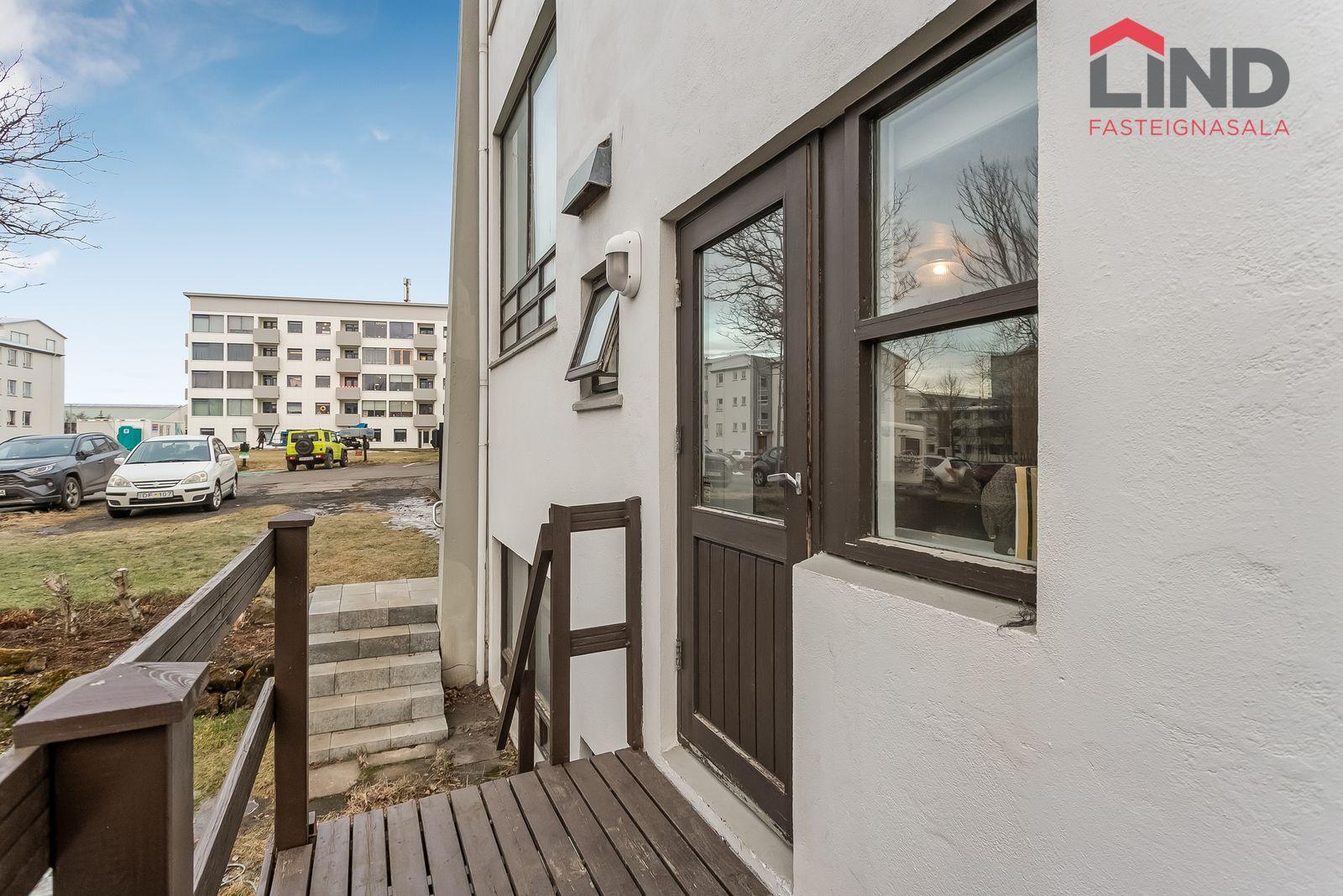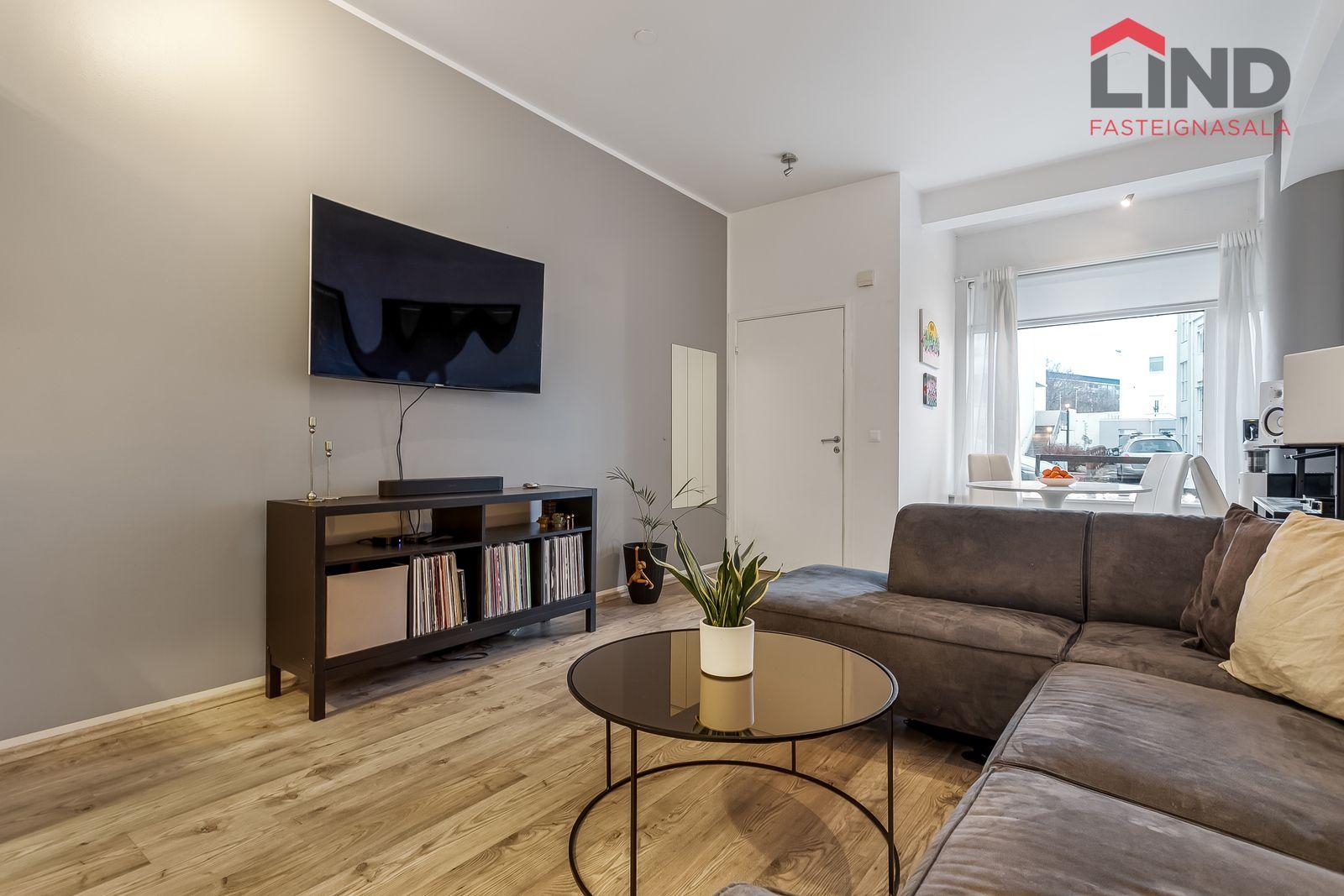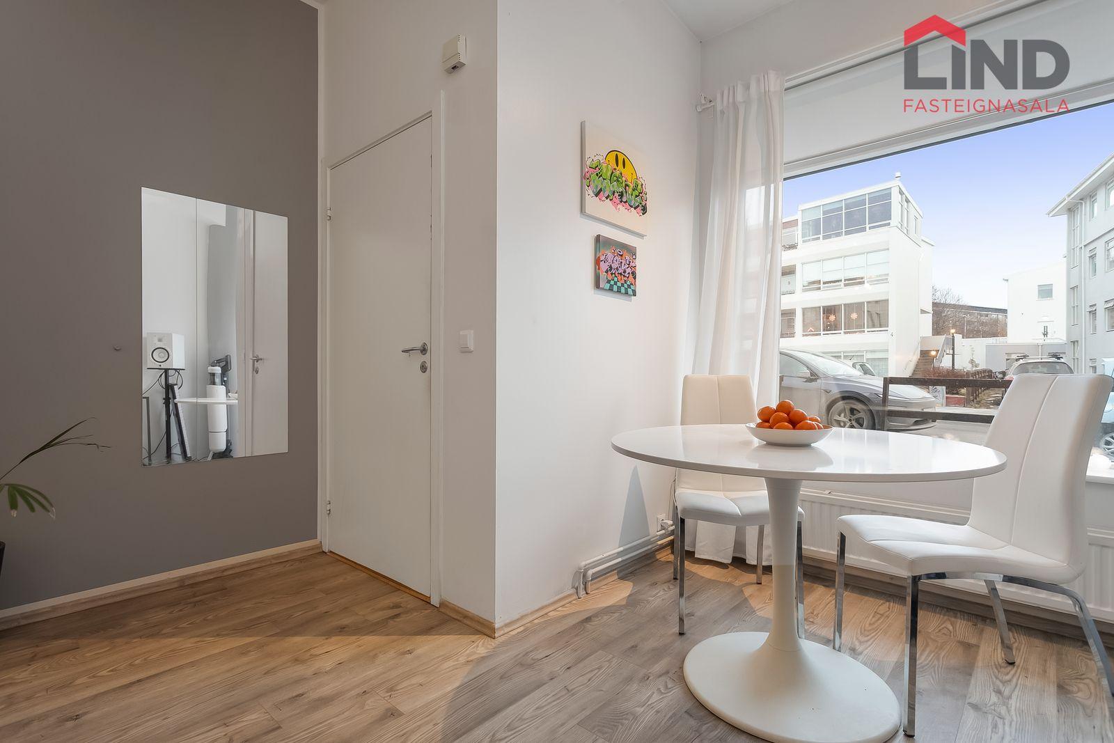 Nánari lýsing Forstofan er flísalögð með fatahengi. Stofa og eldhús eru í opnu og björtu rými með parketi á gólfum. Svefnherbergi er parketlagt með fataskáp og þaðan er gengið út í bakgarðinn. Baðherbergi er flísalagt og þar er salerni, sturtuklefi og innrétting með handlaug. Á baðherbergi er tengi fyrir þvottavél. Sameiginlegt þvottahús með þurrkaðstöðu og vagna- og hjólageymslu er í kjallara. Sér geymsla fylgir íbúðinni, hún er 6,2 m2 og er staðsett í kjallara.
