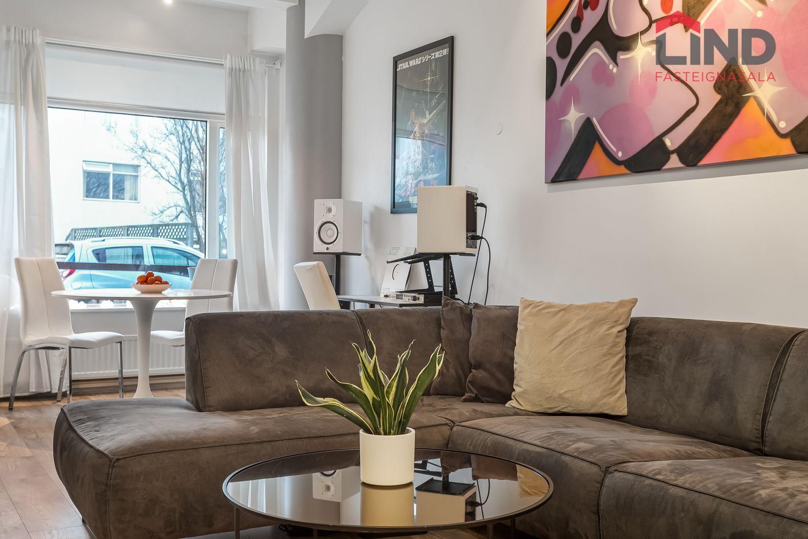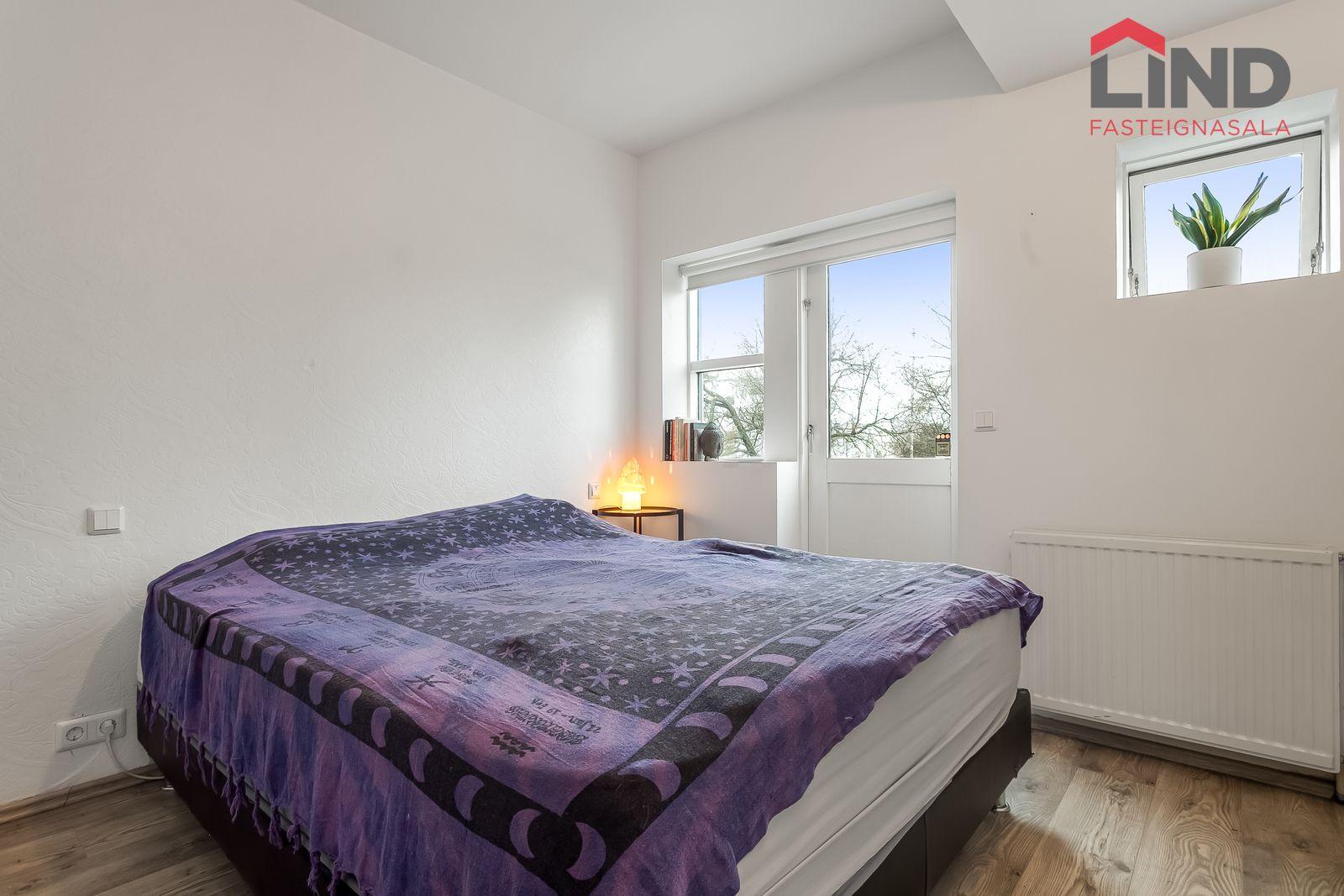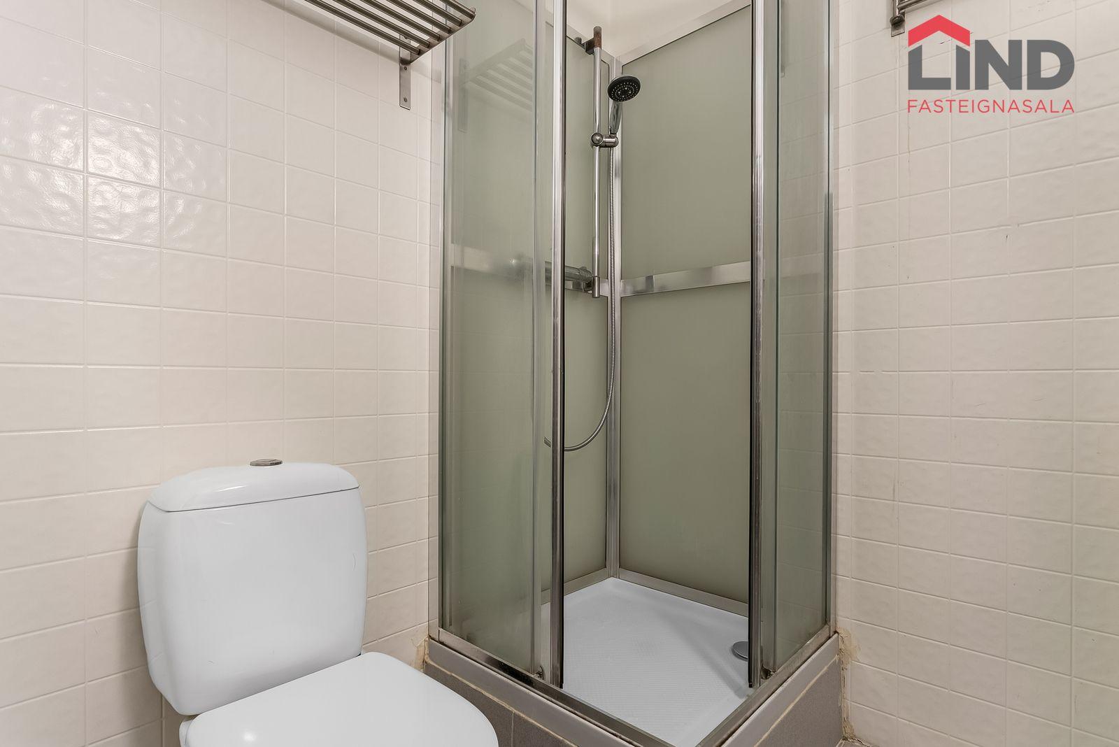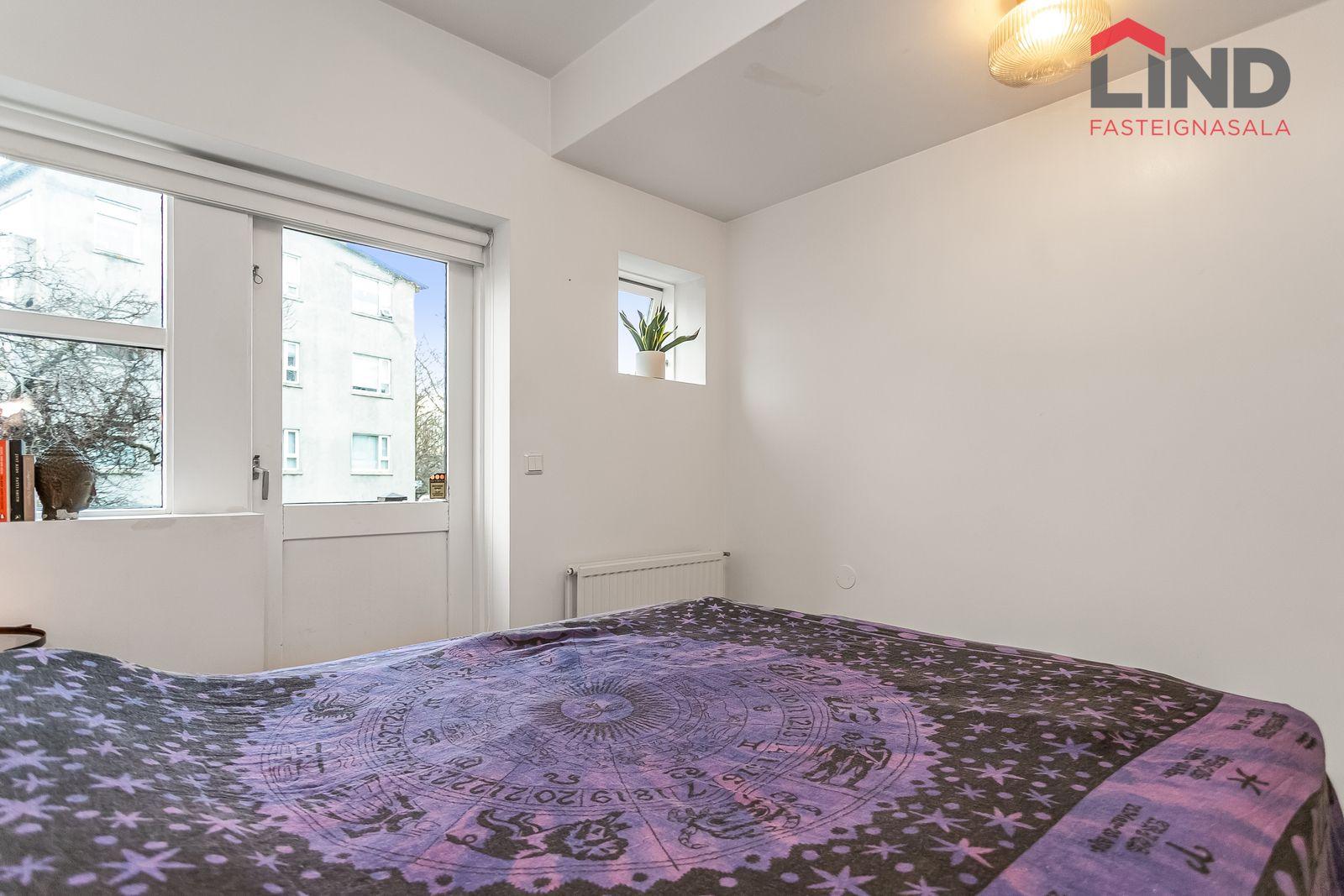 Nánari lýsing Forstofan er flísalögð með fatahengi. Stofa og eldhús eru í opnu og björtu rými með parketi á gólfum. Svefnherbergi er parketlagt með fataskáp og þaðan er gengið út í bakgarðinn. Baðherbergi er flísalagt og þar er salerni, sturtuklefi og innrétting með handlaug. Á baðherbergi er tengi fyrir þvottavél. Sameiginlegt þvottahús með þurrkaðstöðu og vagna- og hjólageymslu er í kjallara. Sér geymsla fylgir íbúðinni, hún er 6,2 m2 og er staðsett í kjallara.