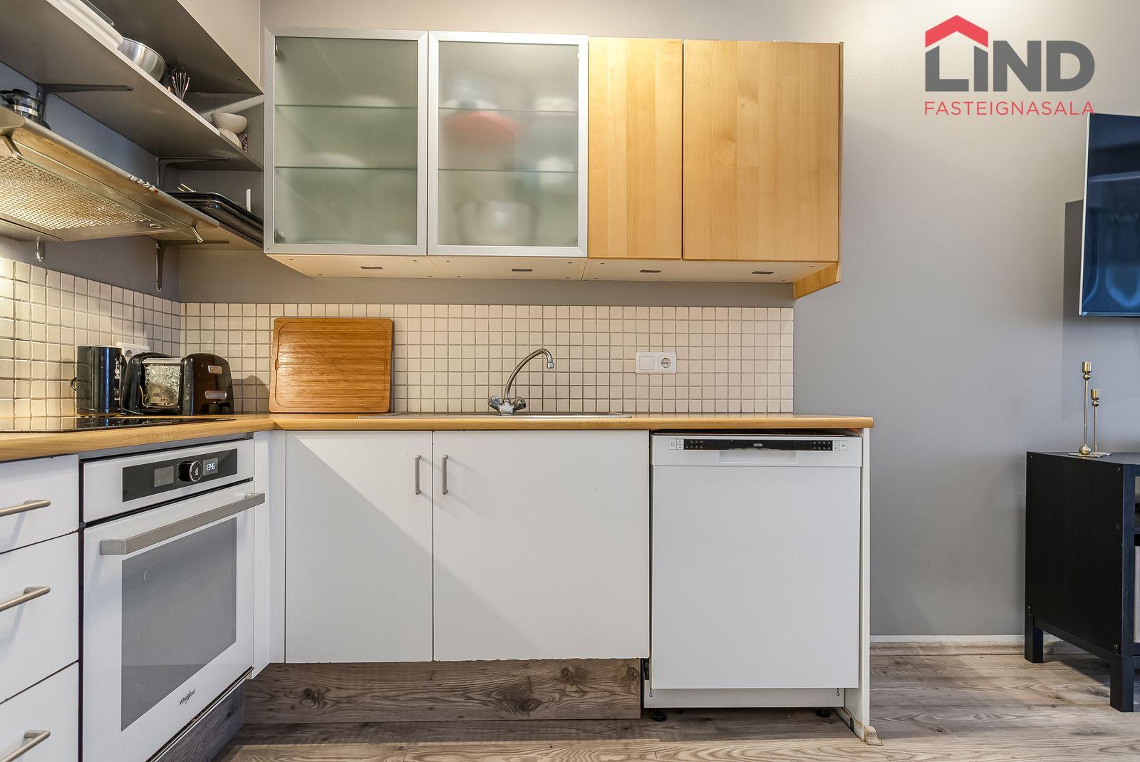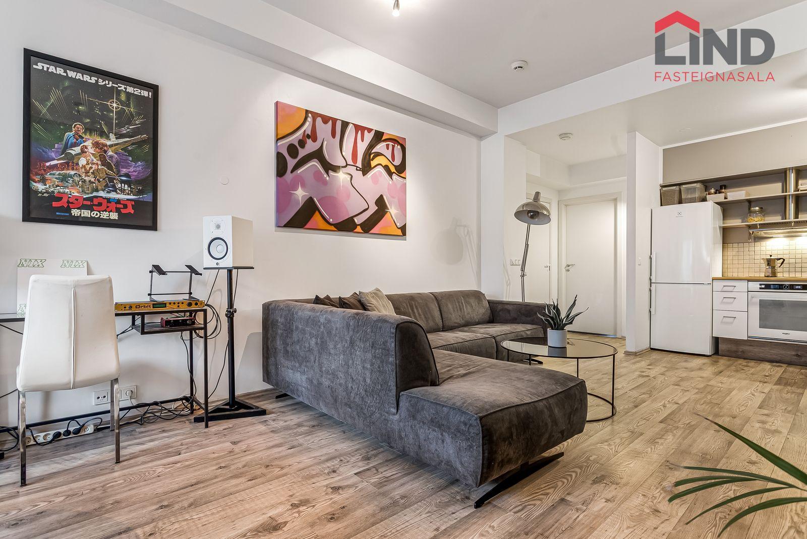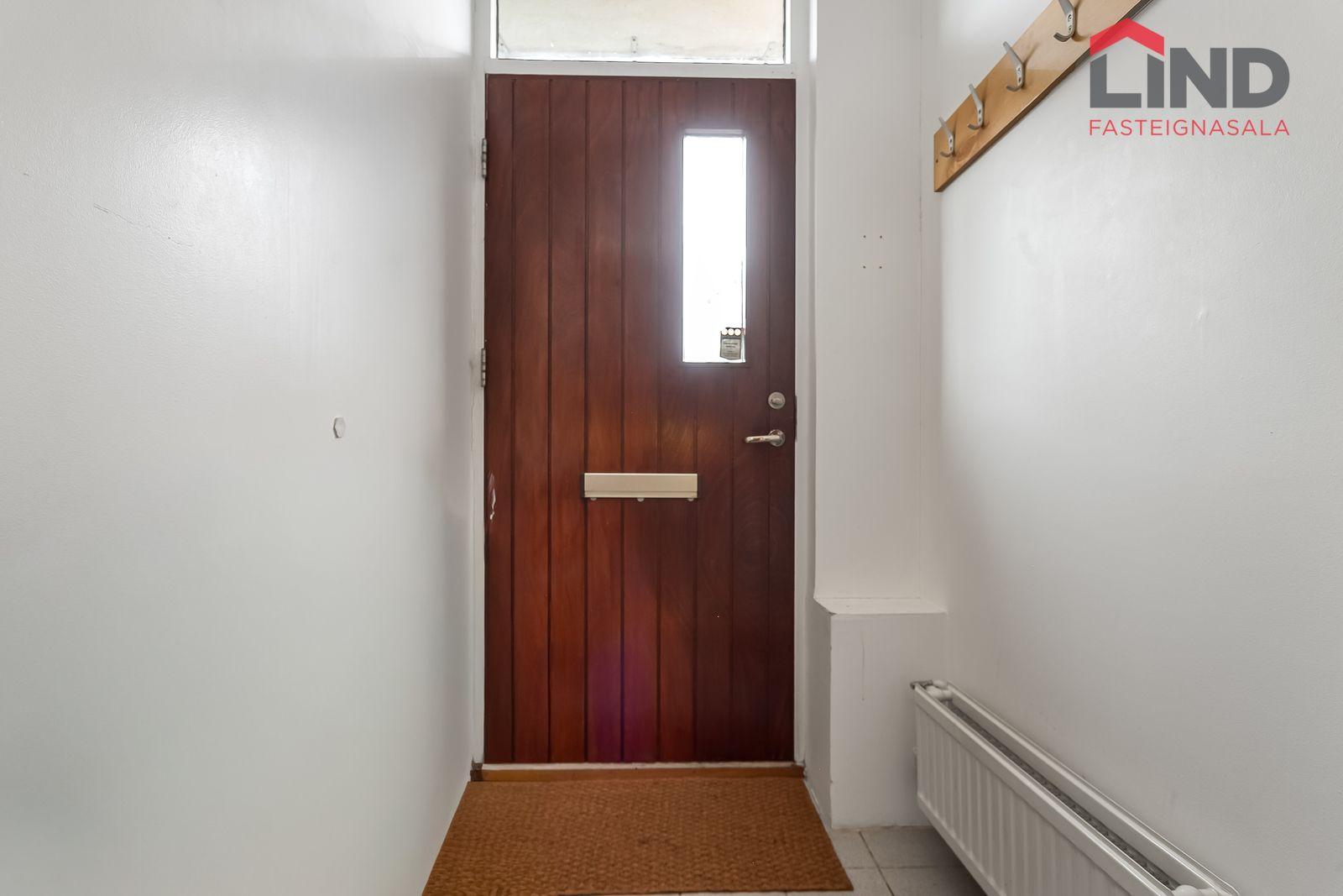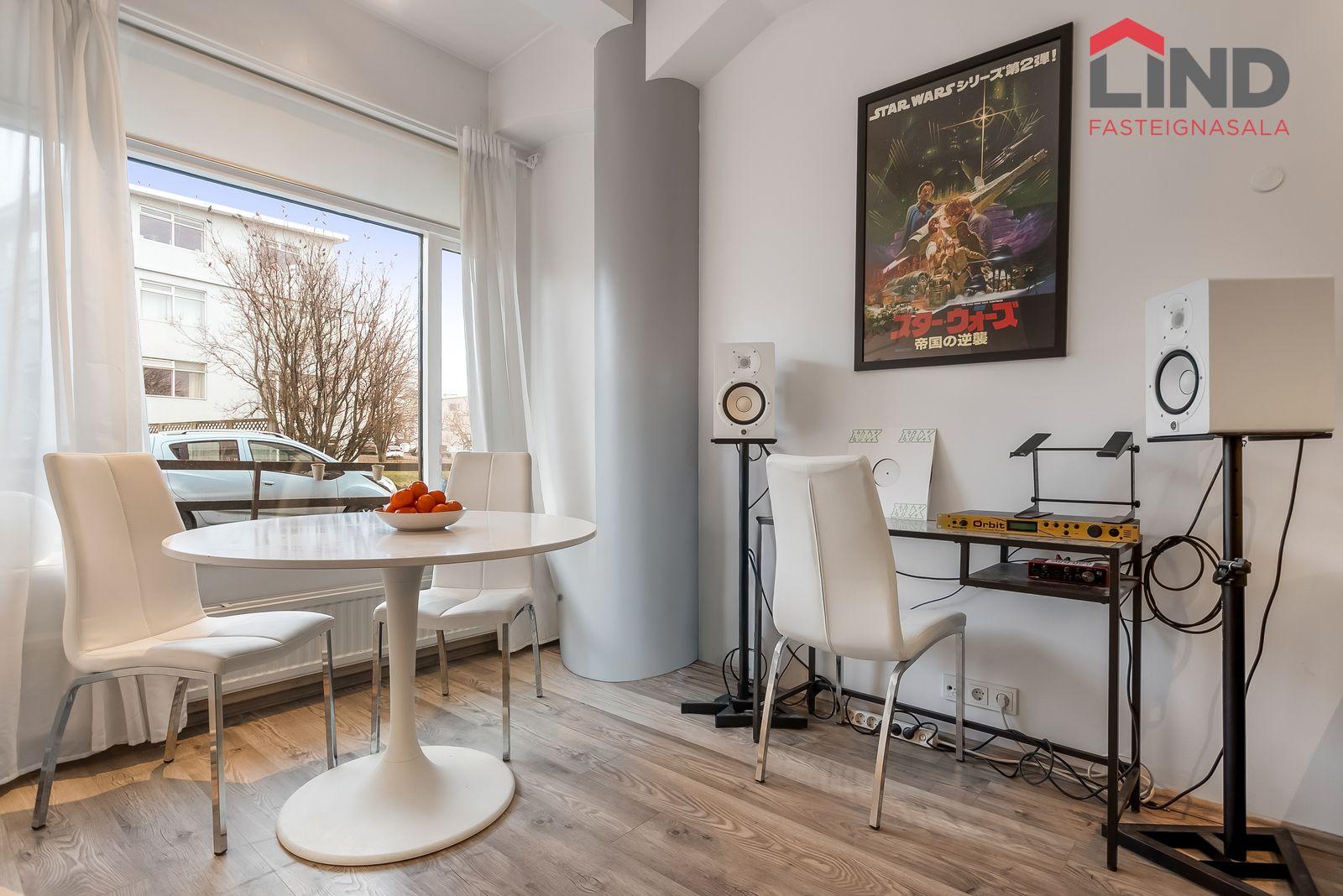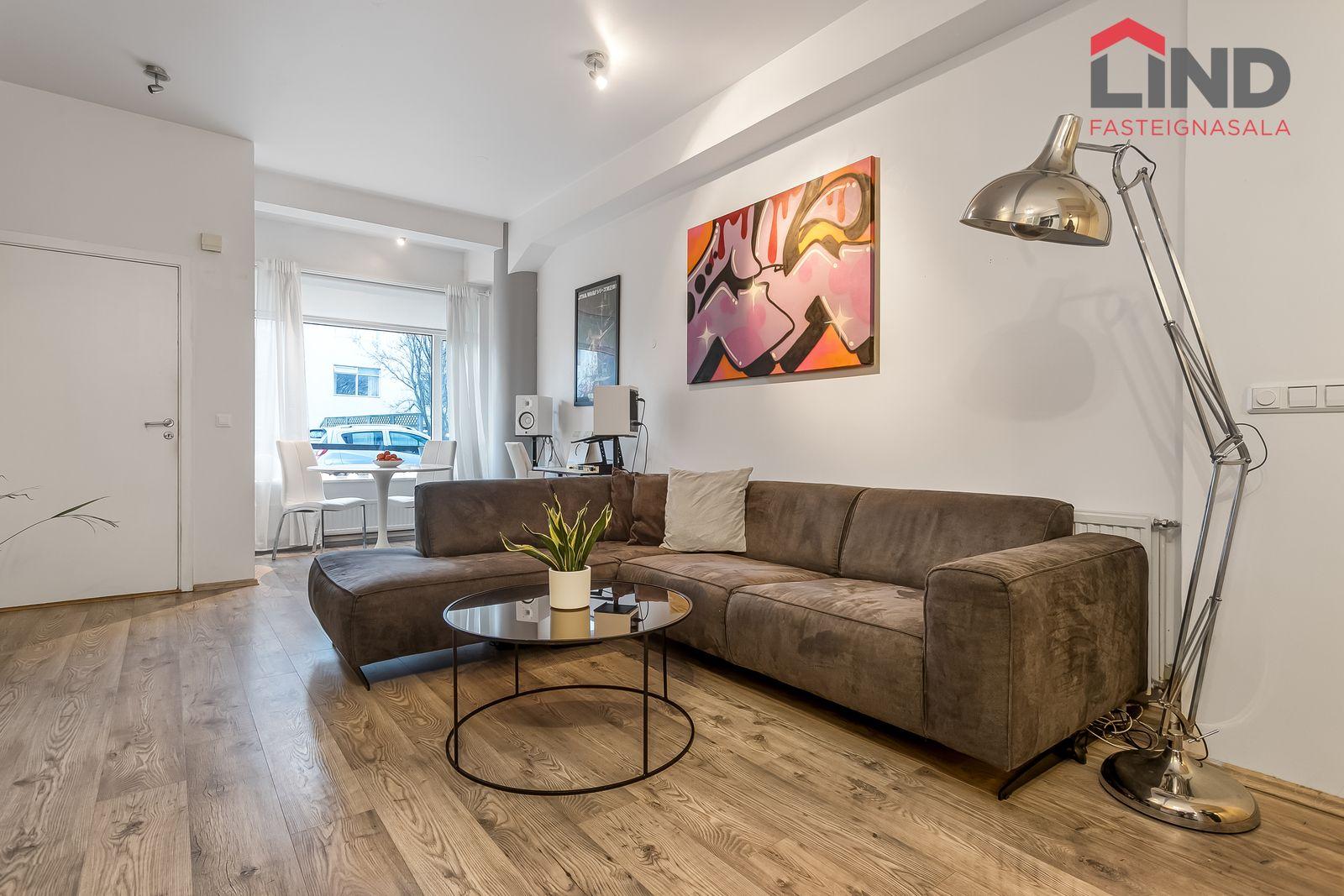 Nánari lýsing Forstofan er flísalögð með fatahengi. Stofa og eldhús eru í opnu og björtu rými með parketi á gólfum. Svefnherbergi er parketlagt með fataskáp og þaðan er gengið út í bakgarðinn. Baðherbergi er flísalagt og þar er salerni, sturtuklefi og innrétting með handlaug. Á baðherbergi er tengi fyrir þvottavél. Sameiginlegt þvottahús með þurrkaðstöðu og vagna- og hjólageymslu er í kjallara. Sér geymsla fylgir íbúðinni, hún er 6,2 m2 og er staðsett í kjallara.