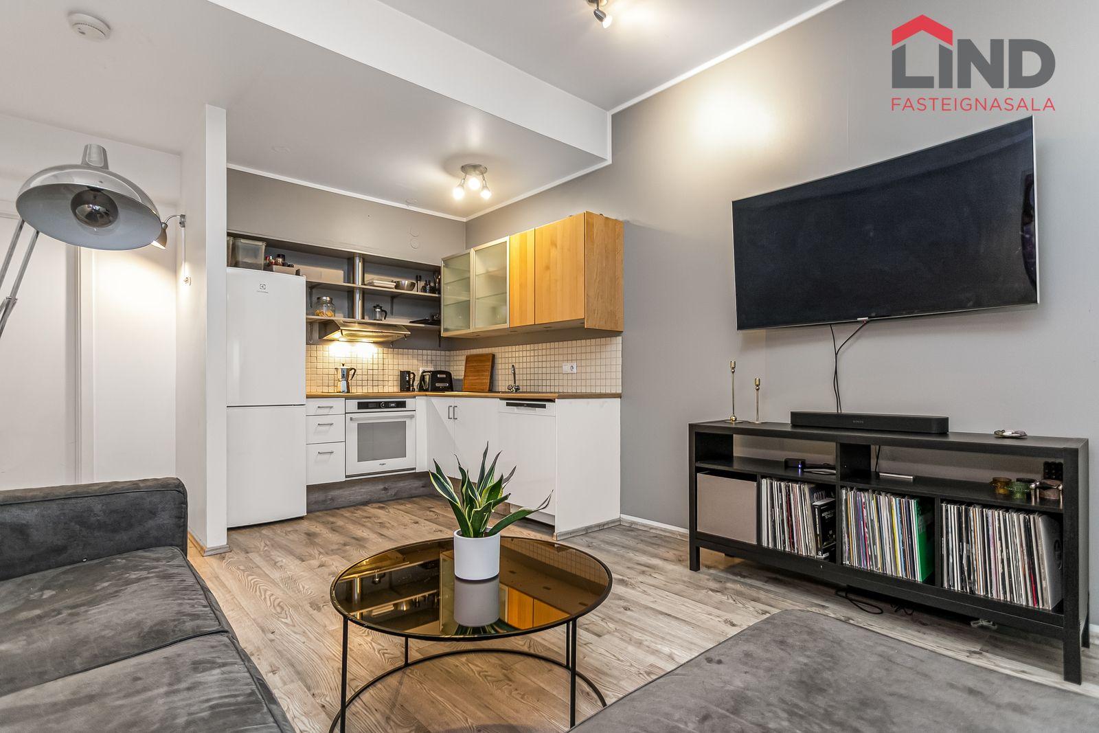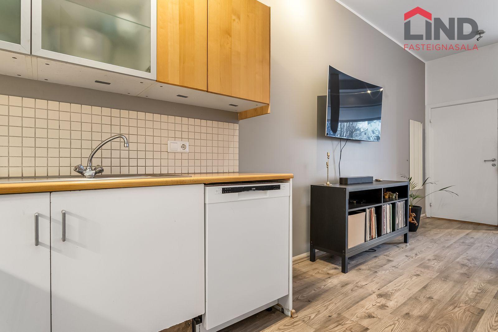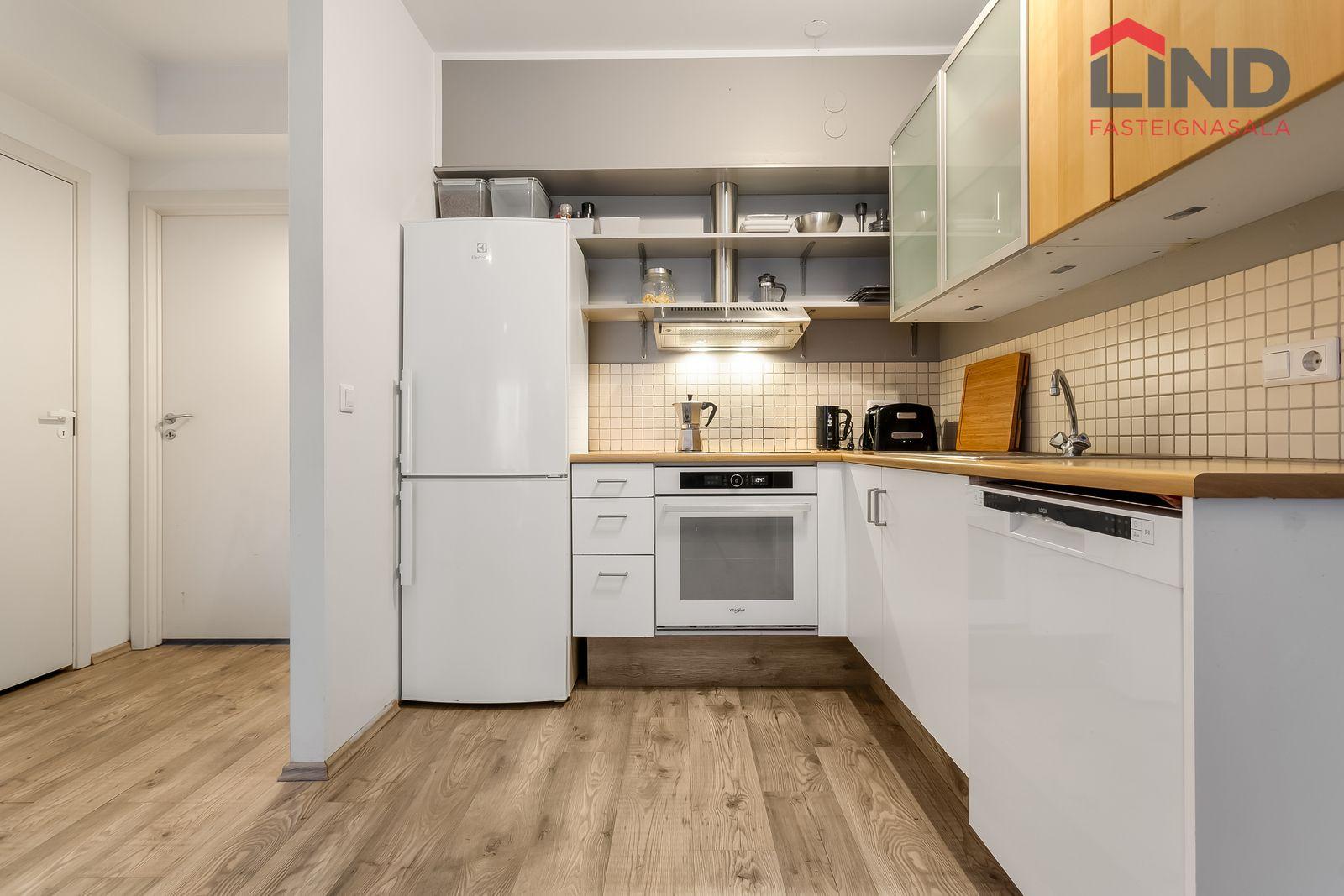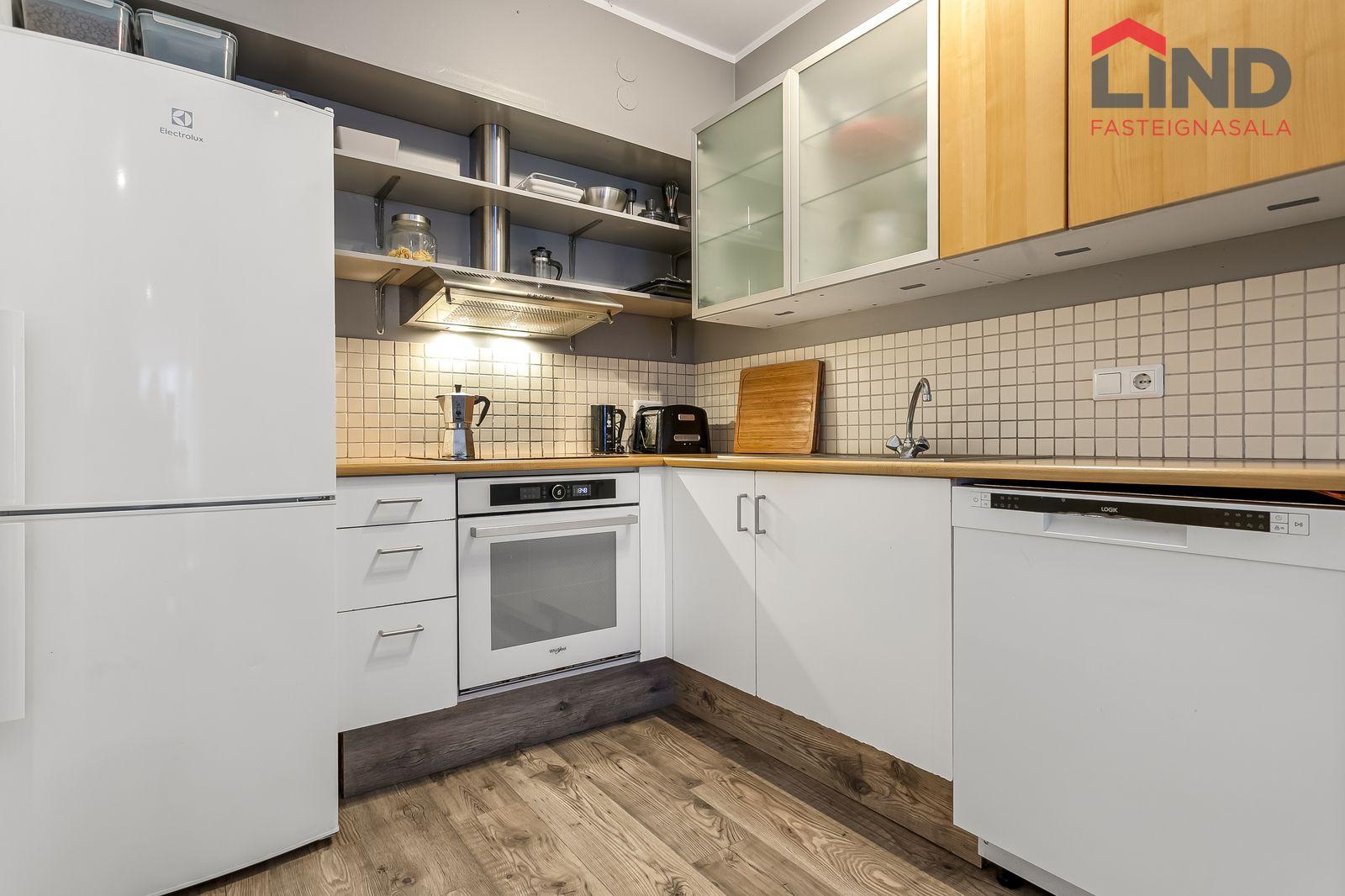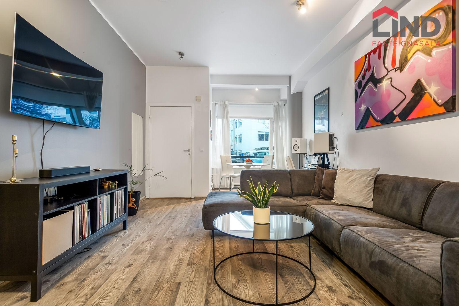 Nánari lýsing Forstofan er flísalögð með fatahengi. Stofa og eldhús eru í opnu og björtu rými með parketi á gólfum. Svefnherbergi er parketlagt með fataskáp og þaðan er gengið út í bakgarðinn. Baðherbergi er flísalagt og þar er salerni, sturtuklefi og innrétting með handlaug. Á baðherbergi er tengi fyrir þvottavél. Sameiginlegt þvottahús með þurrkaðstöðu og vagna- og hjólageymslu er í kjallara. Sér geymsla fylgir íbúðinni, hún er 6,2 m2 og er staðsett í kjallara.