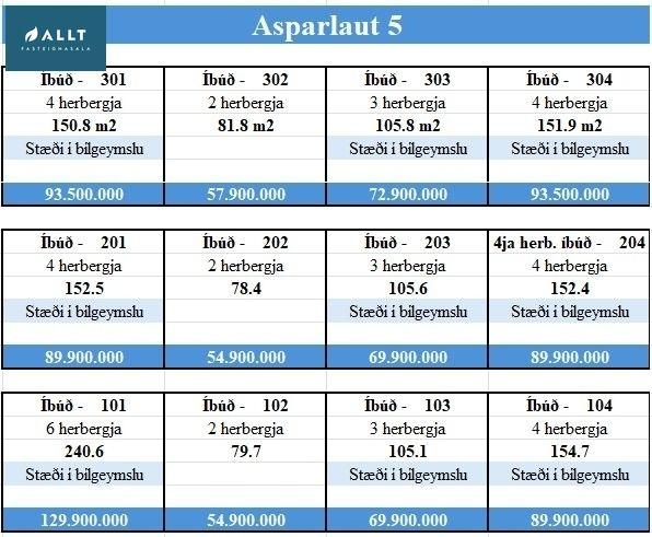 ALLT fasteignasala kynnir til sölu glæsilegar eignir í einu vinsælasta hverfi Reykjanesbæjar: Asparlaut 5, íbúð 104 er á efstu hæð í fullbúnu, 12 íbúða, nýju fjölbýlishúsi í Hlíðarhverfi. Birt stærð eignarinnar er 151.9 fm. Eigninni fylgir mjög rúmgóð geymsla (16,7 fm) og stæði í bílgeymslu. Eignin er vönduð, hefur 3 rúmgóð svefnherbergi, tvö baðherbergi, þvottahús. Sjónvarpsrými er á herbergisgangi. Eldhús, borðstofa og stofa eru í opnu björtu rými þar sem útgengt er út á sólríkar svalir (10,1 fm). Góð forstofa. Eignin hefur sér inngang og lyfta er í húsinu.