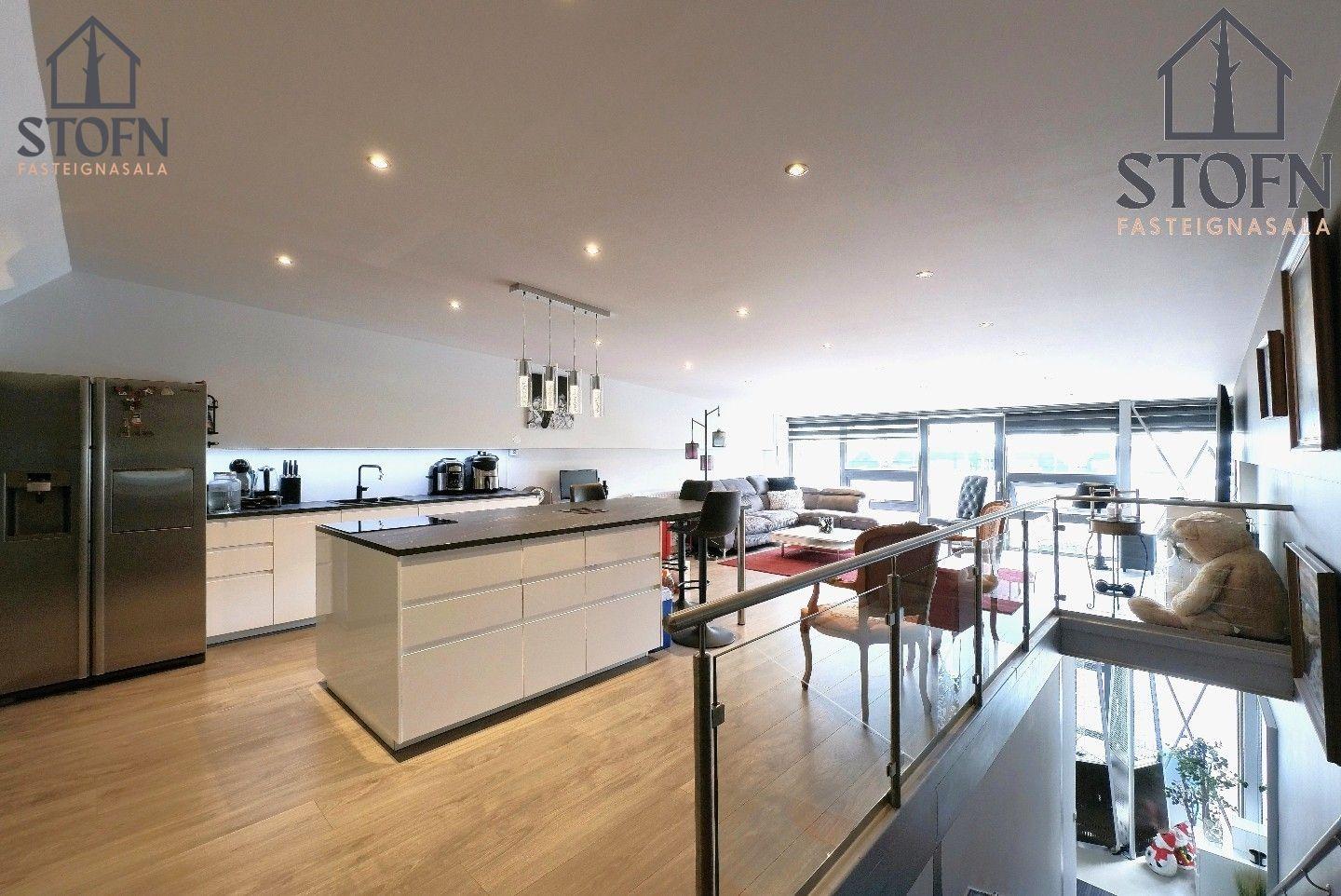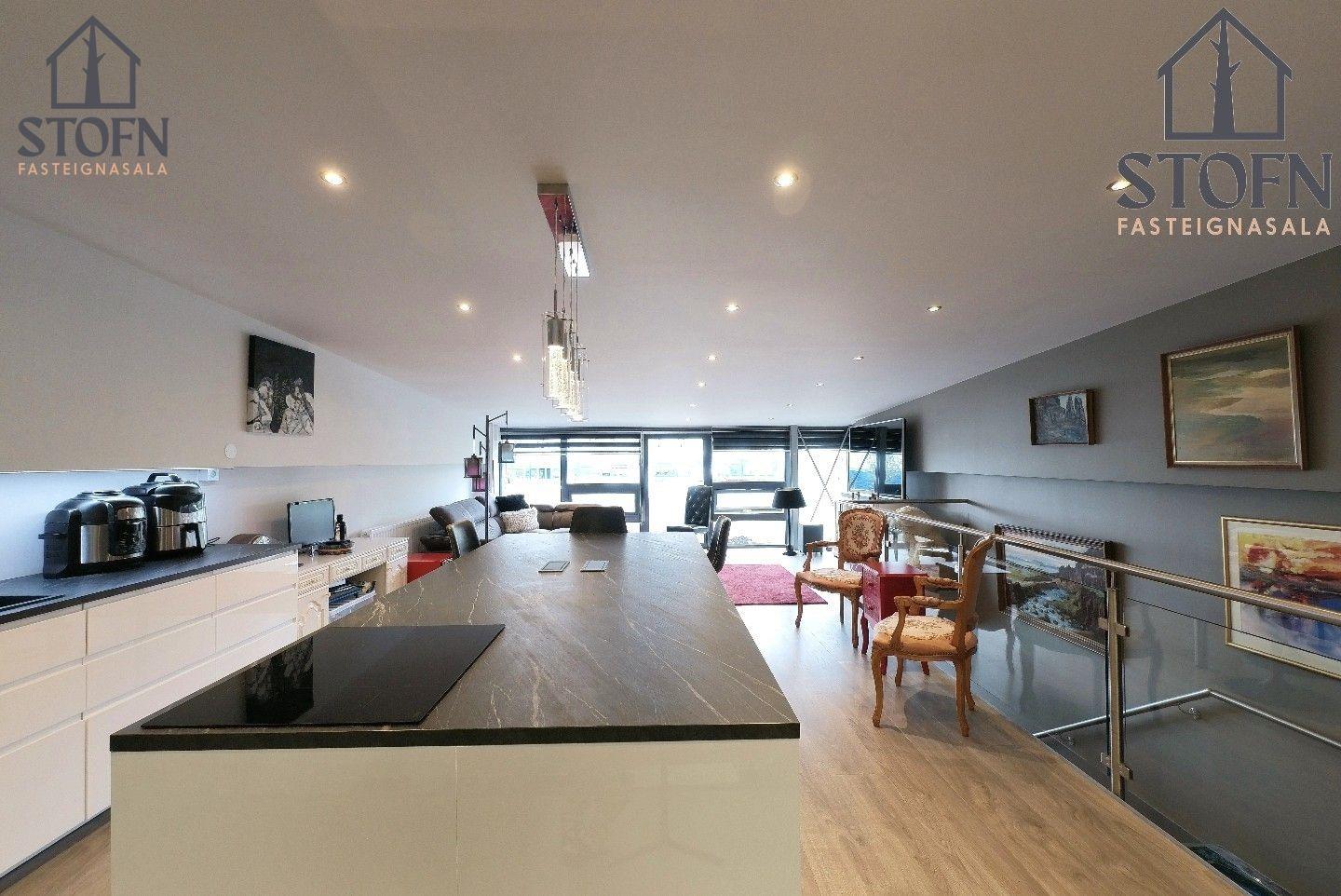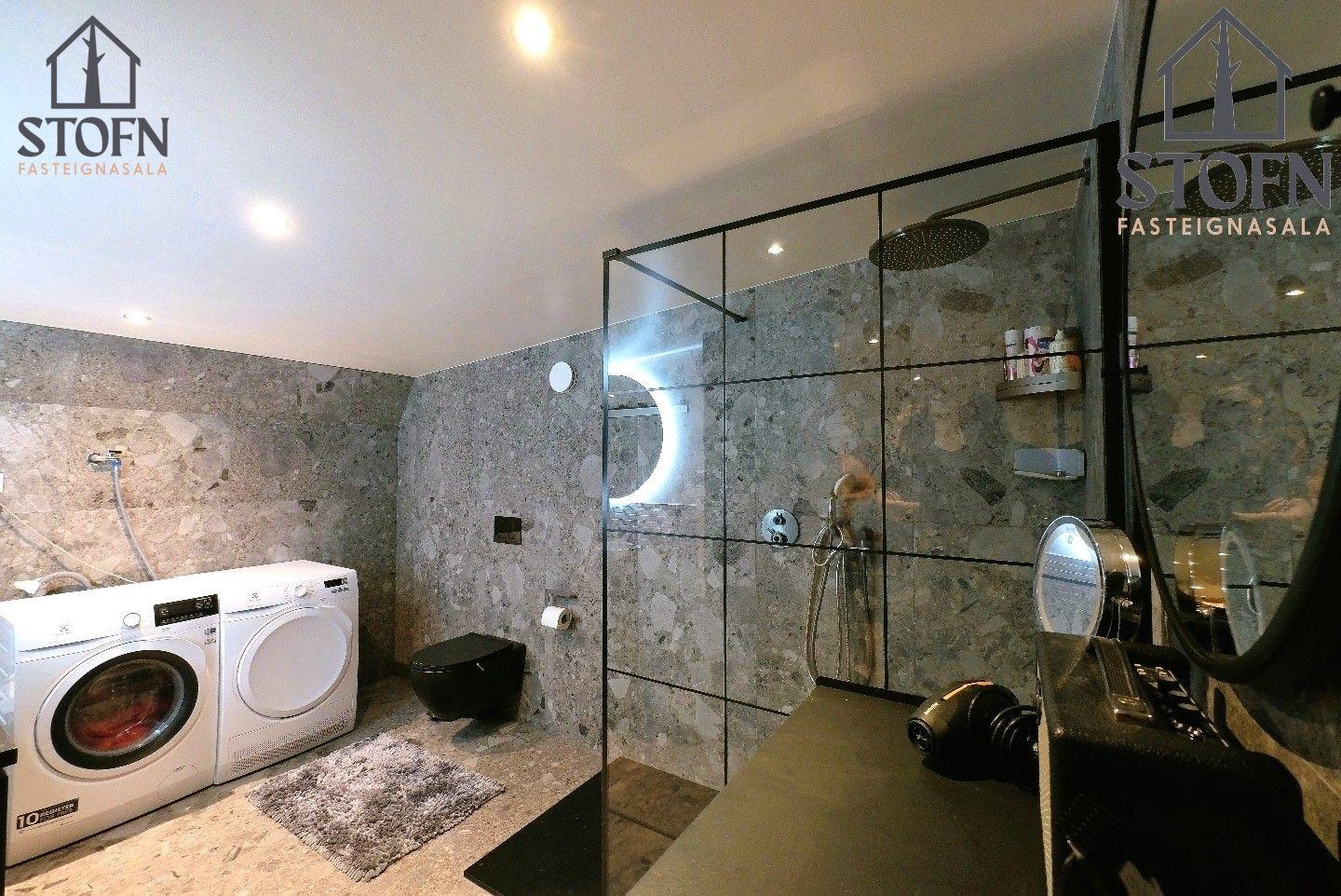 Efri hæð – 125 fm Stigi úr stáli með glerhandriði tengir rýmin. Björt stofa með parketi og möguleika á svalahurð. Eldhús með góðri vinnuaðstöðu og stórri eyju. Opið skipulag milli hæða með snyrtilegum handriðum. Rúmgott svefnherbergi með skápaplássi. Auka herbergi sem hentar sem skrifstofa eða svefnherbergi. Baðherbergi með sturtu úr hertu gleri, upphengdu salerni og flísum – tengi fyrir þvottavél og þurrkara.