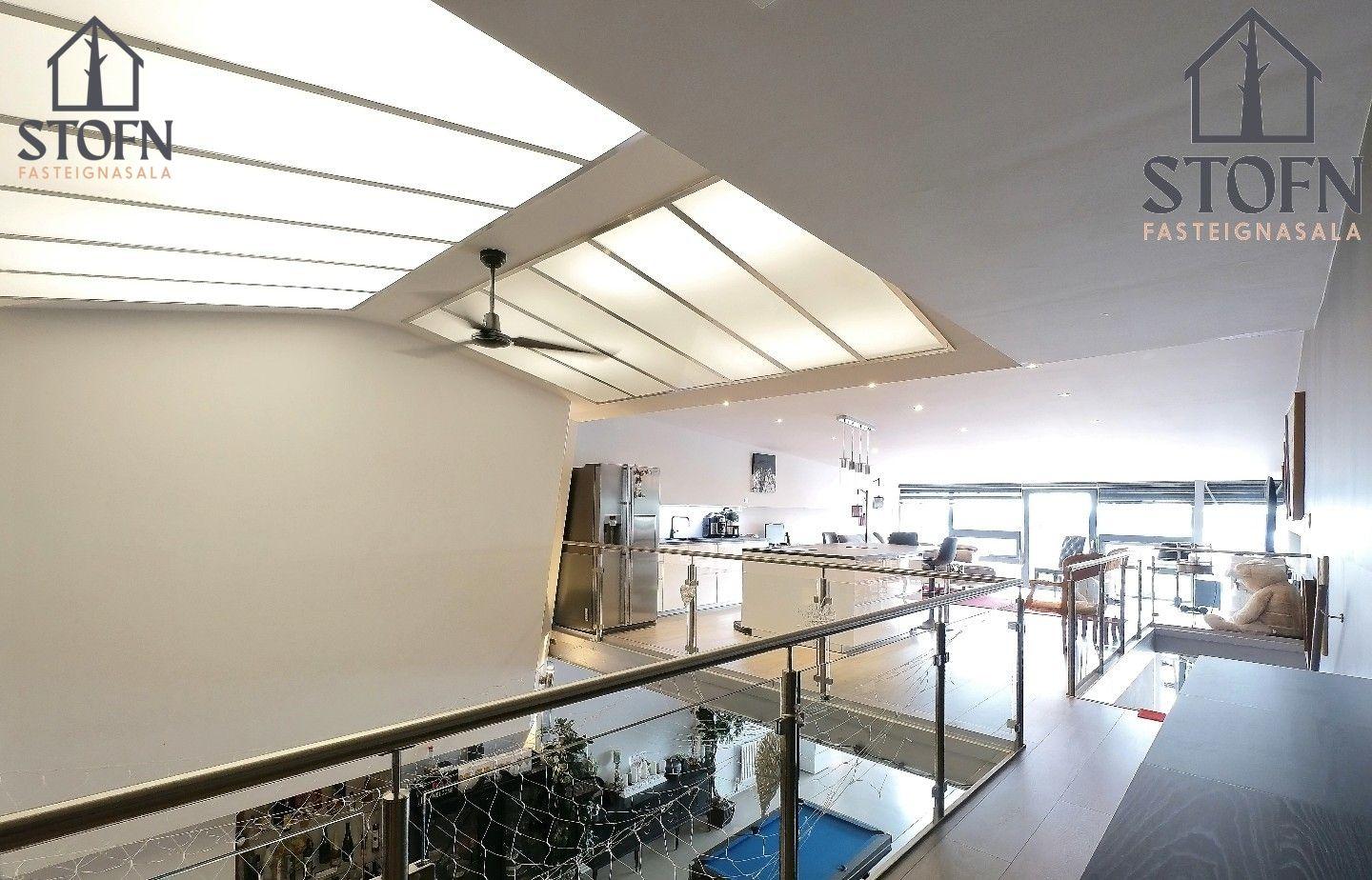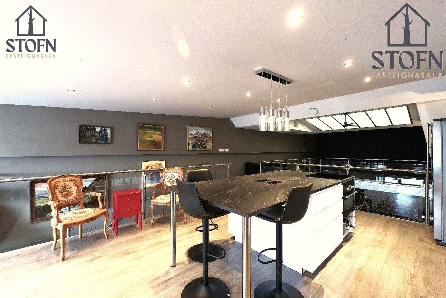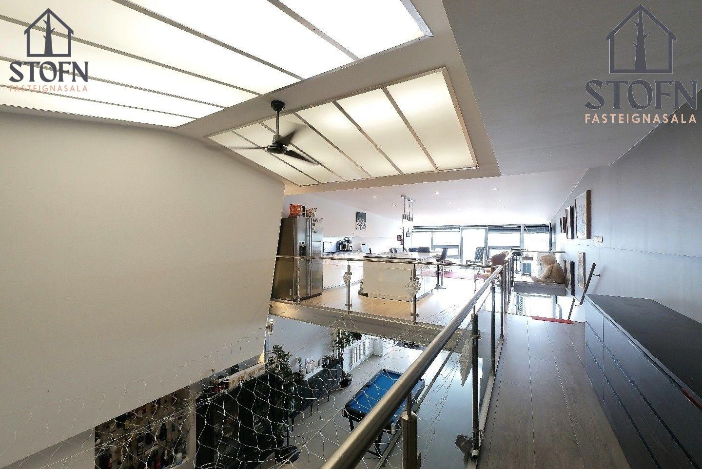 Efri hæð – 125 fm Stigi úr stáli með glerhandriði tengir rýmin. Björt stofa með parketi og möguleika á svalahurð. Eldhús með góðri vinnuaðstöðu og stórri eyju. Opið skipulag milli hæða með snyrtilegum handriðum. Rúmgott svefnherbergi með skápaplássi. Auka herbergi sem hentar sem skrifstofa eða svefnherbergi. Baðherbergi með sturtu úr hertu gleri, upphengdu salerni og flísum – tengi fyrir þvottavél og þurrkara.