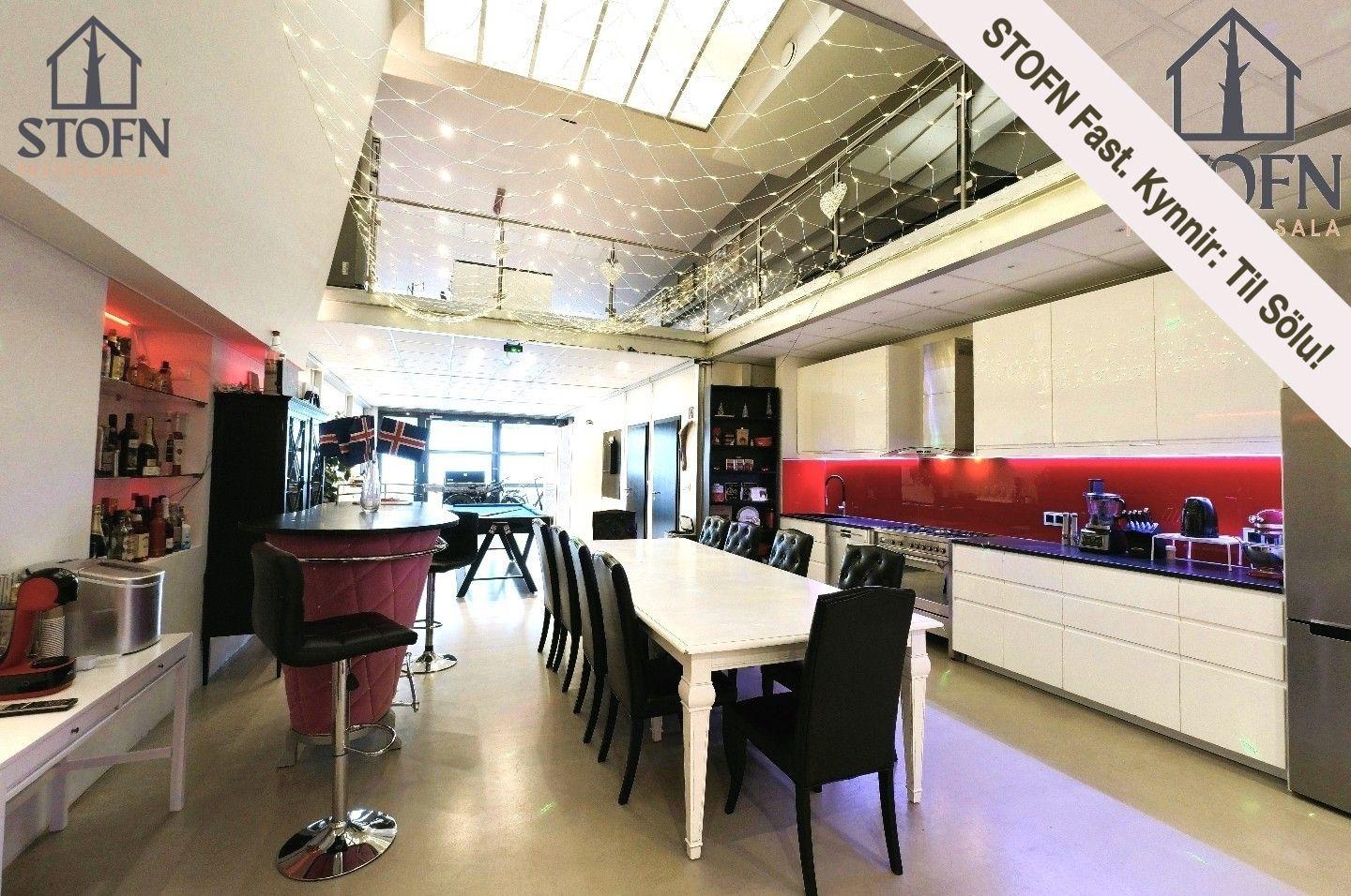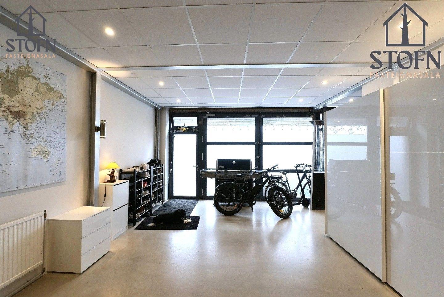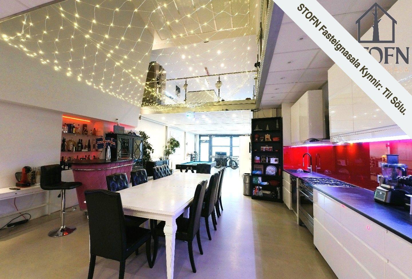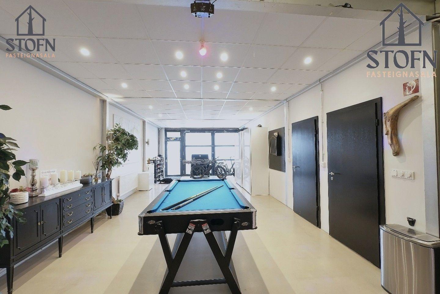 Neðri hæð – 135 fm Sérinngangur með holi og fataskáp Opið rými með eldhúsaðstöðu og borðplássi. Stórt rými sem nýtist m.a. fyrir samveru, fundi eða skrifstofustarf. Tvö salerni – annað með aðstöðu fyrir ræstingu og möguleika á sturtu. Þriggja metra lofthæð sem gefur góða rýmis- og birtuskynjun. Gott geymslurými með aðgangi að sameiginlegum neyðarútgangi.