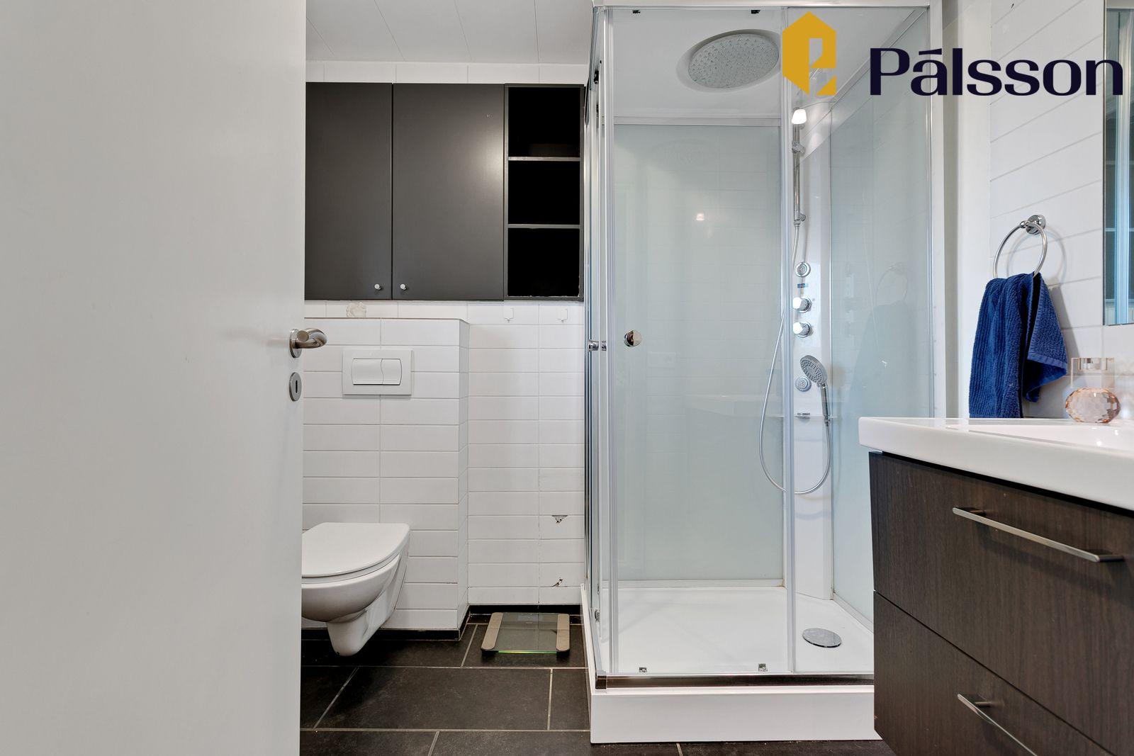 baðherbergi sem er flísalagt hátt og lágt. Útbúið nýlegum sturtuklefa, innfelldum skápum og hillum. Vaskinnrétting er með góðu skúffuplássi. Salerni er upphengt og tengi er fyrir bæði þvottavél og þurrkara.