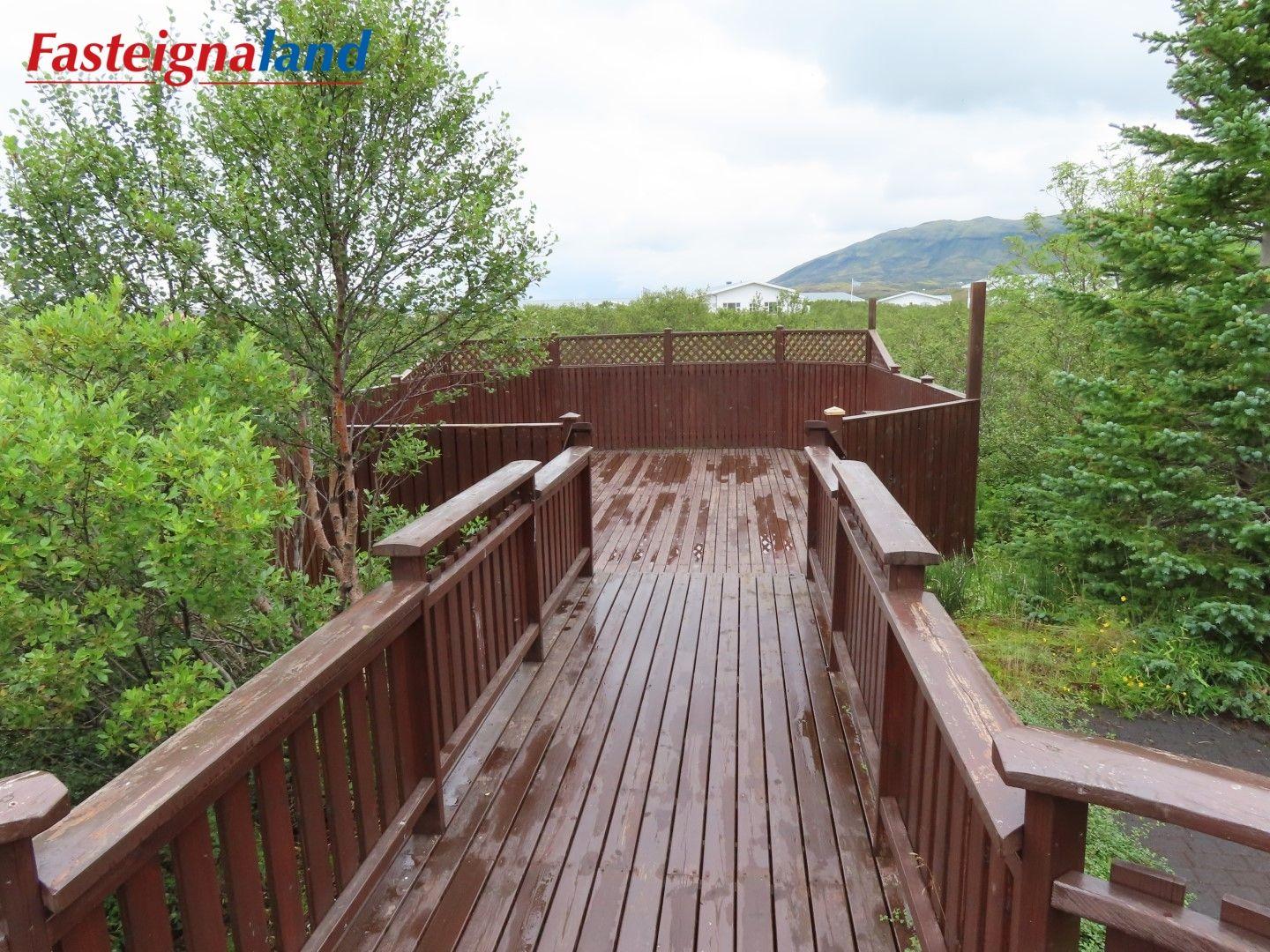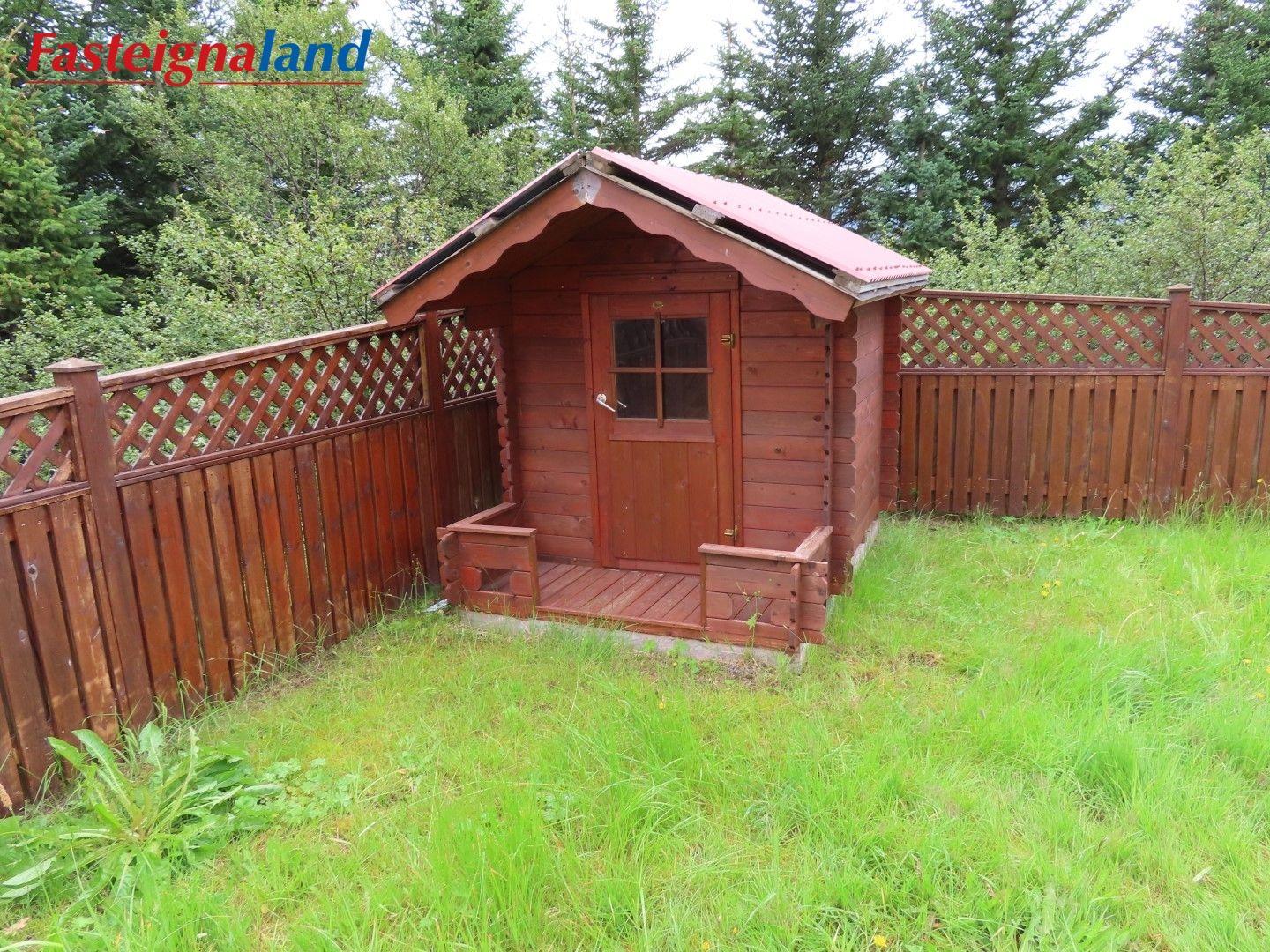 Stórir og miklir sólpallar með girðingu og skjólgirðingu. Á lóðinni er tjörn og lítið dúkkuhús ca. 3 fm (bjálki).